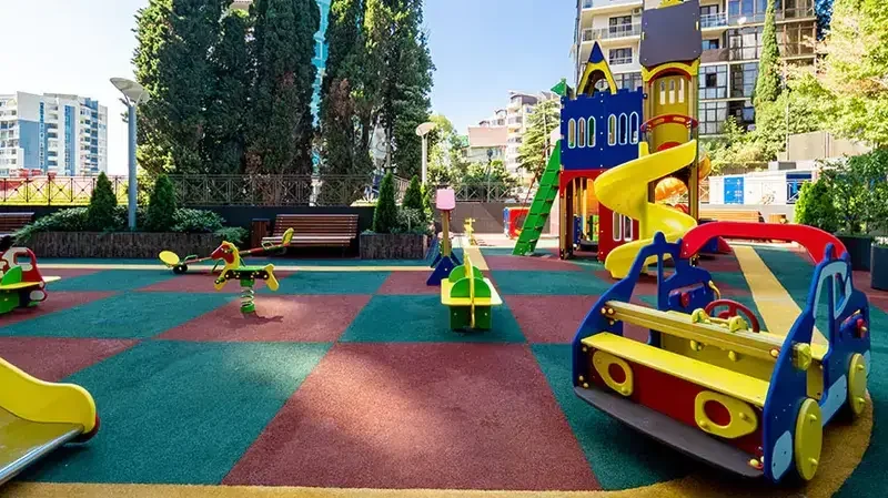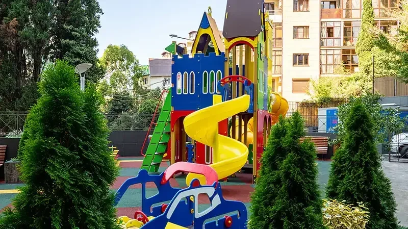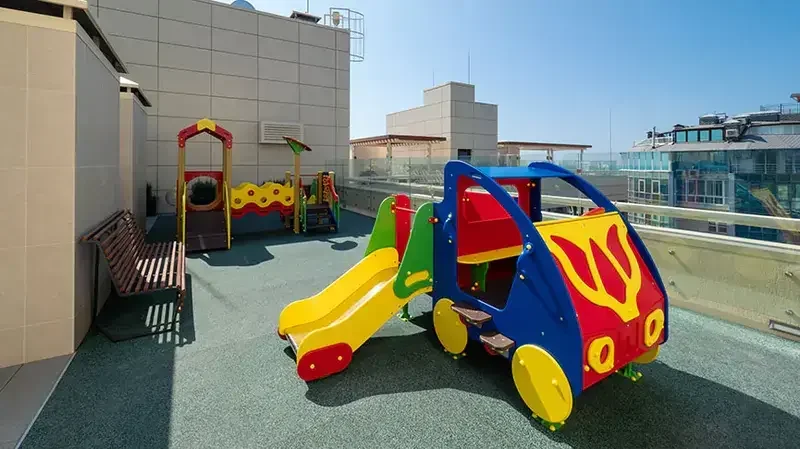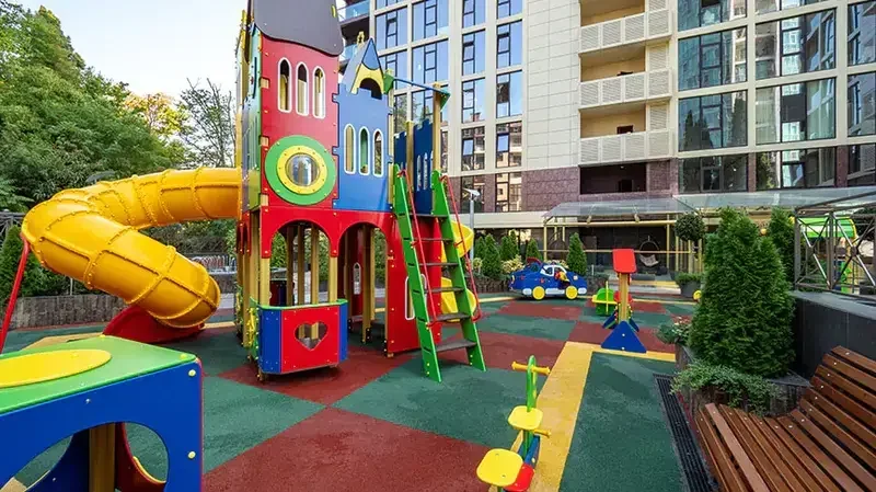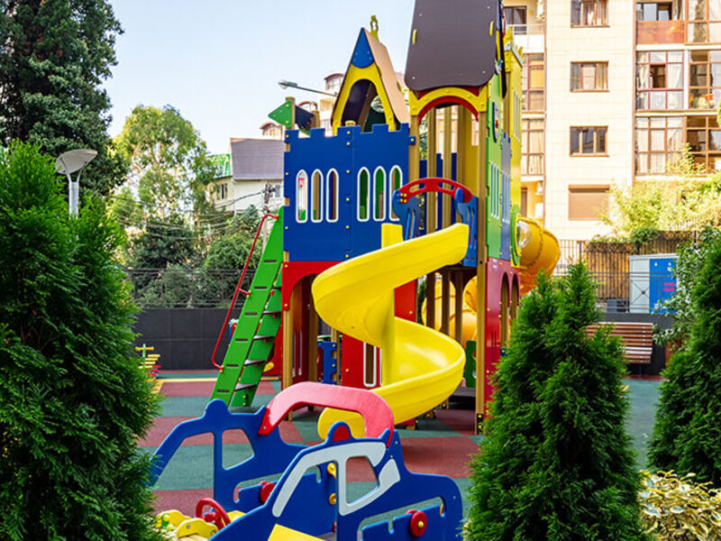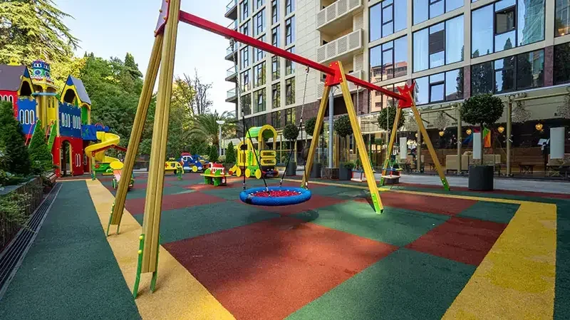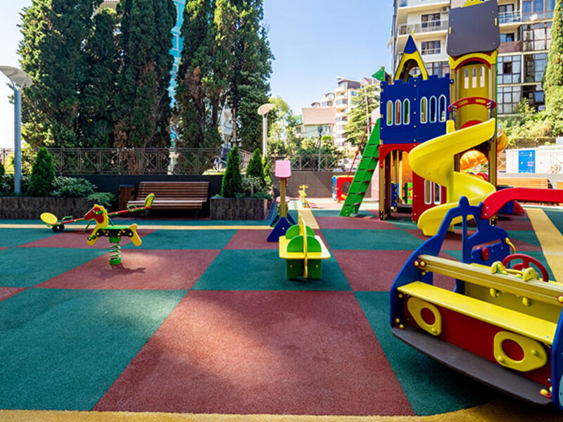 Специально для этого, на территории апартаментов «Метрополь» расположена детская площадка, которая оборудована для детишек всем необходимым.