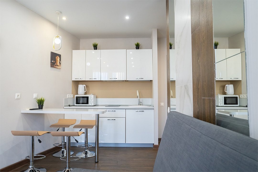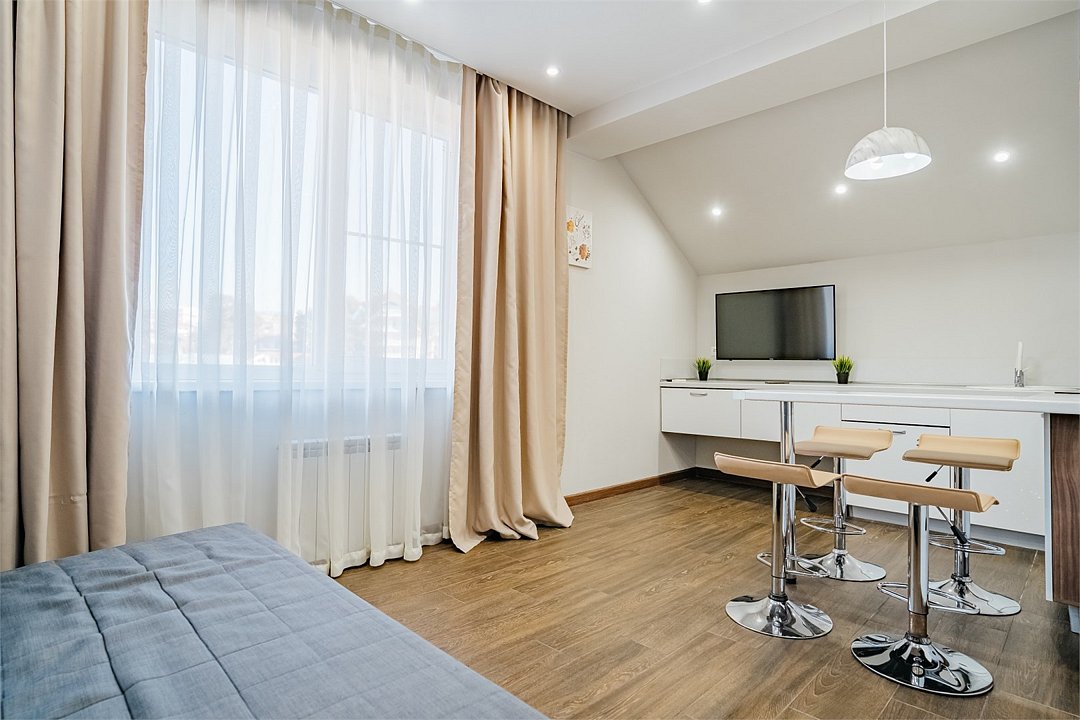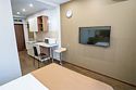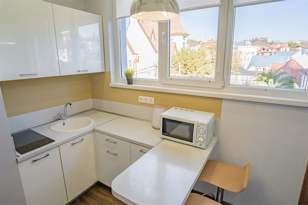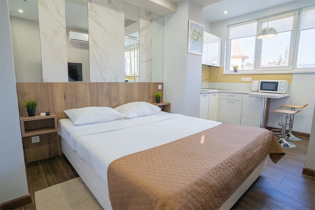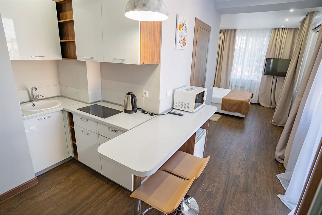 Однокомнатные апартаменты класса "Стандарт" выполнены в спокойных пастельных тонах. Апартаменты оснащены всем необходимым для комфортного отдыха. Рассчитаны на размещение 2-х гостей. Укомплектованы мини-кухней с варочной панелью и микроволновой печью.Услуги и удобства