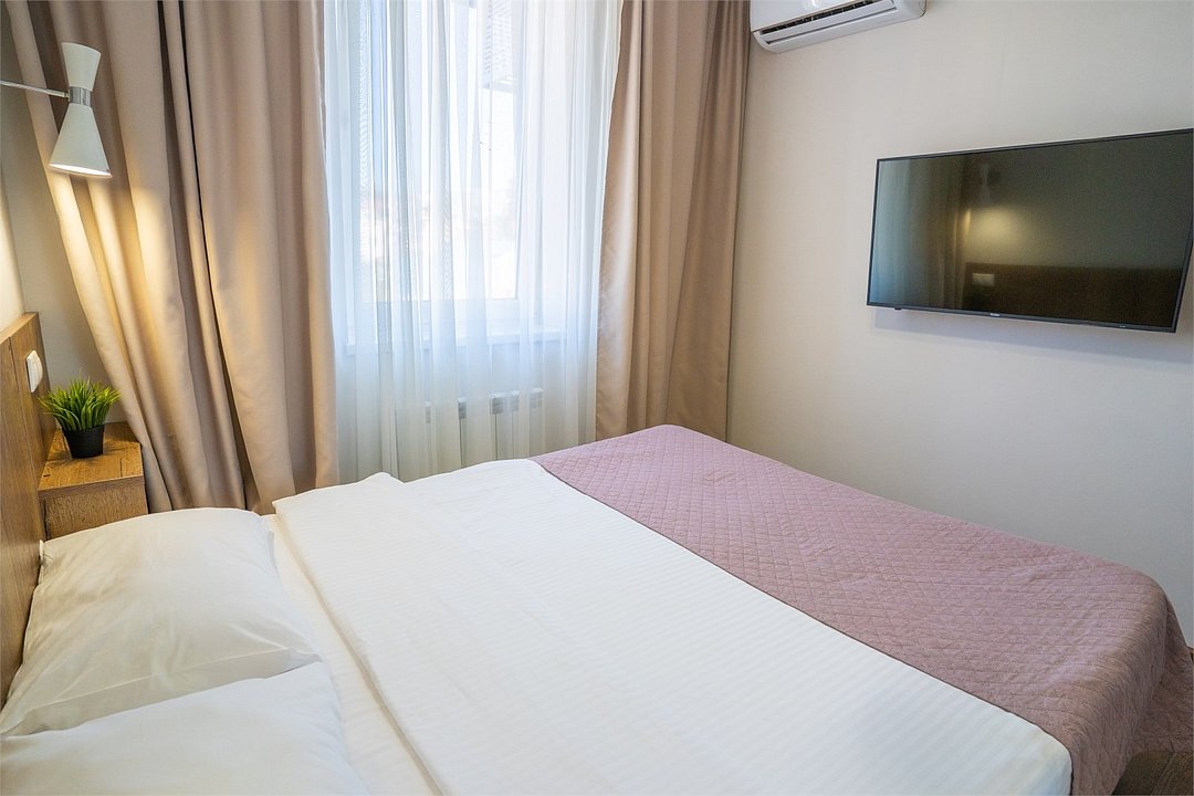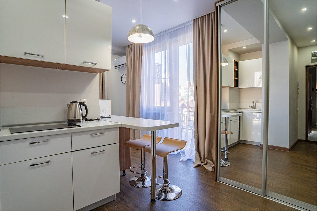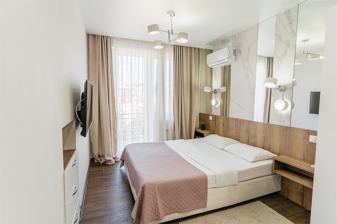 телевизор, Wi-Fi, кондиционер, светильник, фен, плита для приготовления пищи, микроволновая печь, душевая кабина, санузел, банные полотенца, тапочки, гигиенические средства, косметические средства, двуспальная кровать, вешалки, кухня, раковина, вид на город, вид во двор, кухонная посуда, туалетные средства, мини-холодильник, шкаф-купе, номер для некурящих, чайная станция, уборка номера, можно с питомцами, тропический душВ гостиничном номере