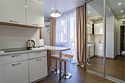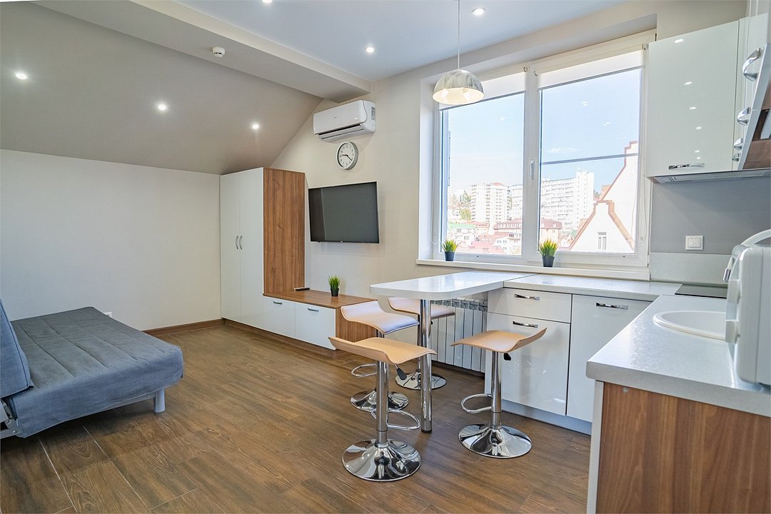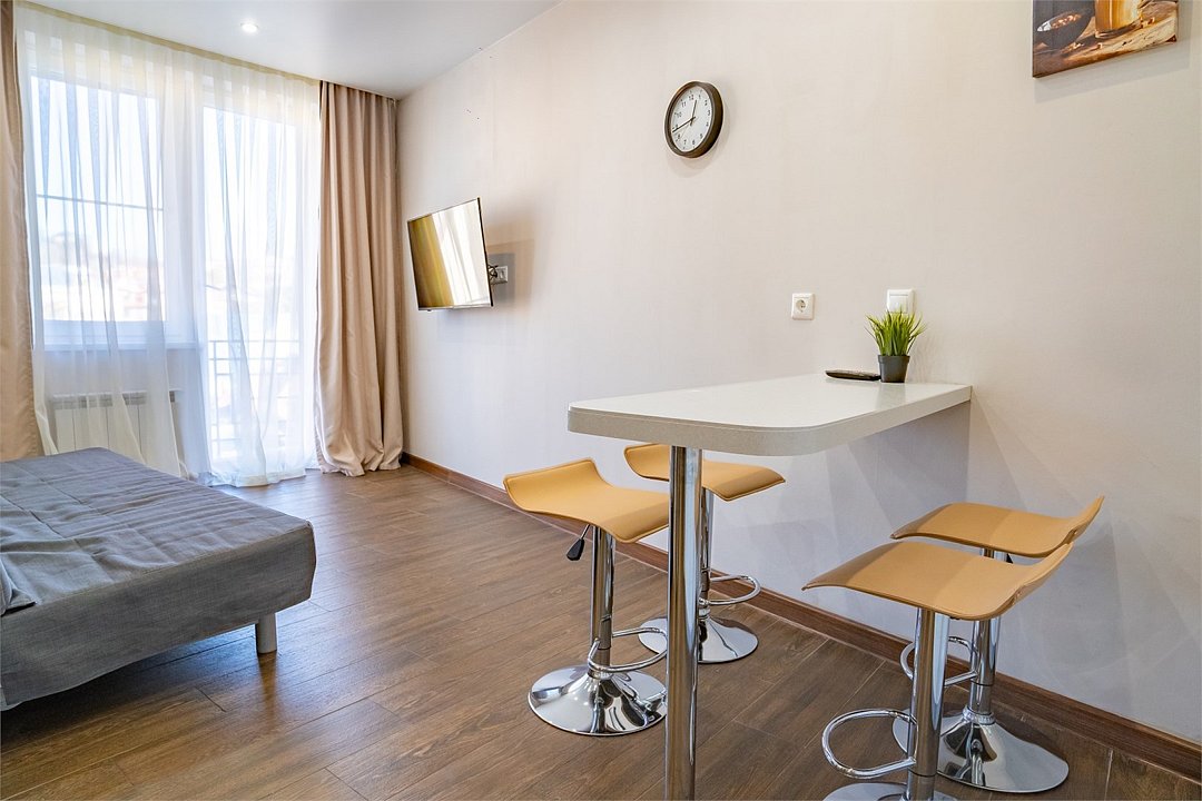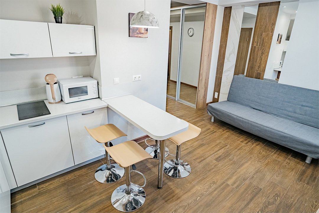 два телевизора, Wi-Fi, кондиционер, плита для приготовления пищи, микроволновая печь, душевая кабина, балкон, двуспальная кровать, диван, тумбы, стулья, вешалки, барная стойка, зеркало, раковина, туалетные средства, туалет, раскладной диван, мини-холодильник, мини-кухня, шкаф-купе, двуспальный раскладной диван-кровать, бутилированная вода, можно с питомцамиВ апартаментах