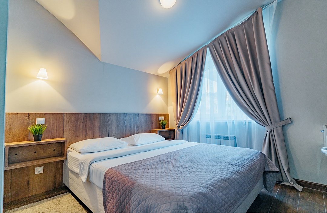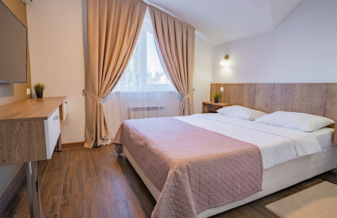Пятиэтажный корпус отеля разместился на пересечении переулка Рахманинова и улицы Пирогова. Для отдыхающих гостиница предлагает номера Стандарт, Студия. Люкс, Апартаменты. В светлых номерах со стильным современный интерьером есть все необходимое для комфортного проживания. В каждой комнате установлена сплит-система, есть телевизор, холодильник, электрочайник. В большинстве номеров предусмотрены меблированные балконы.