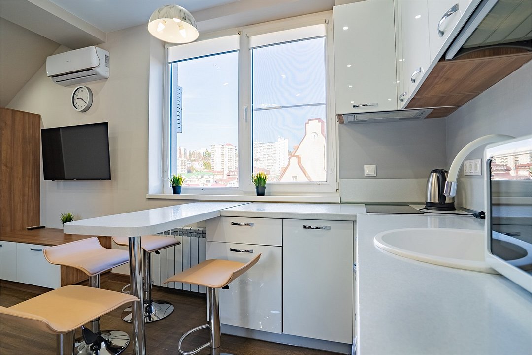 телевизор, Wi-Fi, кондиционер, светильник, фен, плита для приготовления пищи, микроволновая печь, душевая кабина, санузел, банные полотенца, тапочки, гигиенические средства, балкон, двуспальная кровать, тумбы, стулья, вешалки, кухня, чайник, раковина, вид на город, кухонная посуда, стол, мини-холодильник, шкаф-купе, номер для некурящих, уборка номера, можно с питомцамиВ гостиничном номере