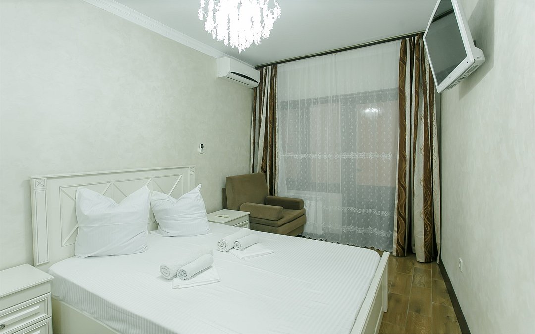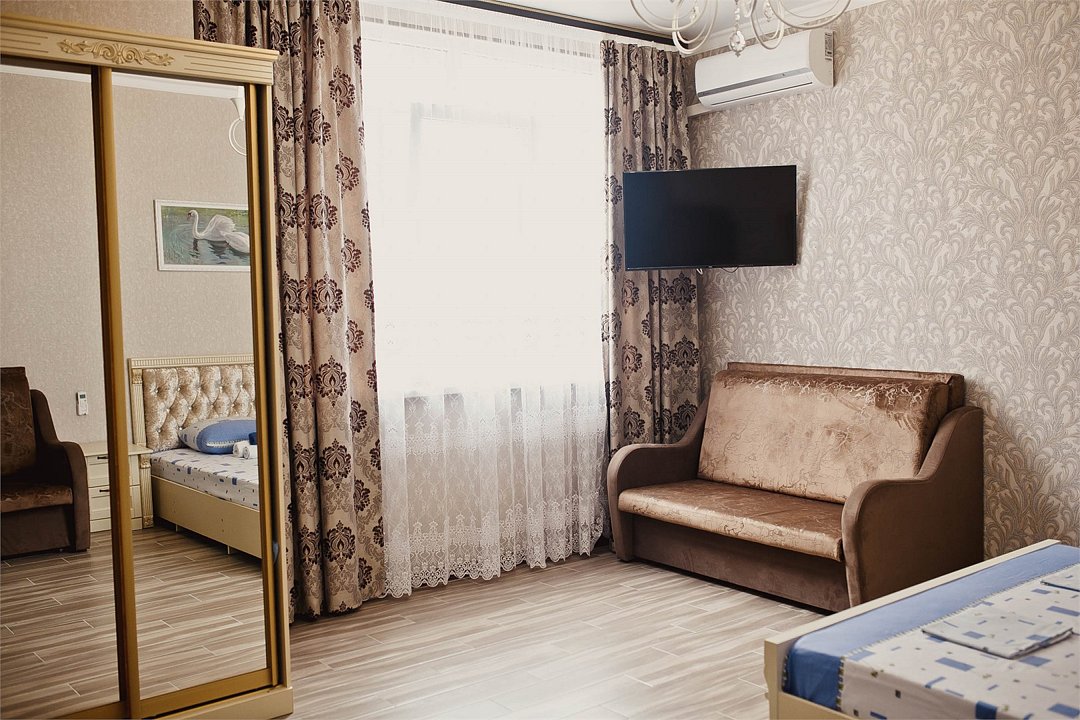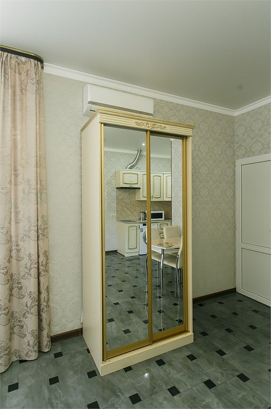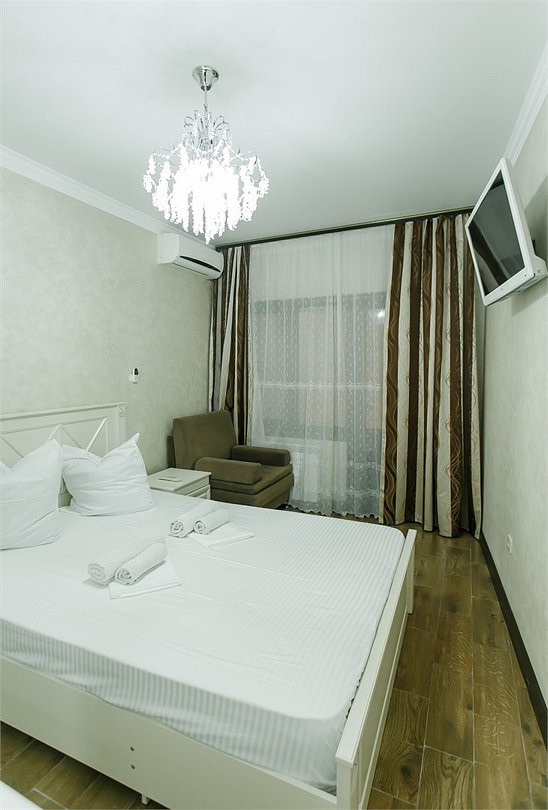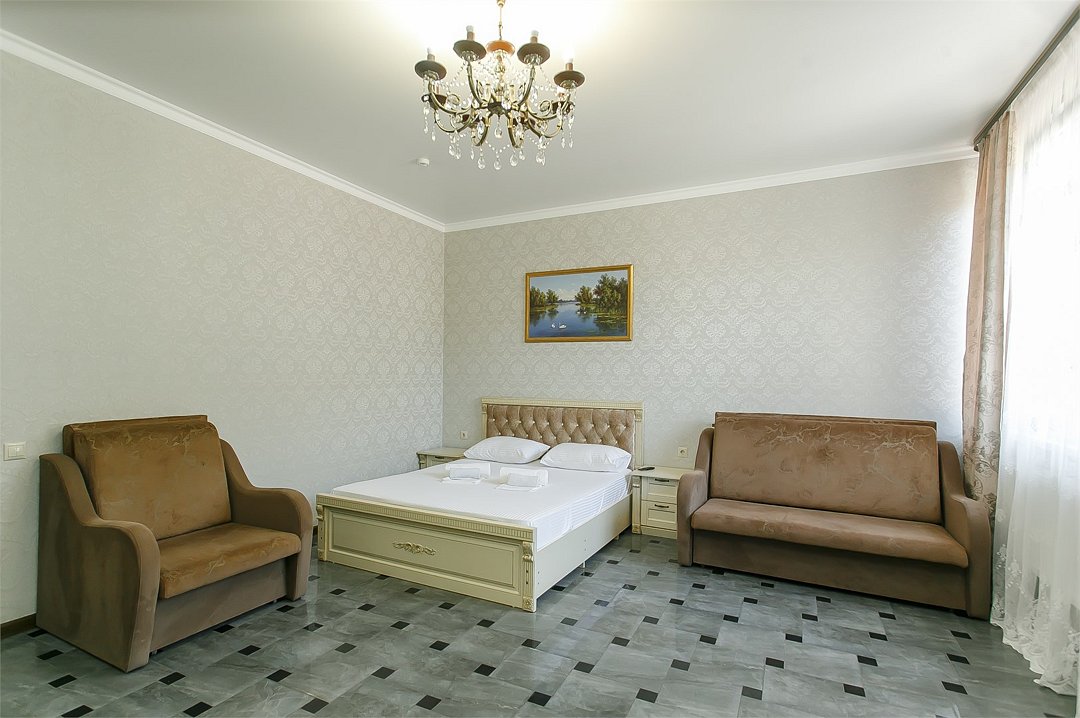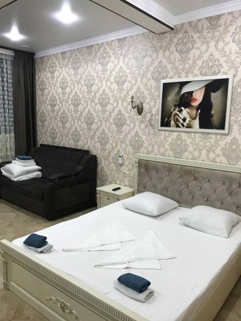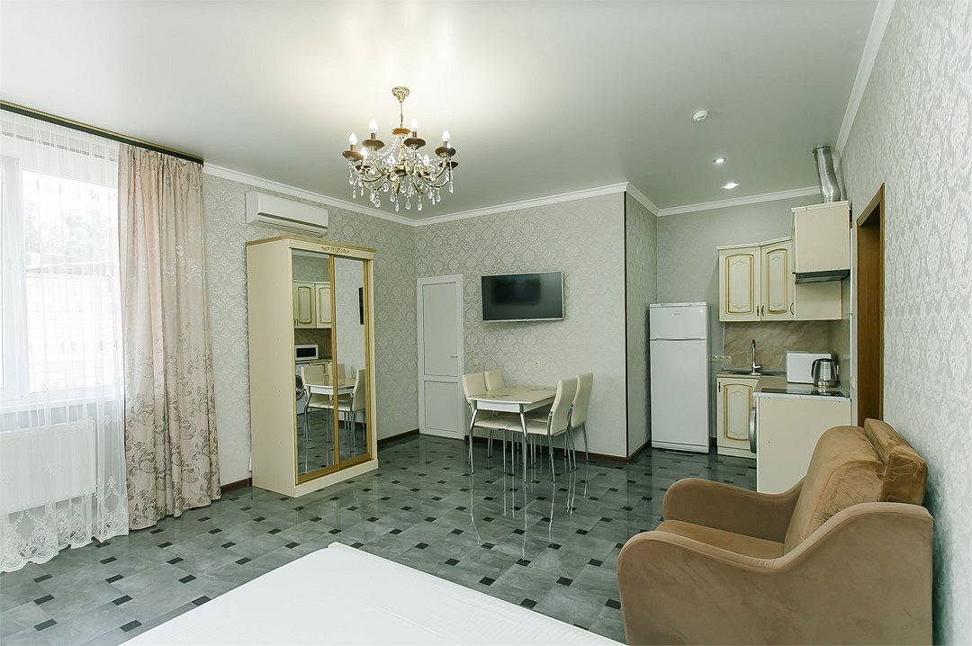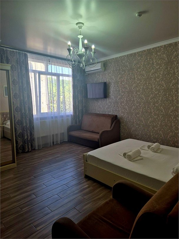 Студийный номер в который входит : санузел , кухня ( посуда , электро плита , чайник , микроволновка , холодильник , стиральная машинка ) , двуспальная кровать , диван ( раскладной на 2 человека ) , кресло (раскладное на 1 человека ) , телевизор , кондиционер .Услуги и удобства