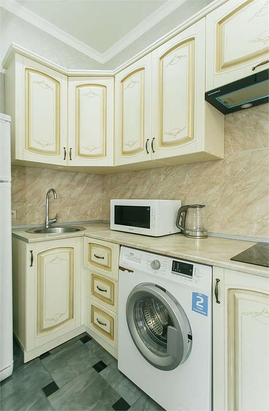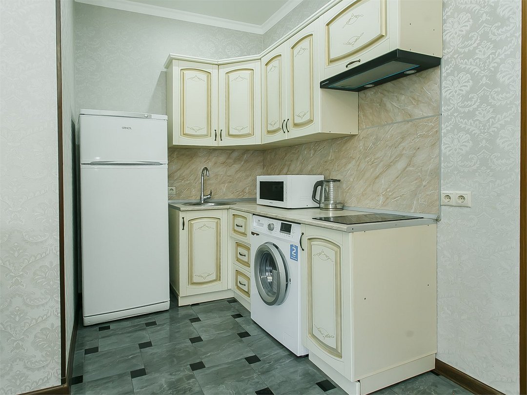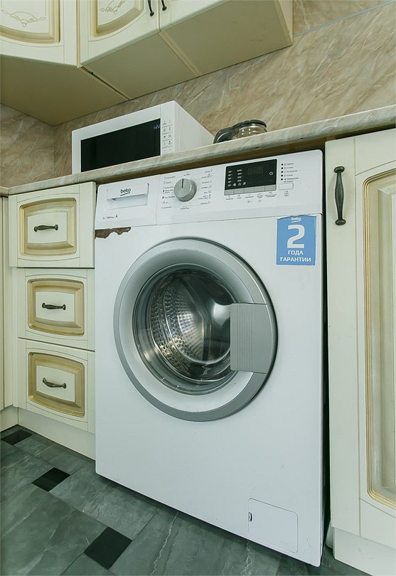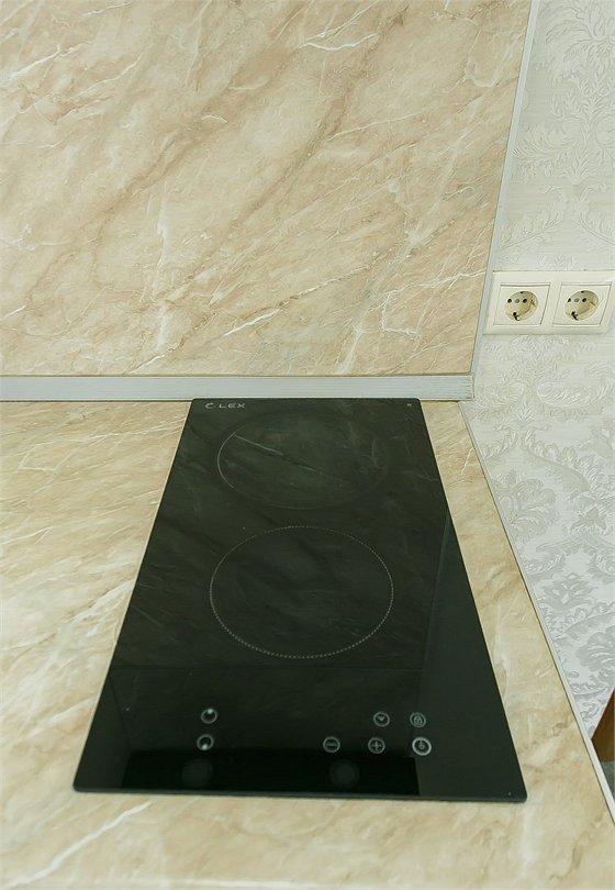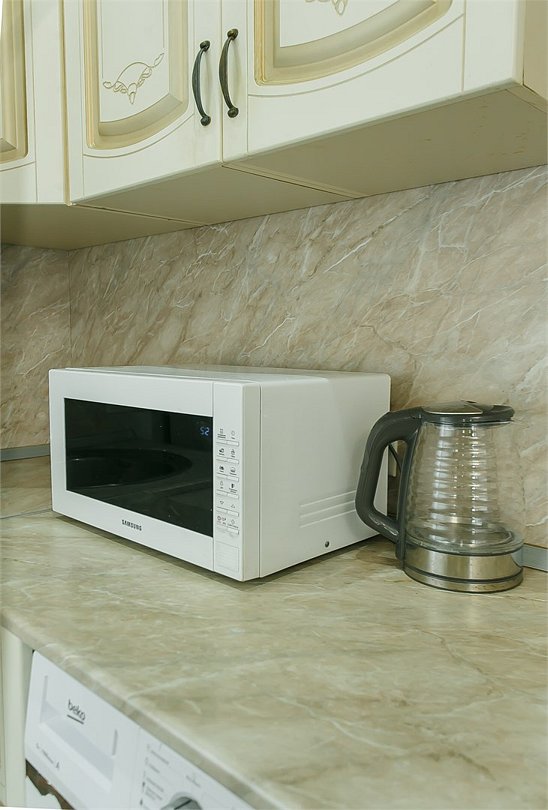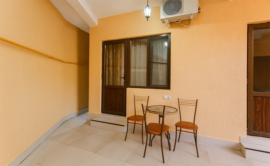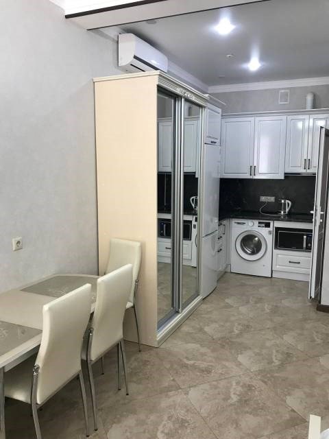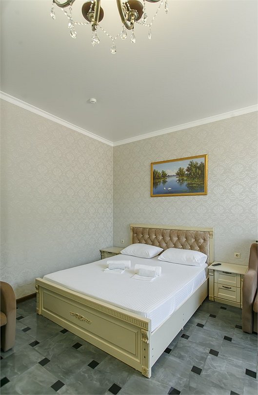 Студийный номер в который входит : санузел , кухня ( посуда , электро плита , чайник , микроволновка , холодильник , стиральная машинка ) , двуспальная кровать , диван ( раскладной на 2 человека ) , кресло (раскладное на 1 человека ) , телевизор , кондиционер .Услуги и удобства