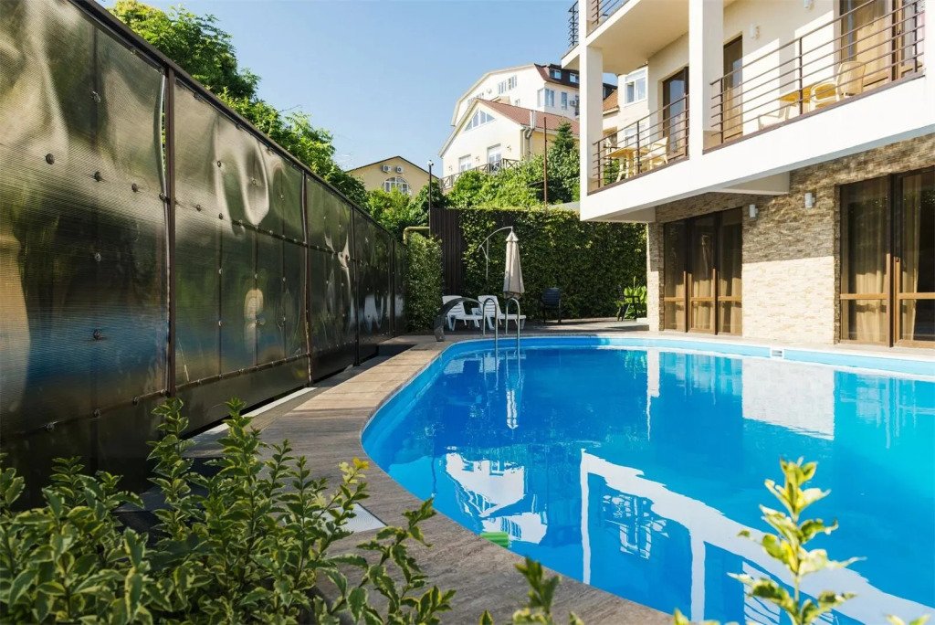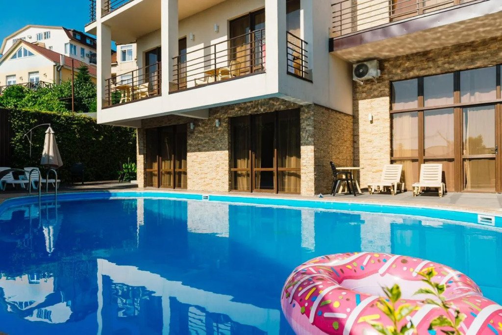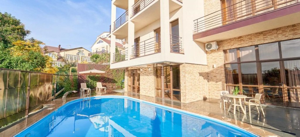 - С бассейном и собственным пляжем