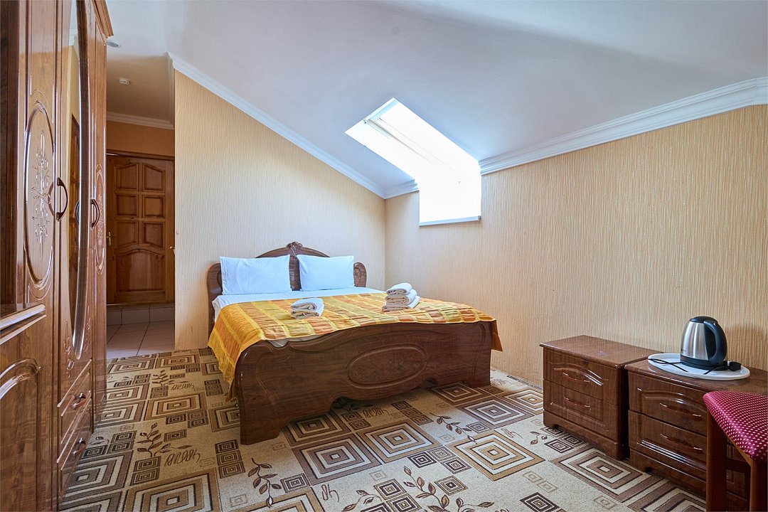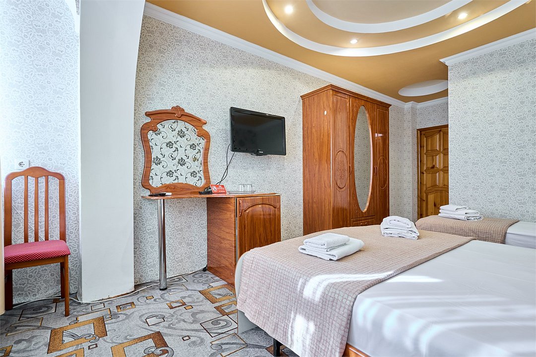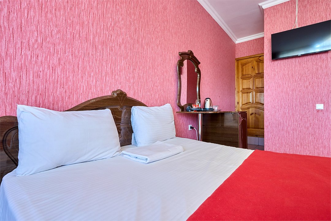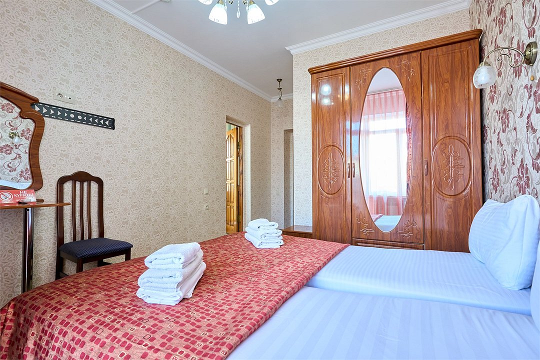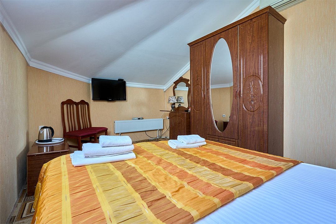 Стандартный номер, оборудован всем необходимым для комфортного пребывания гостей. Номер оснащен удобной двуспальной кроватью и одной односпальной кроватью, В каждом номере чайник ,фен, прикроватными тумбочками, пуфами, столиком, сплит системой.Услуги и удобства