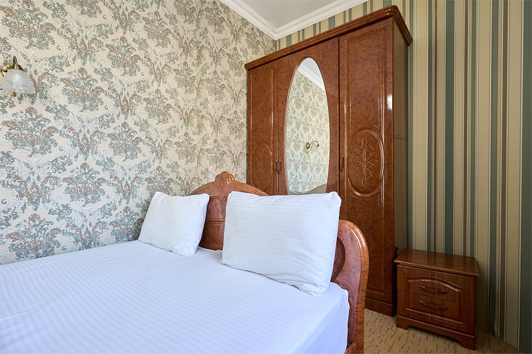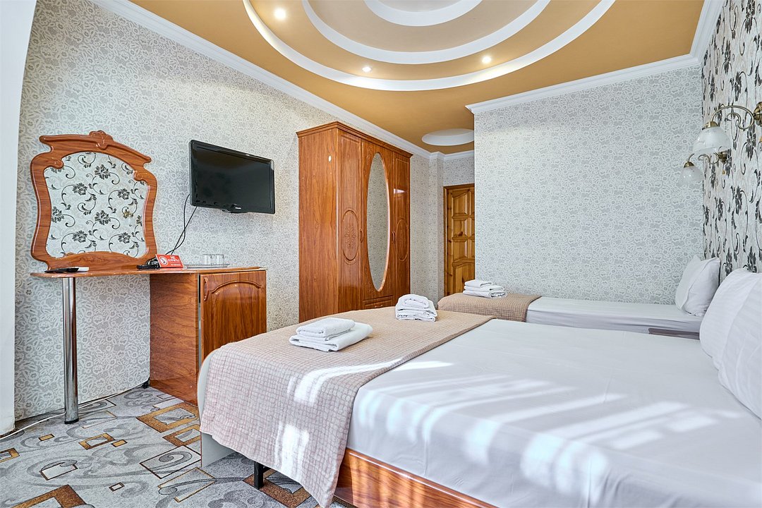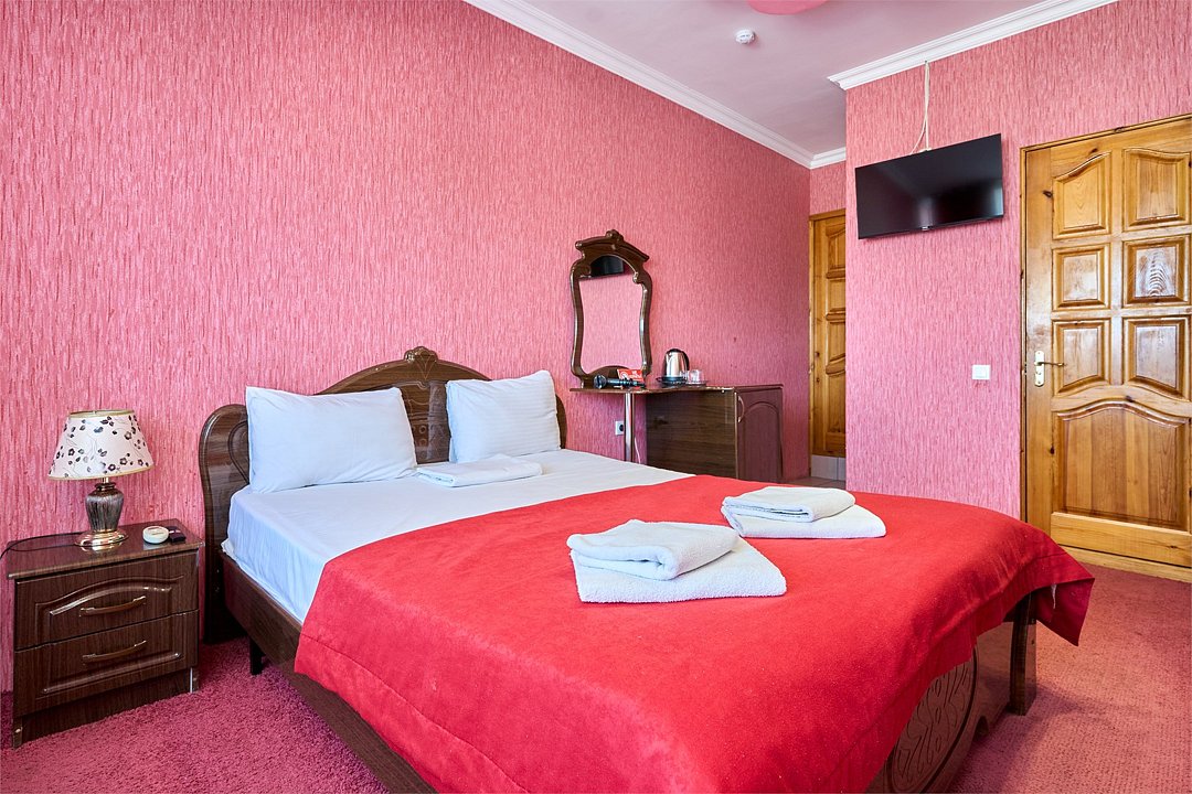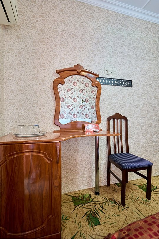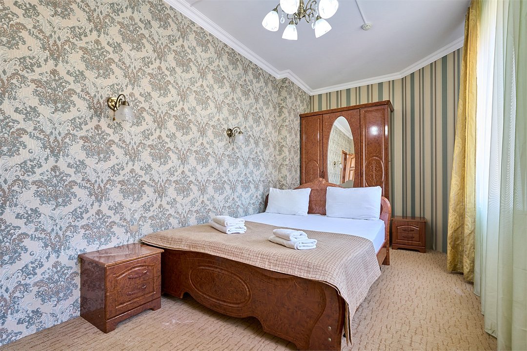 Стандартный номер, оборудован всем необходимым для комфортного пребывания гостей. Номер оснащен удобной двуспальной кроватью и одной односпальной кроватью, В каждом номере чайник ,фен, прикроватными тумбочками, пуфами, столиком, сплит системой.Услуги и удобства
