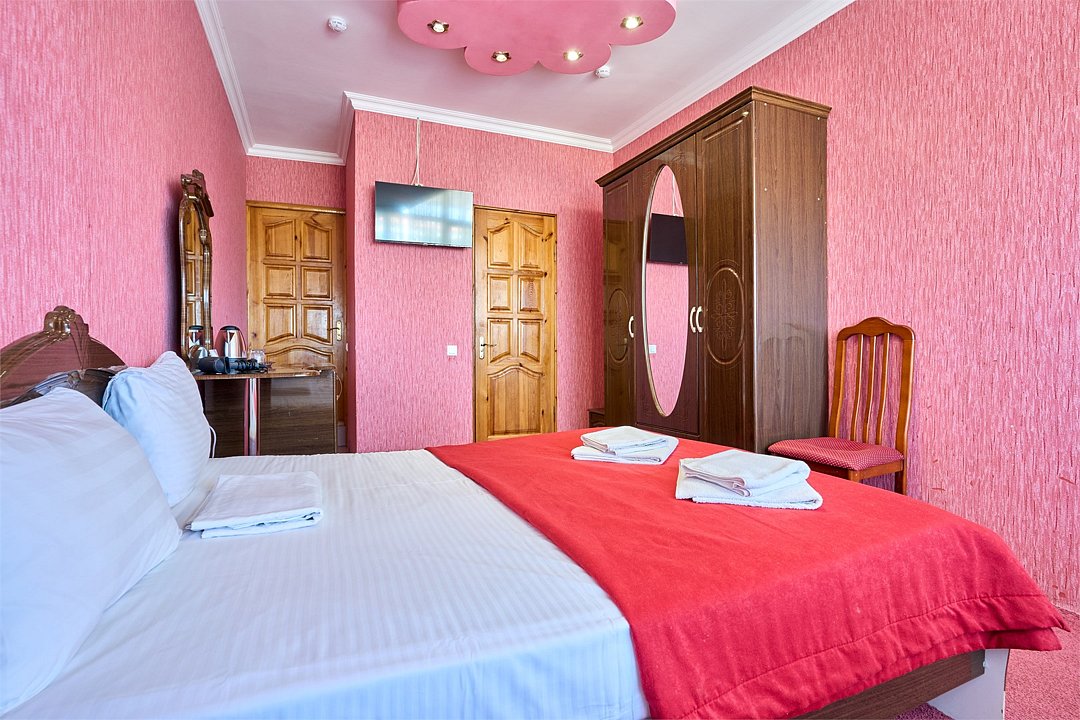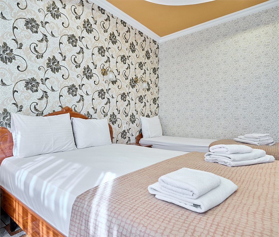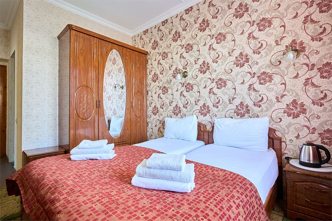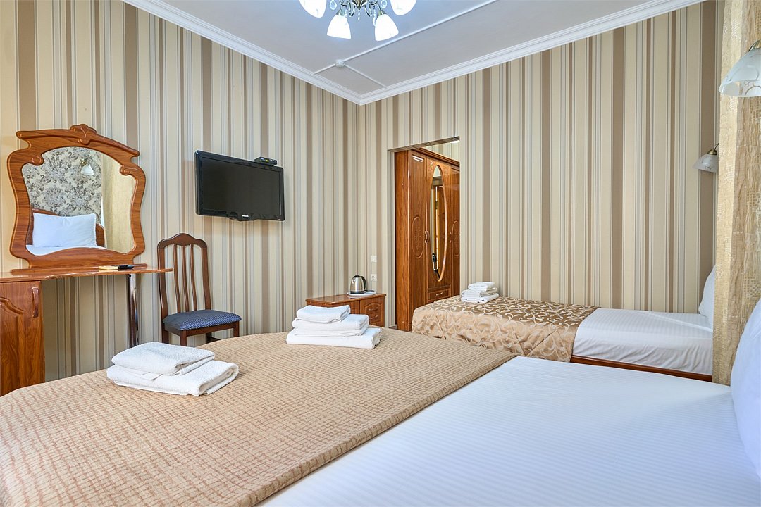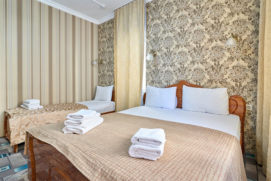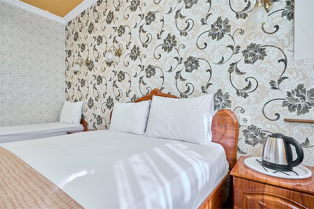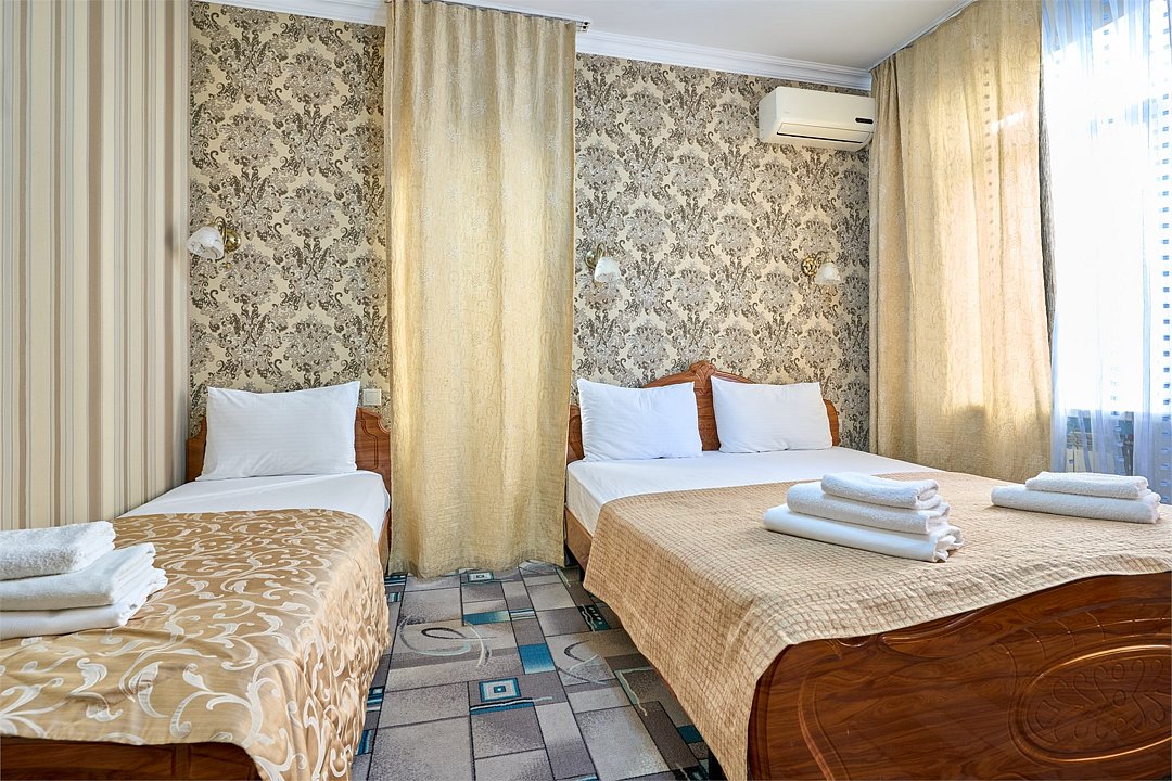 Стандартный номер, оборудован всем необходимым для комфортного пребывания гостей. Номер оснащен удобной двуспальной кроватью и двумя односпальными кроватями, прикроватными тумбочками, пуфами, столиком, сплит системой. В каждом номере чайник ,фен.Услуги и удобства