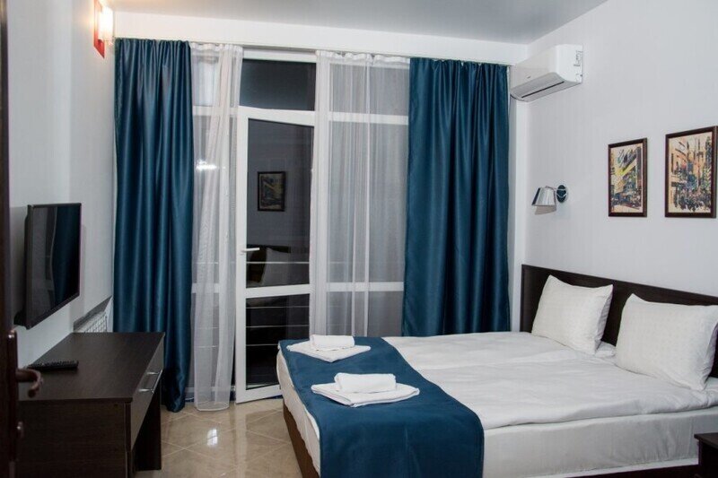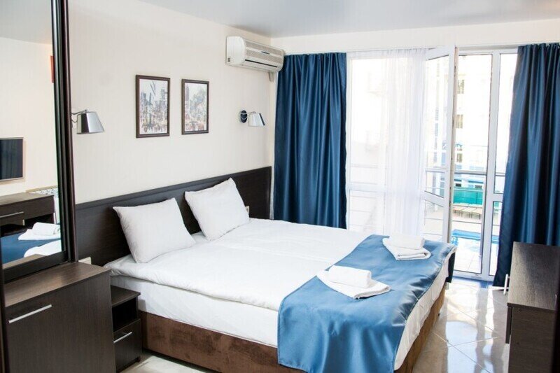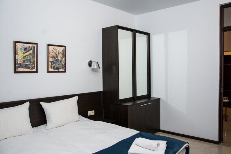 Оснащение номера: двуспальная кровать, балкон, ванная комната, ЖК - телевизор, кондиционер, холодильник, фен, туалетные принадлежности, бесплатный Wi-Fi, два комплекта постельного белья и полотенец, письменный стол, два пуфика, две прикроватные тумбочки, шкаф для одежды.