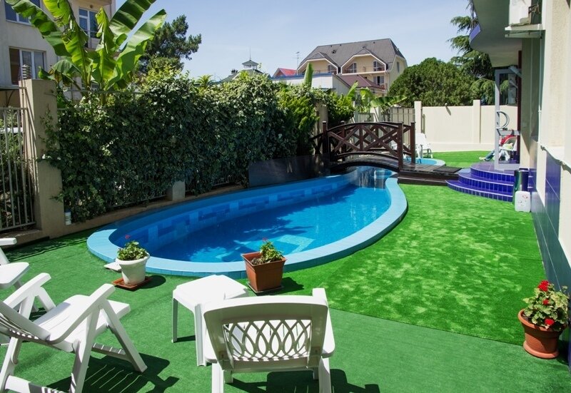 Оснащение уличной зоны: бассейн, лежаки, веранда.