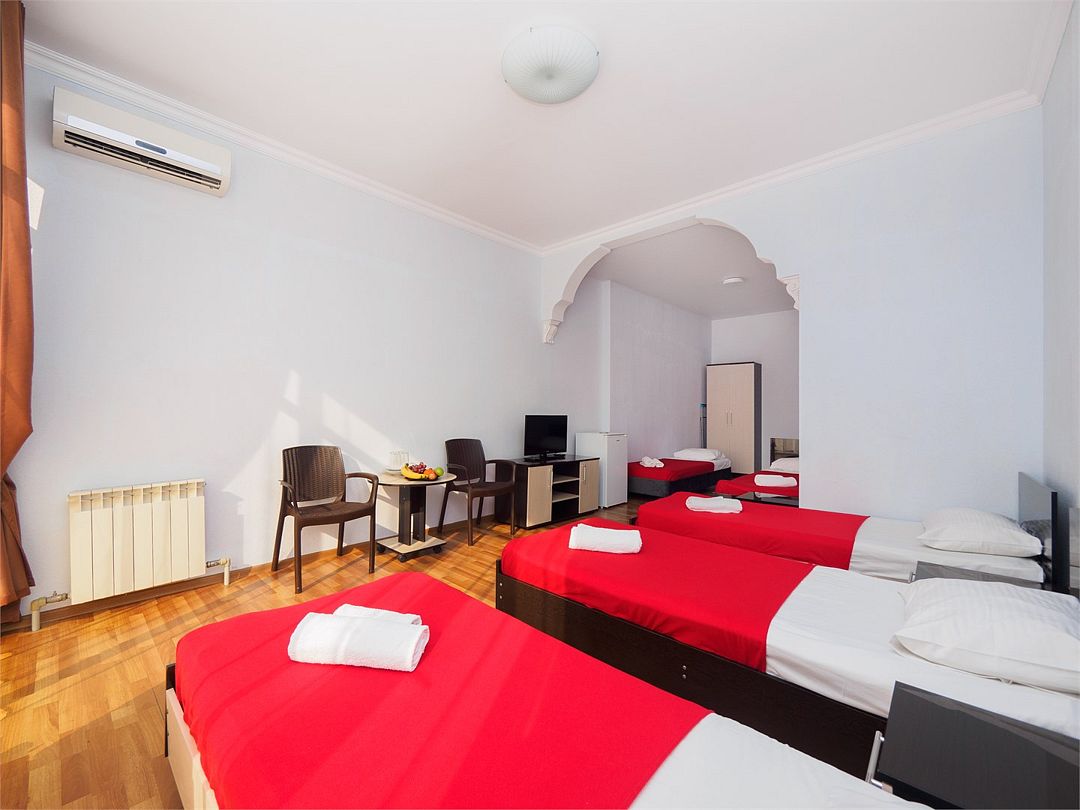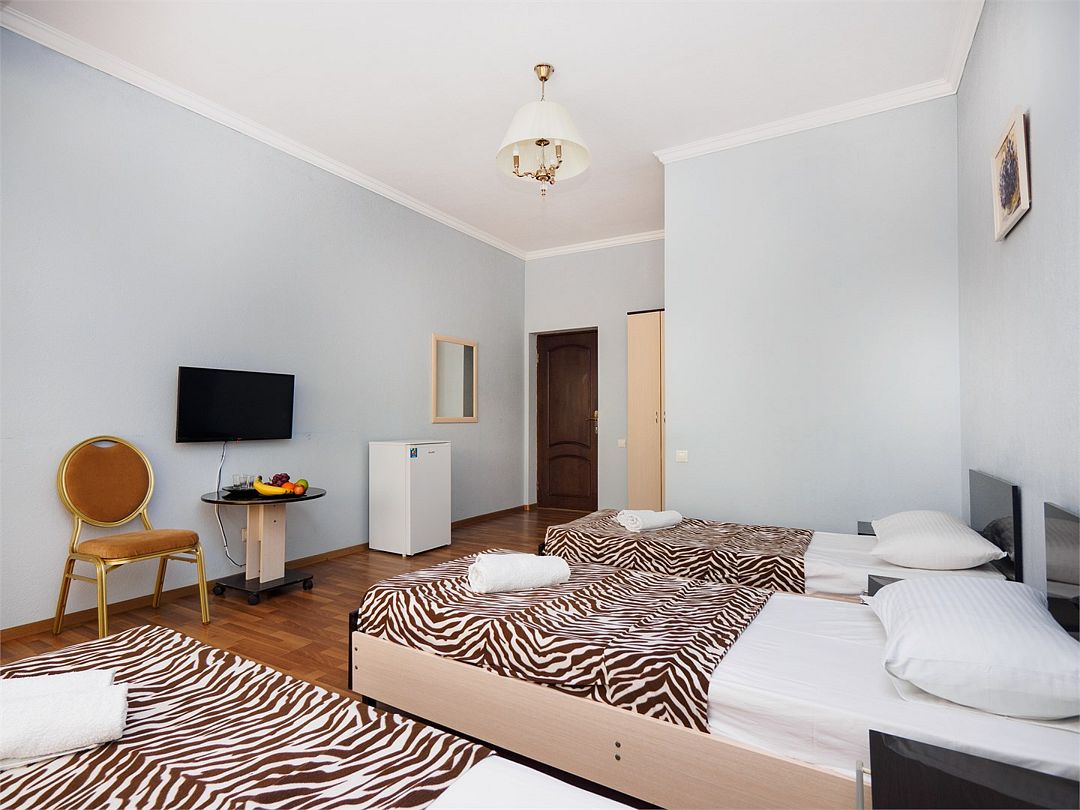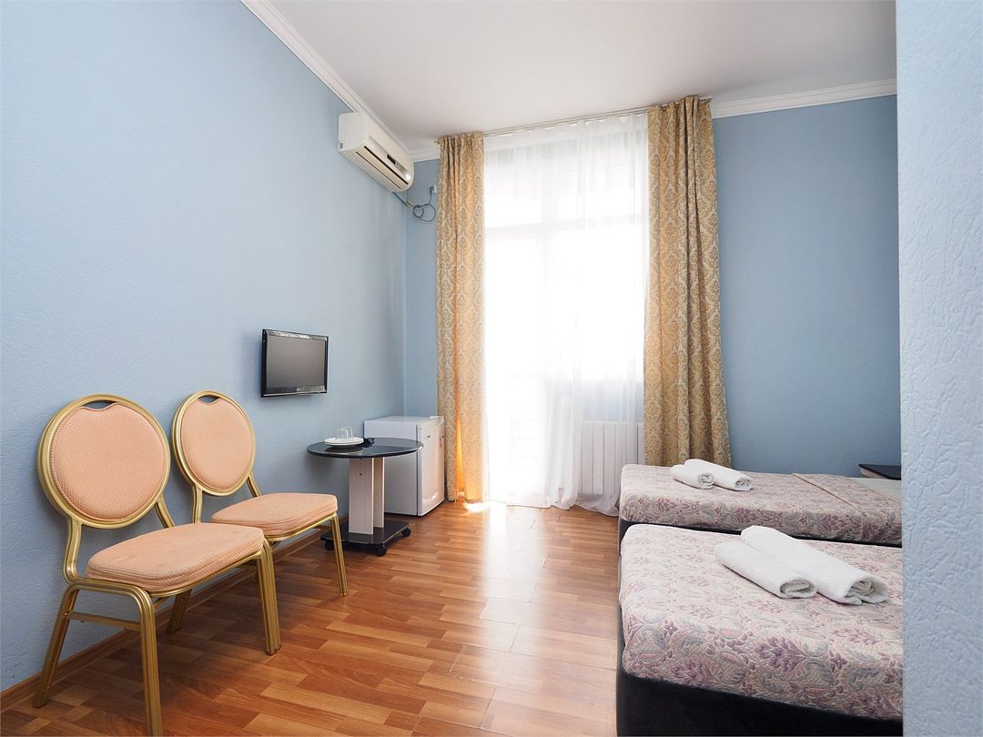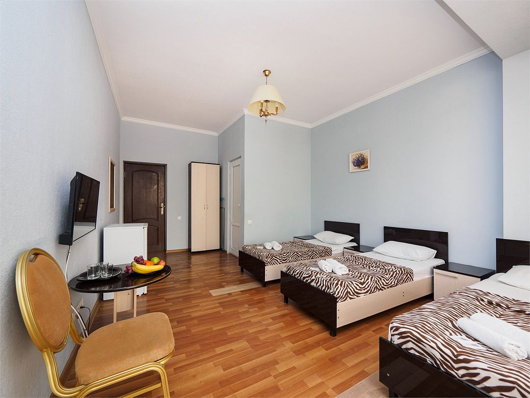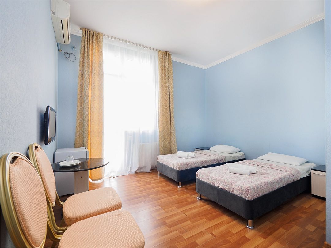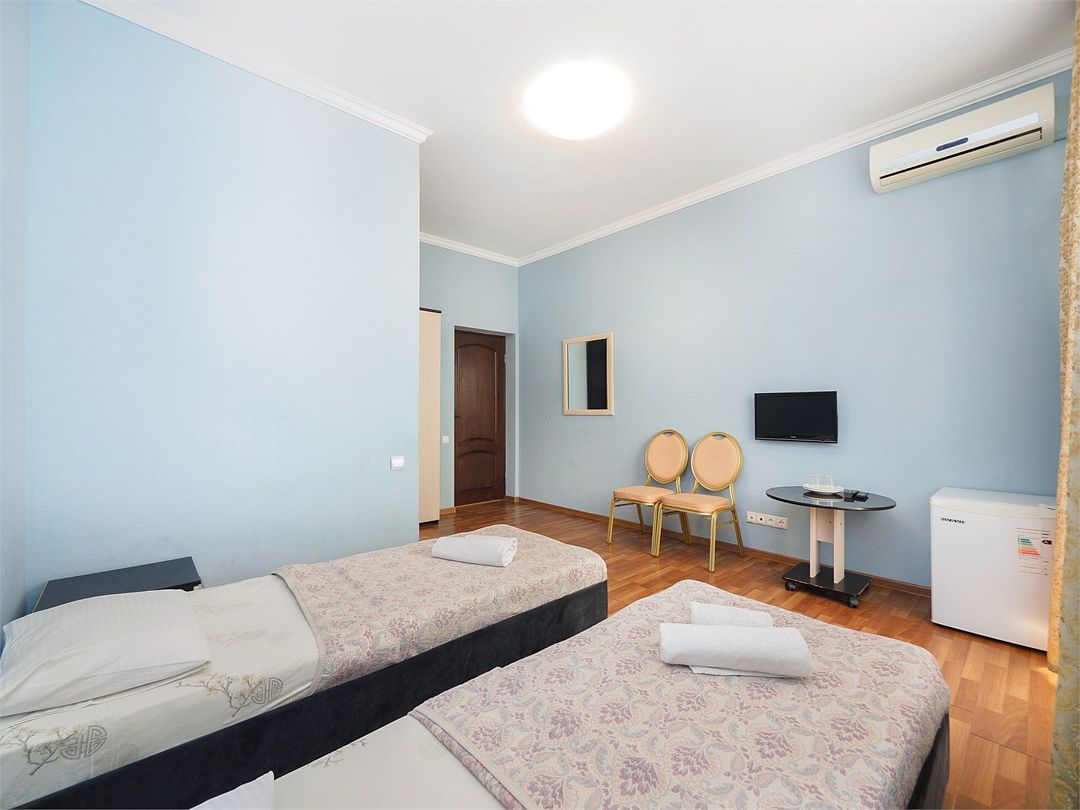 Уютные номера с 3 односпальными кроватями и видом на бассейн или во двор. Оснащение : ТВ, кондиционер, холодильник, шкаф, зеркало, стол, стулья, тумбочки, собственный с/у, интернет, фен по запросу. Бассейн на территории отеля работает в летний период.Услуги и удобства