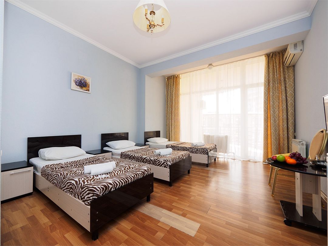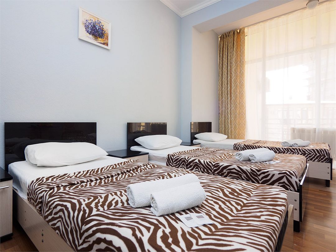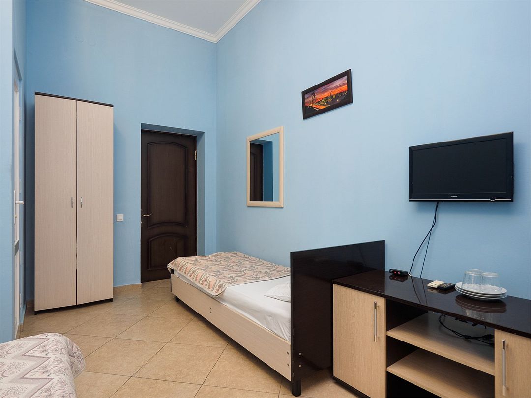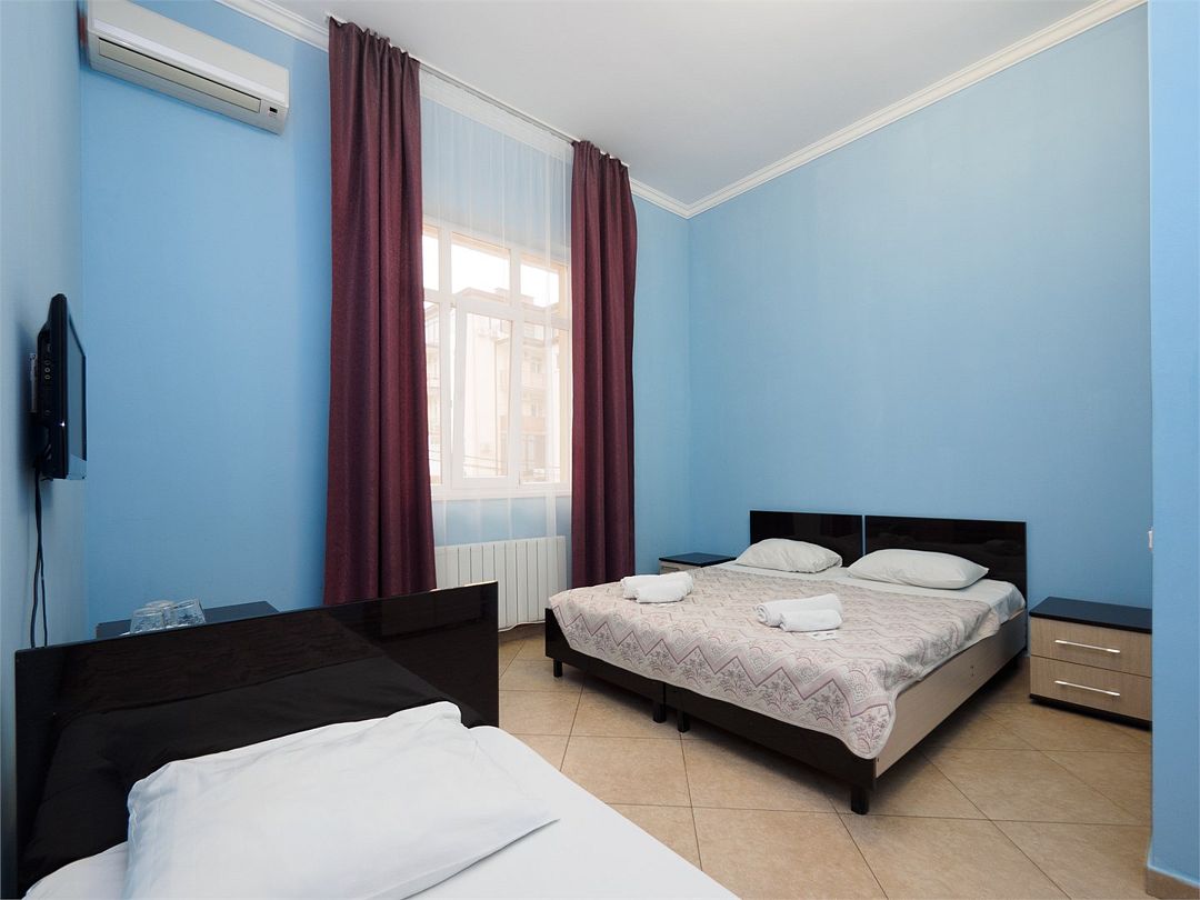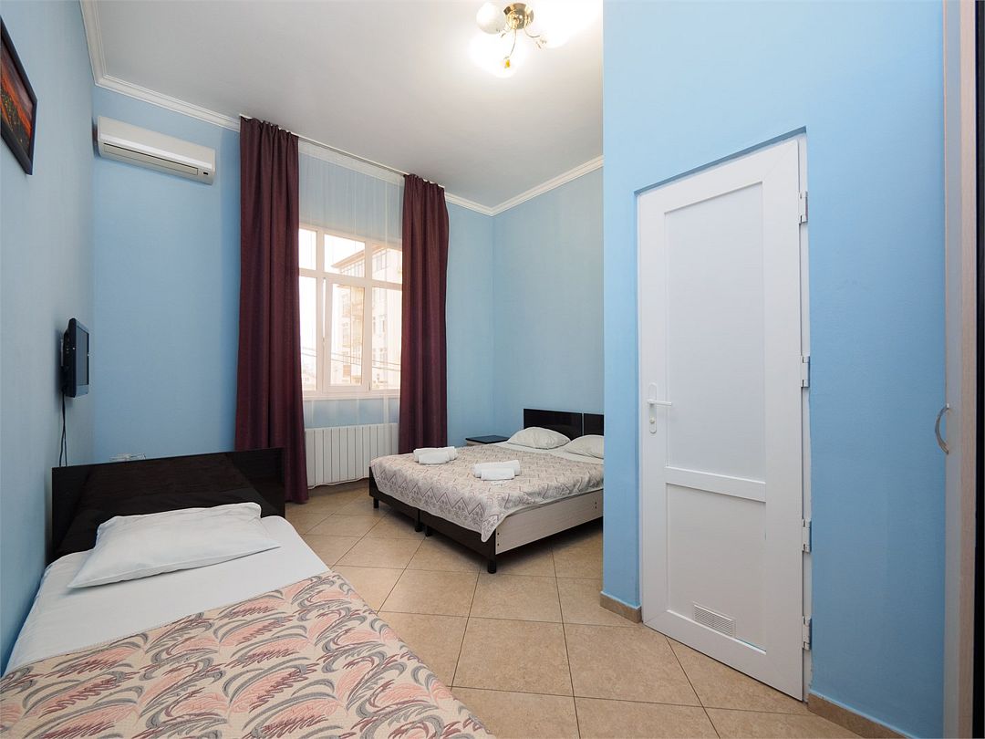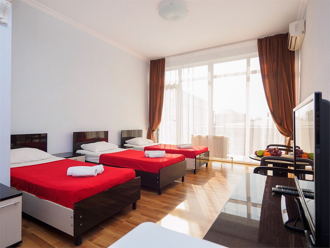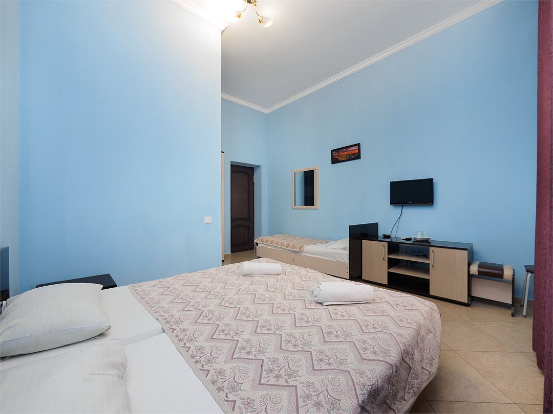 Уютные номера с 3 односпальными кроватями и видом на бассейн или во двор. Оснащение : ТВ, кондиционер, холодильник, шкаф, зеркало, стол, стулья, тумбочки, собственный с/у, интернет, фен по запросу. Бассейн на территории отеля работает в летний период.Услуги и удобства