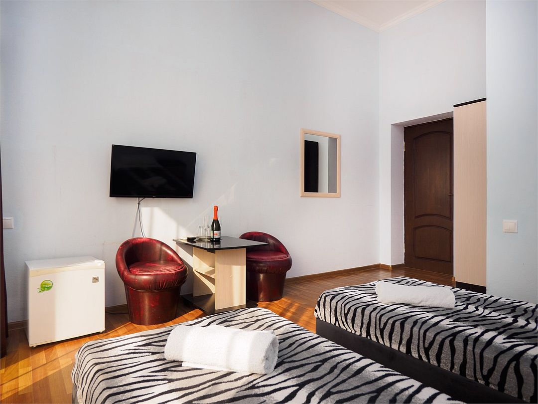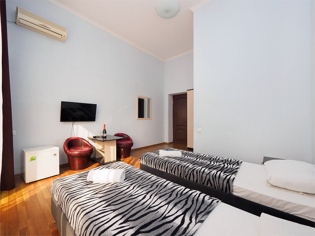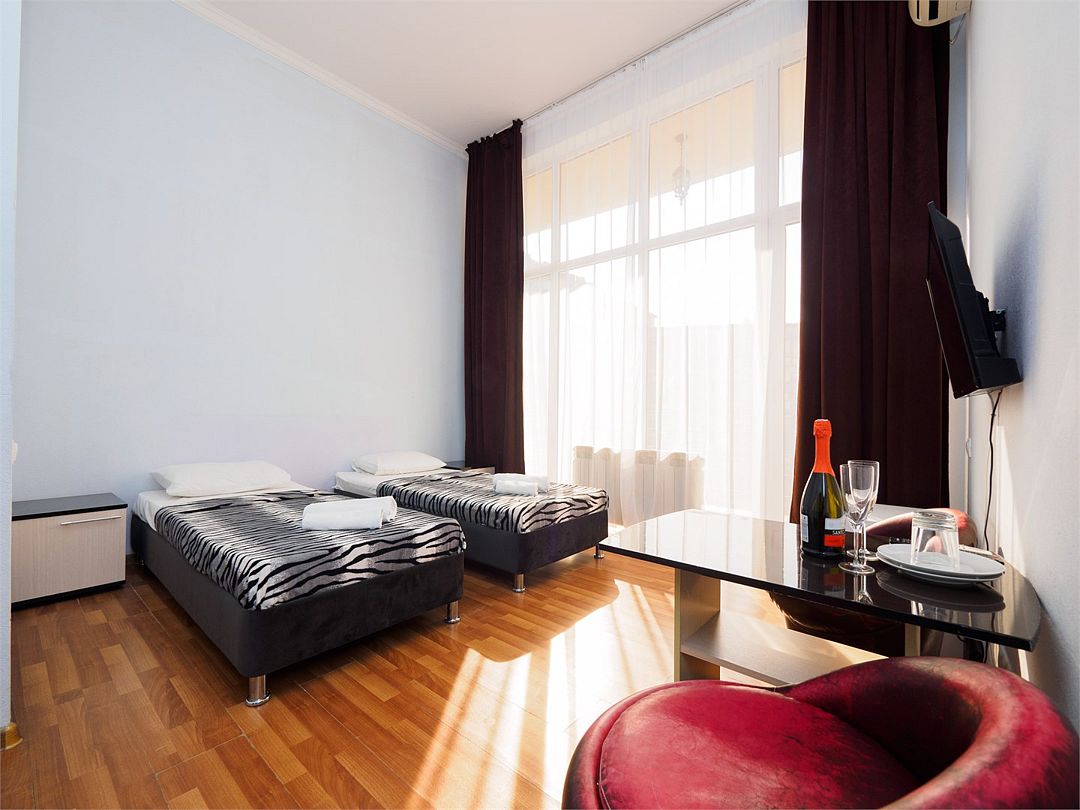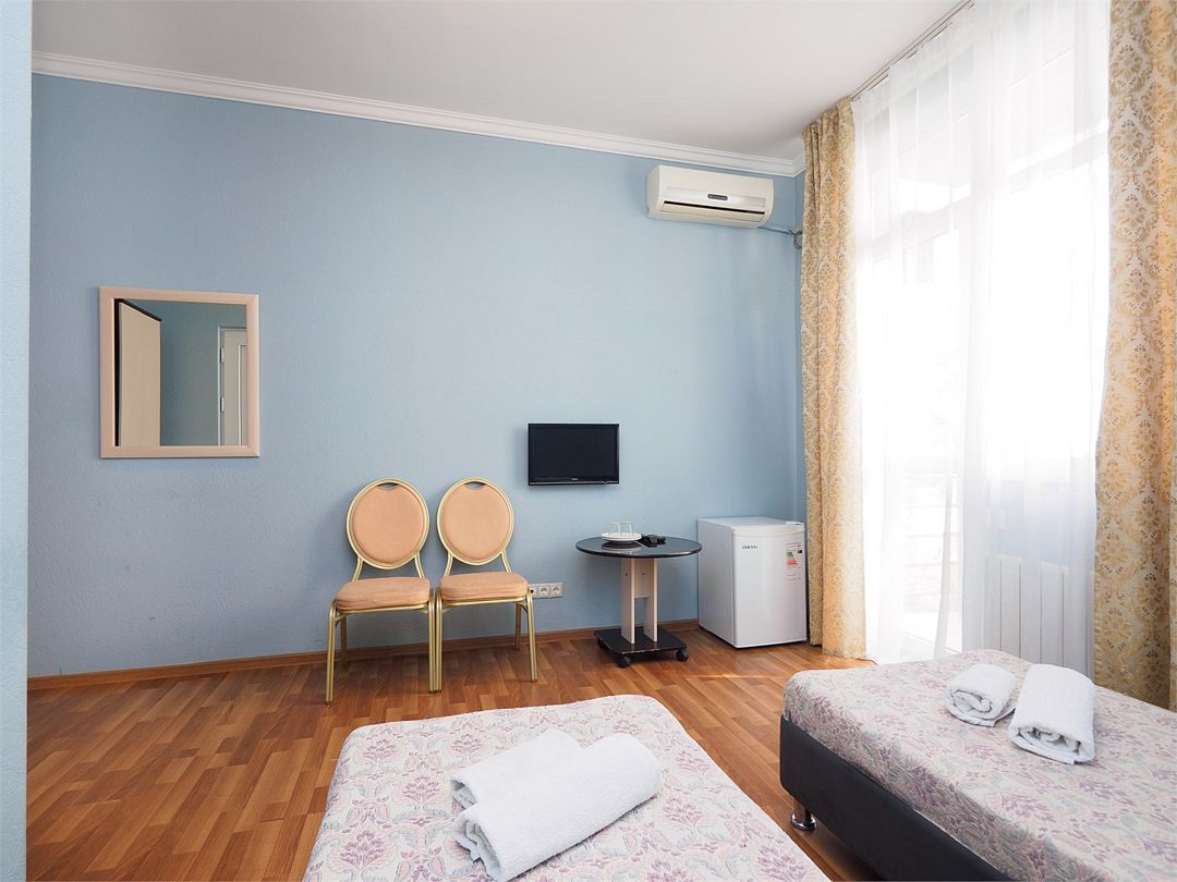 Уютные комфортные номера с балконом с видом во двор и на бассейн. В номере 2 односпальные кровати, который при желании можно совместить в одну. Оснащение : ТВ, кондиционер, холодильник, шкаф, зеркало, стол, стулья, тумбочки, собственный с/у, интернет, фен по запросу. Бассейн на территории отеля работает в летний период.Услуги и удобства