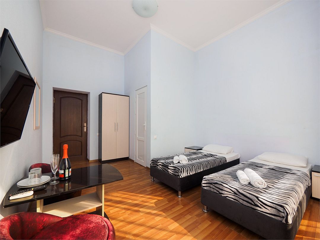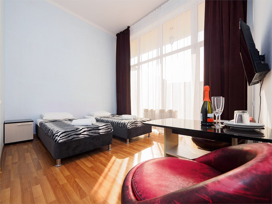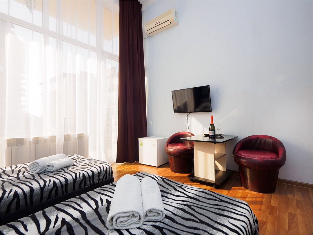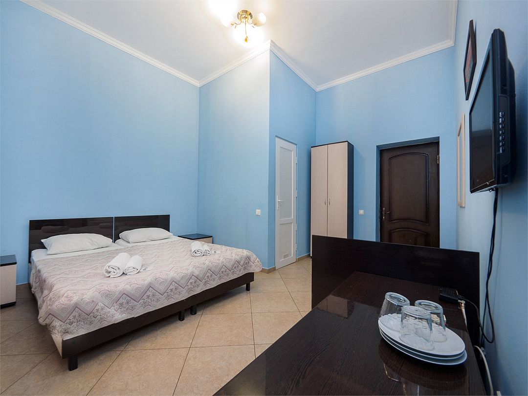 Уютные комфортные номера с балконом с видом во двор и на бассейн. В номере 2 односпальные кровати, который при желании можно совместить в одну. Оснащение : ТВ, кондиционер, холодильник, шкаф, зеркало, стол, стулья, тумбочки, собственный с/у, интернет, фен по запросу. Бассейн на территории отеля работает в летний период.Услуги и удобства