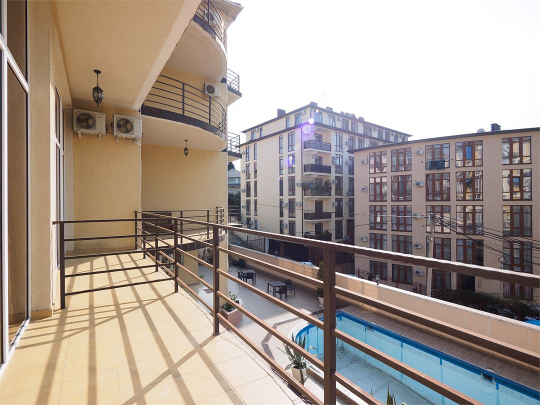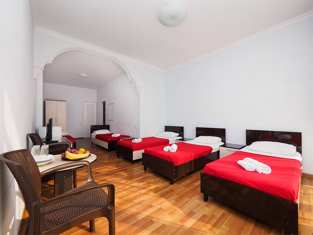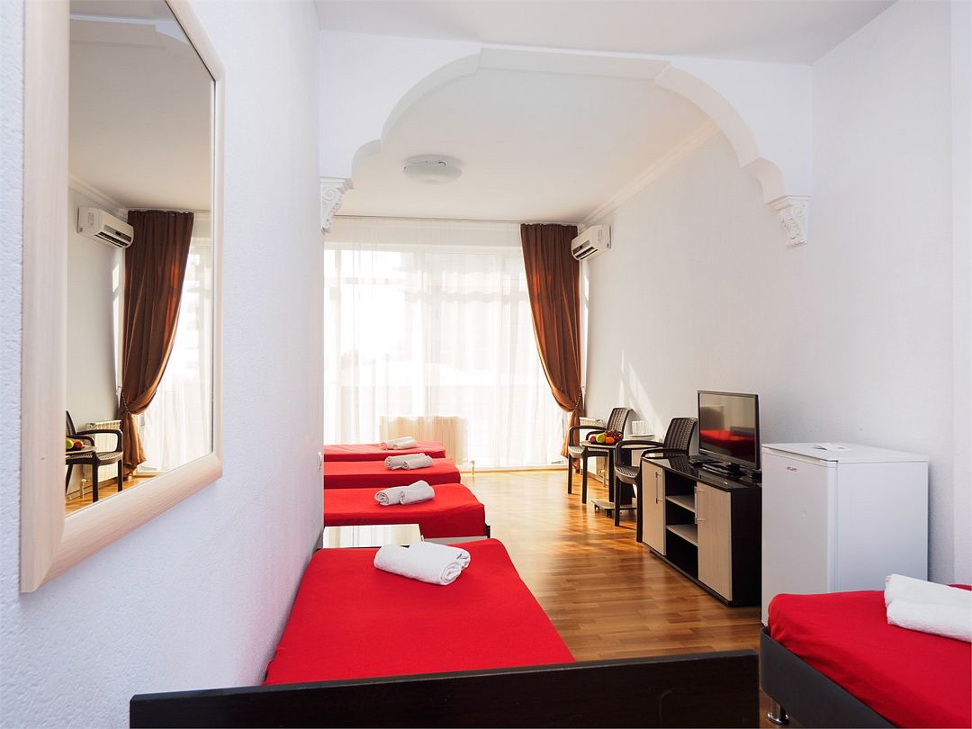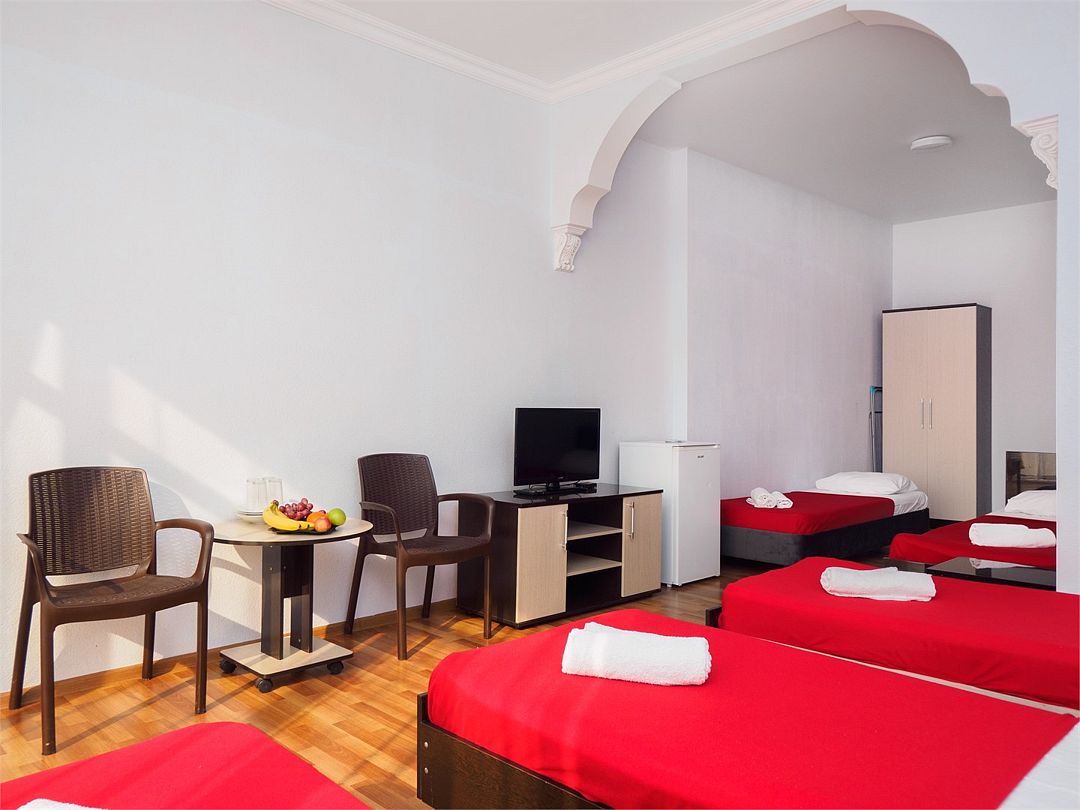 Пятиместный номер комфорт с 5 односпальными кроватями и большим балконом с видом на бассейн. Оснащение : ТВ, кондиционер, холодильник, шкаф, зеркало, стол, стулья, тумбочки, собственный с/у, интернет, фен по запросу. Бассейн на территории отеля работает в летний период.Услуги и удобства