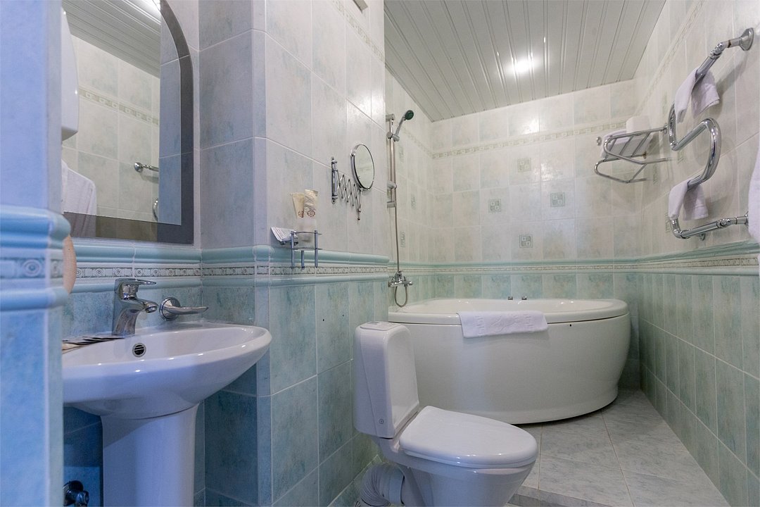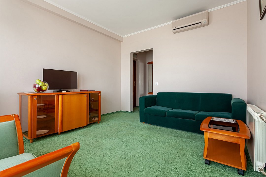 Большой двухкомнатный номер общей площадью 46 кв. м с возможностью размещения до четырех человек. В спальне двуспальная кровать, в гостиной — раздвижной диван. В номере: холодильник-бар; сплит-система; Wi-Fi; LCD телевизор с кабельным телевидением; электронный сейф-бокс; телефон; балкон; ванная комната с ванной или джакузи; фен и косметические принадлежности; халат и тапочки. При заселении с гостей взимается возвратный депозит - 5000 рублей. Питание по системе "Шведский стол" проходит в ресторане "Миндаль" (отдельно стоящее от жилых корпусов здание).Услуги и удобства