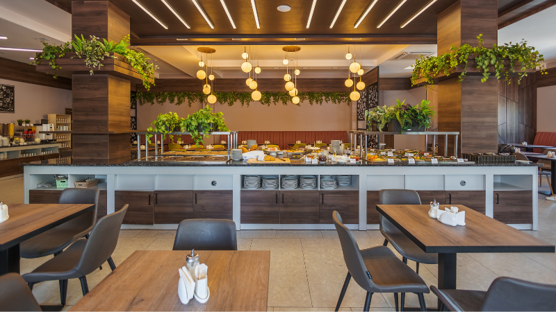 Ресторан «Миндаль» — стильный двухэтажный ресторан на 300 посадочных мест. В зале проходит питание по системе шведской линии.