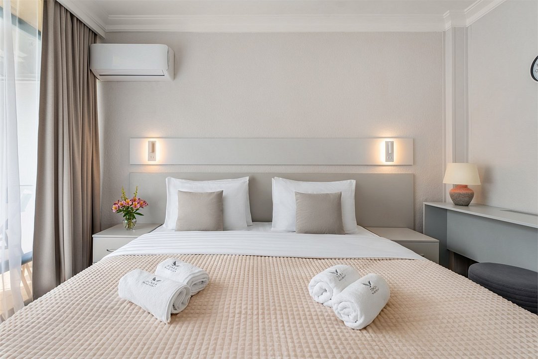 Wi-Fi, интернет, кондиционер, светильник, фен, санузел, банные принадлежности, халаты, банные полотенца, пляжные полотенца, тапочки, балкон, две односпальные или большая двуспальная кровать, тумбы, шкаф для одежды, чайный набор, чайник, ковровое покрытие, душ, стол, панорамные окна, телевизор с плоским экраном, мини-холодильник, пуфик, туалетные принадлежности премиум-класса, вешалки-плечики, мыло, затемняющая штораВ номере
