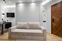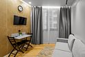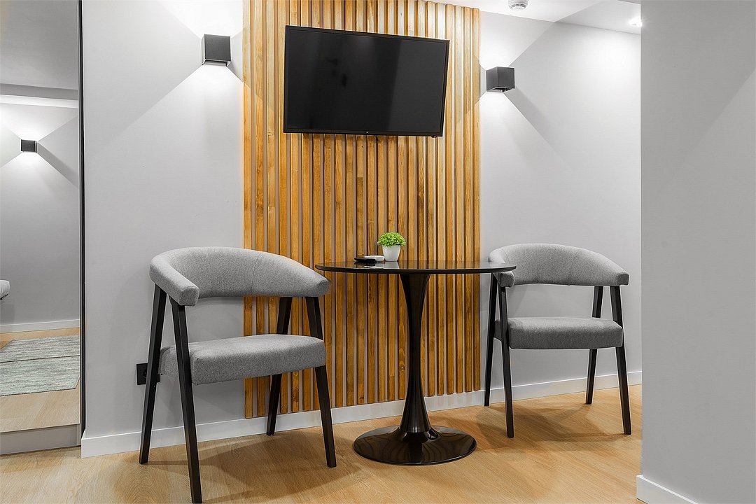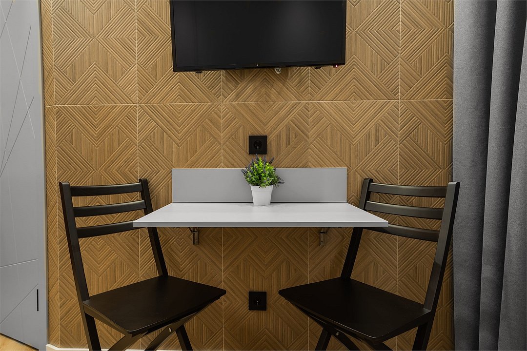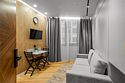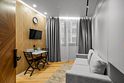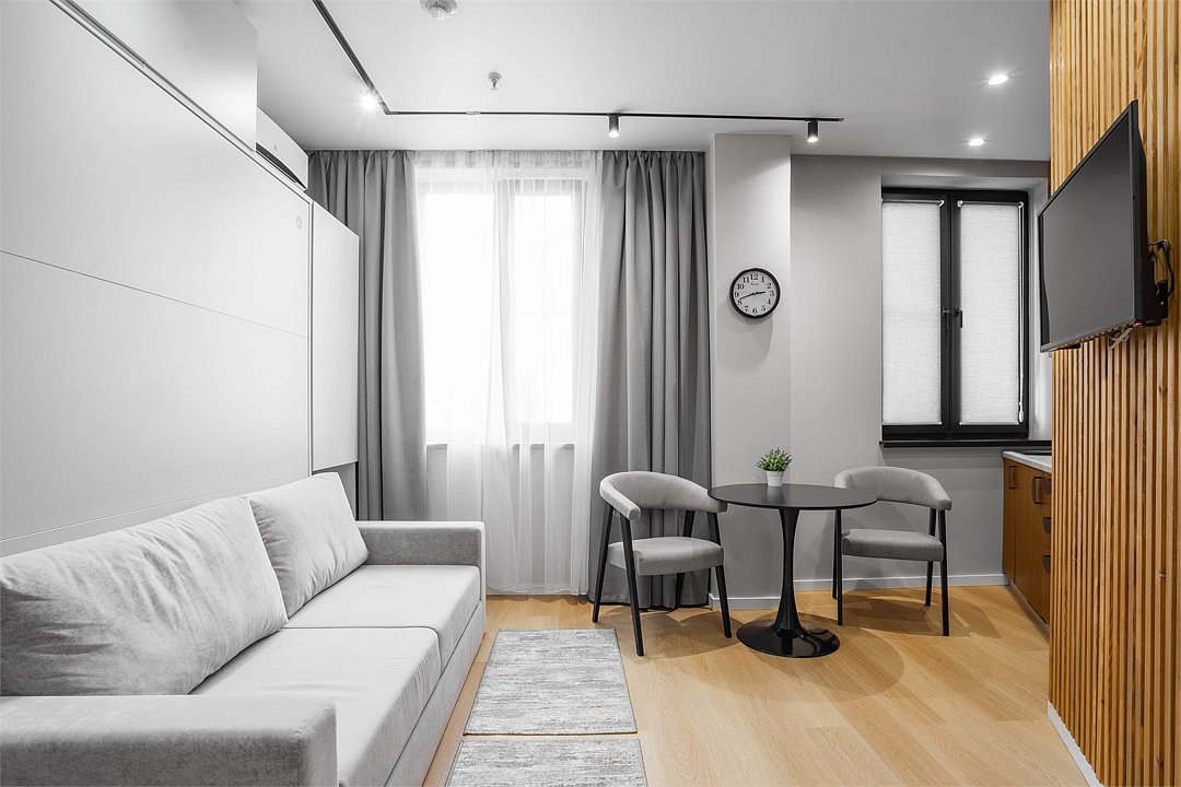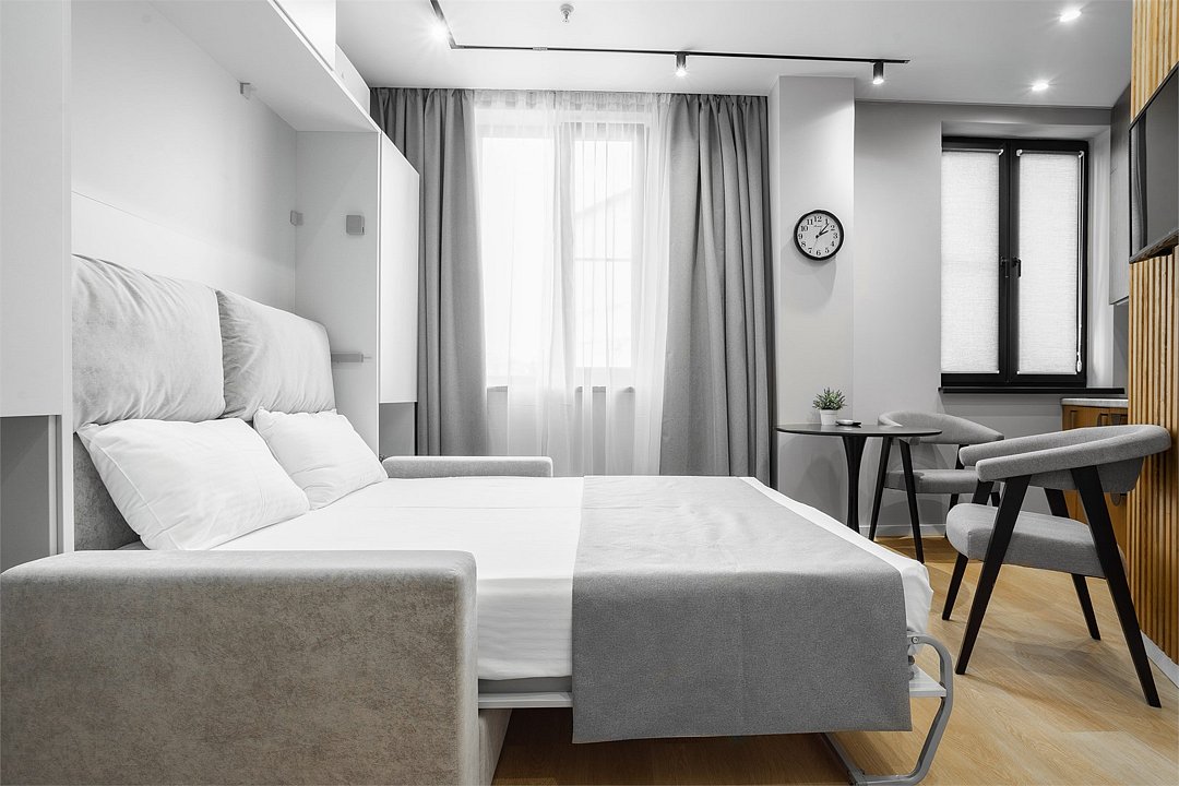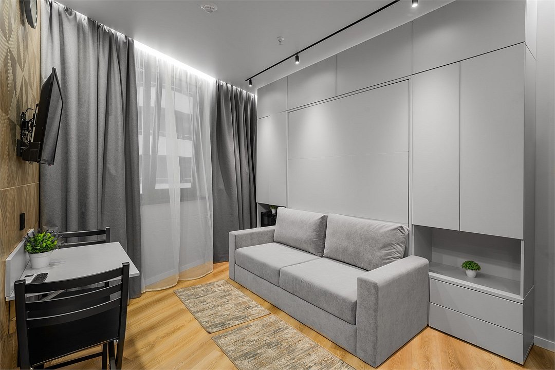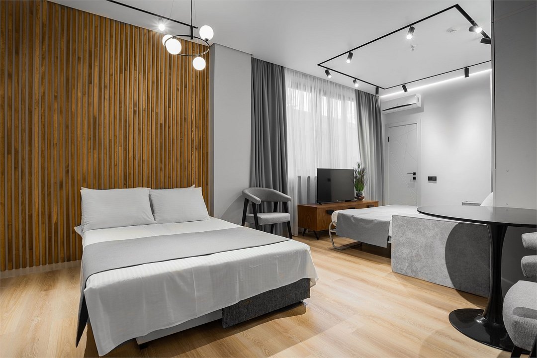 Стильный номер оснащен двуспальным раскладным диваном и телевизором. Отдельный санузел оснащен душевой. В гостевой постояльцев оживает ресепшен и мягкий диван для отдыха.