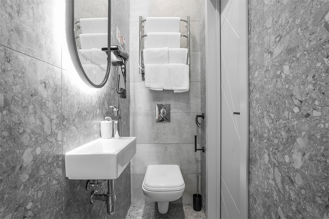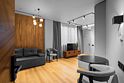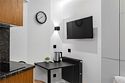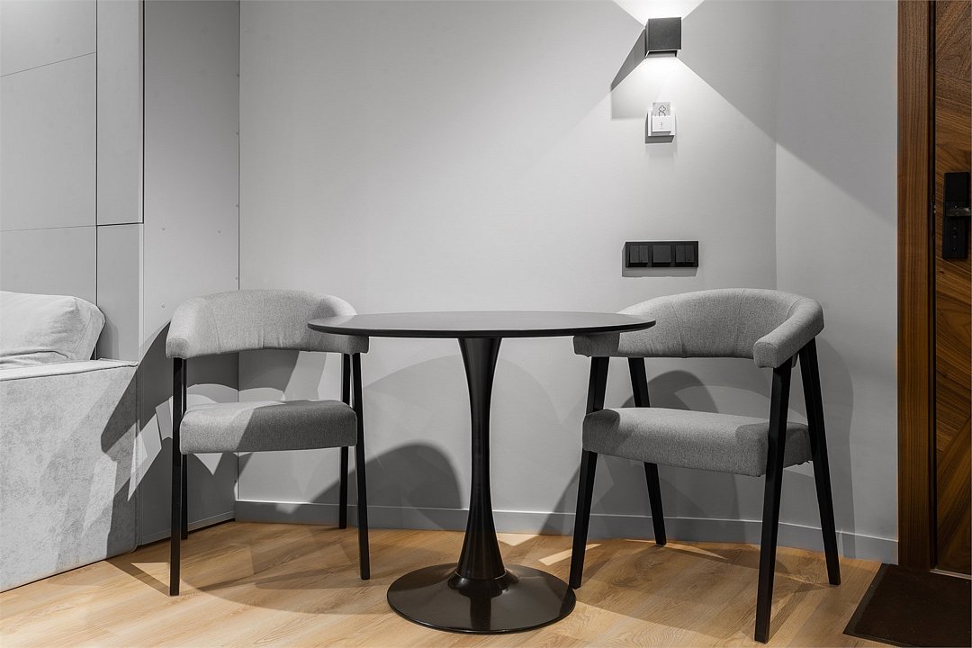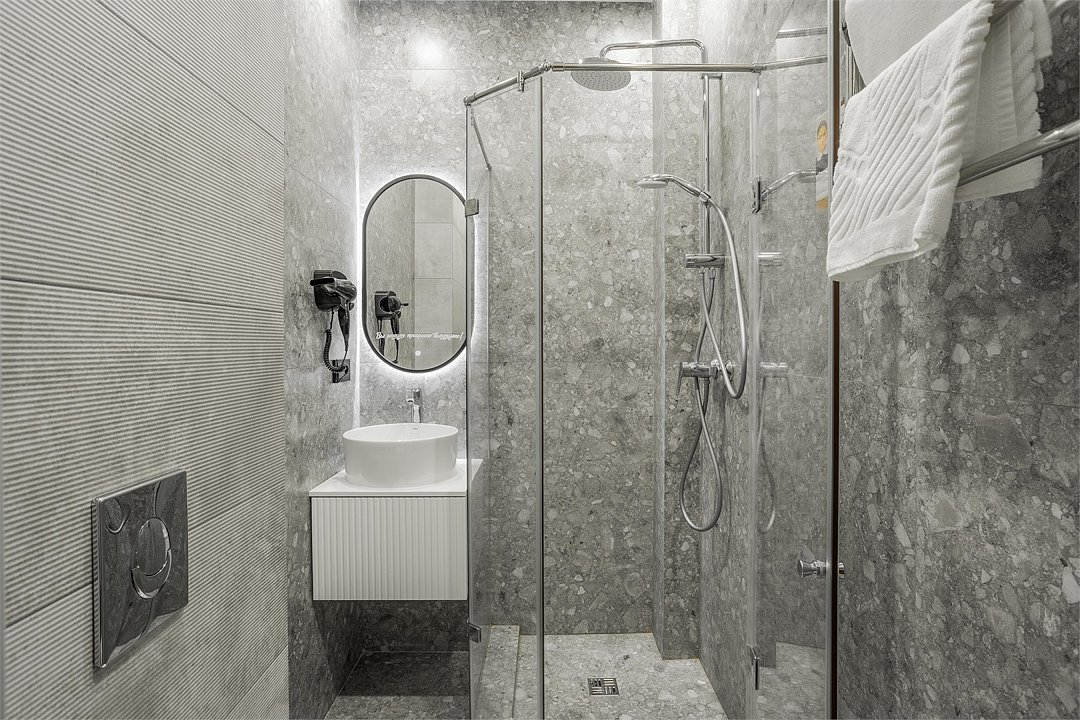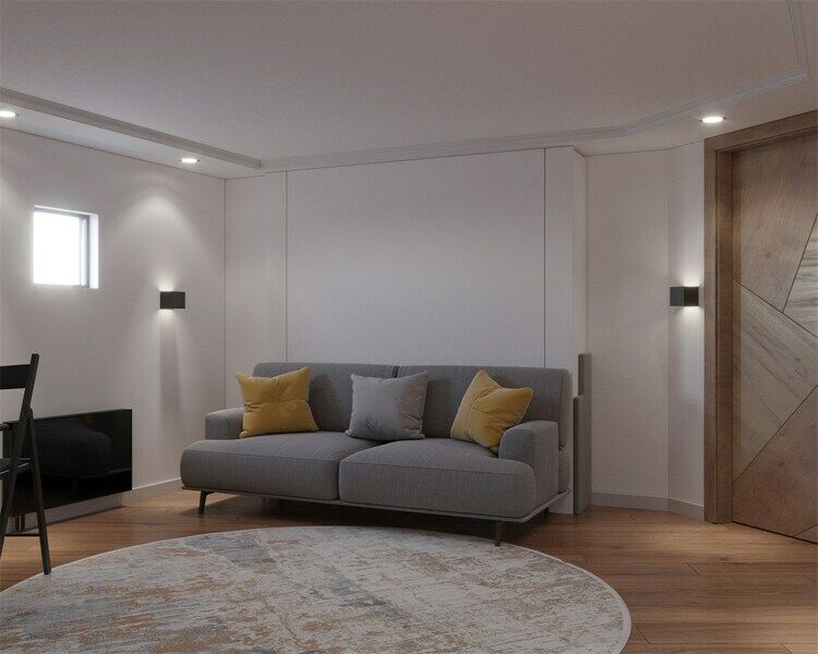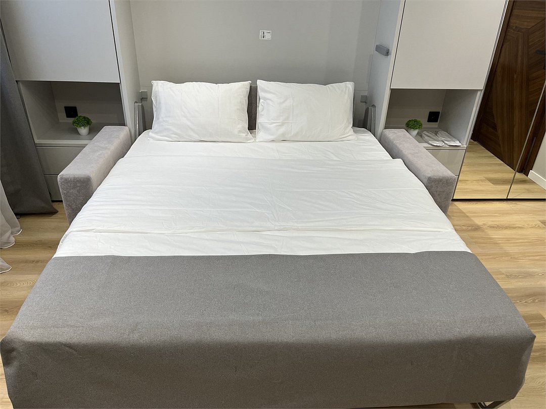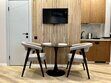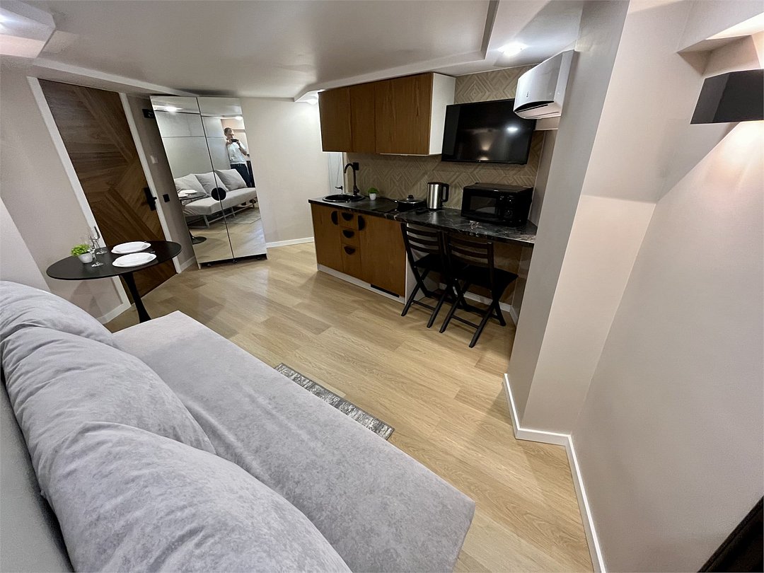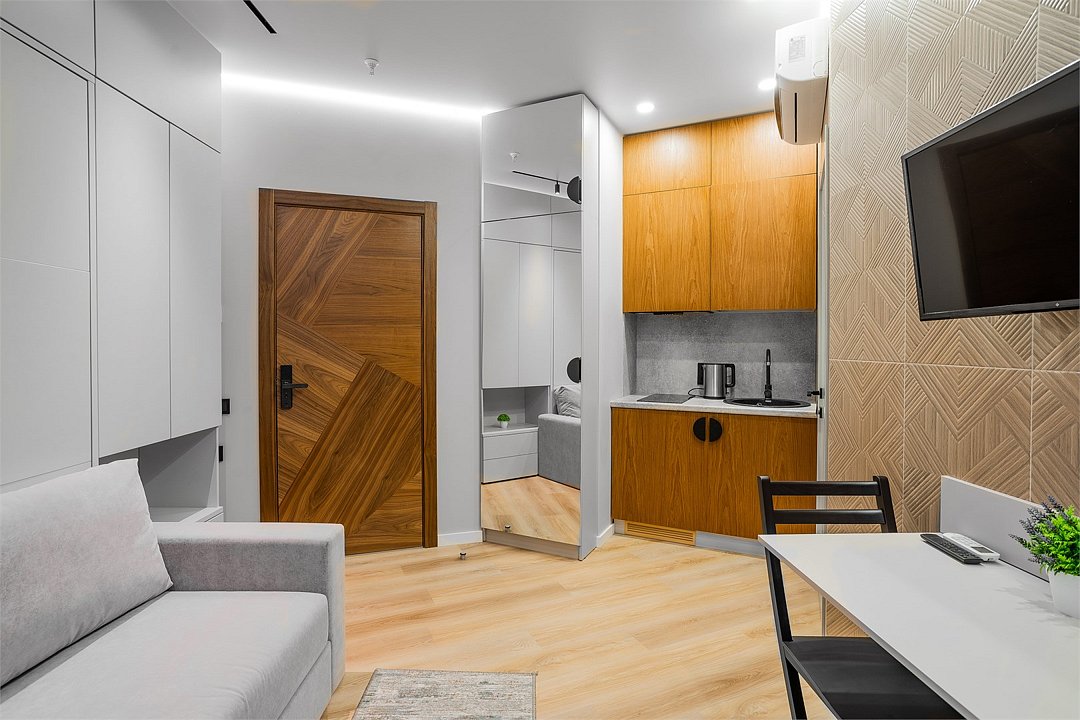Стильный номер оснащен двуспальным раскладным диваном и телевизором. Отдельный санузел оснащен душевой. В гостевой постояльцев оживает ресепшен и мягкий диван для отдыха.