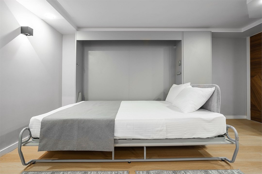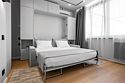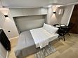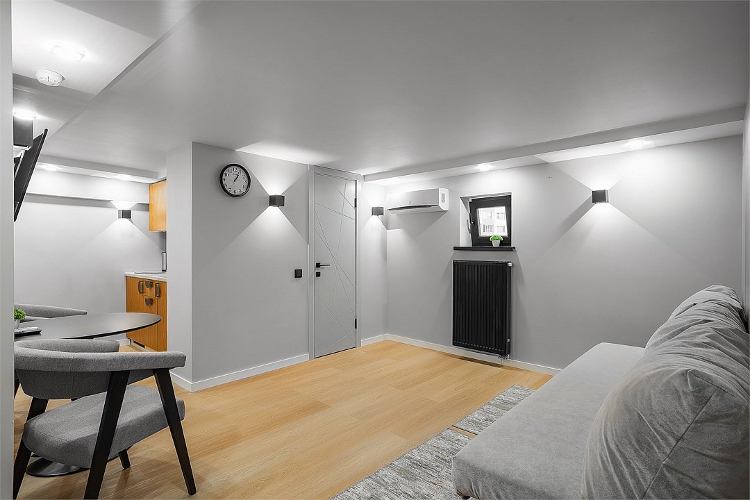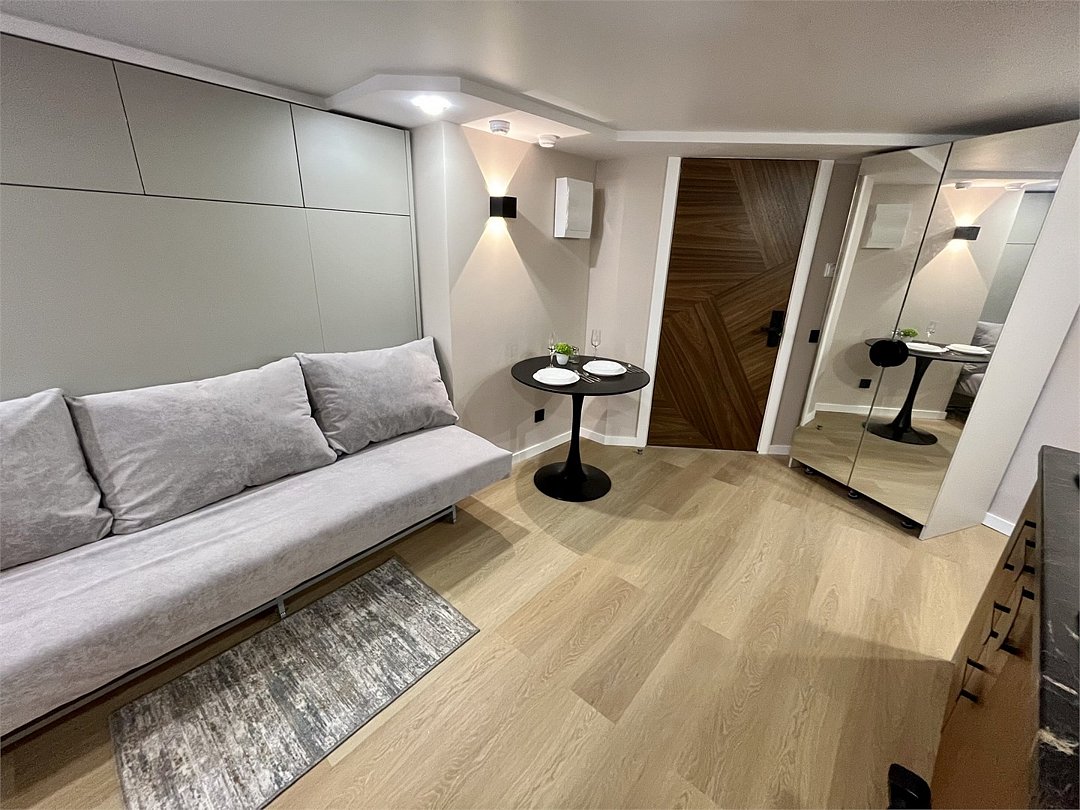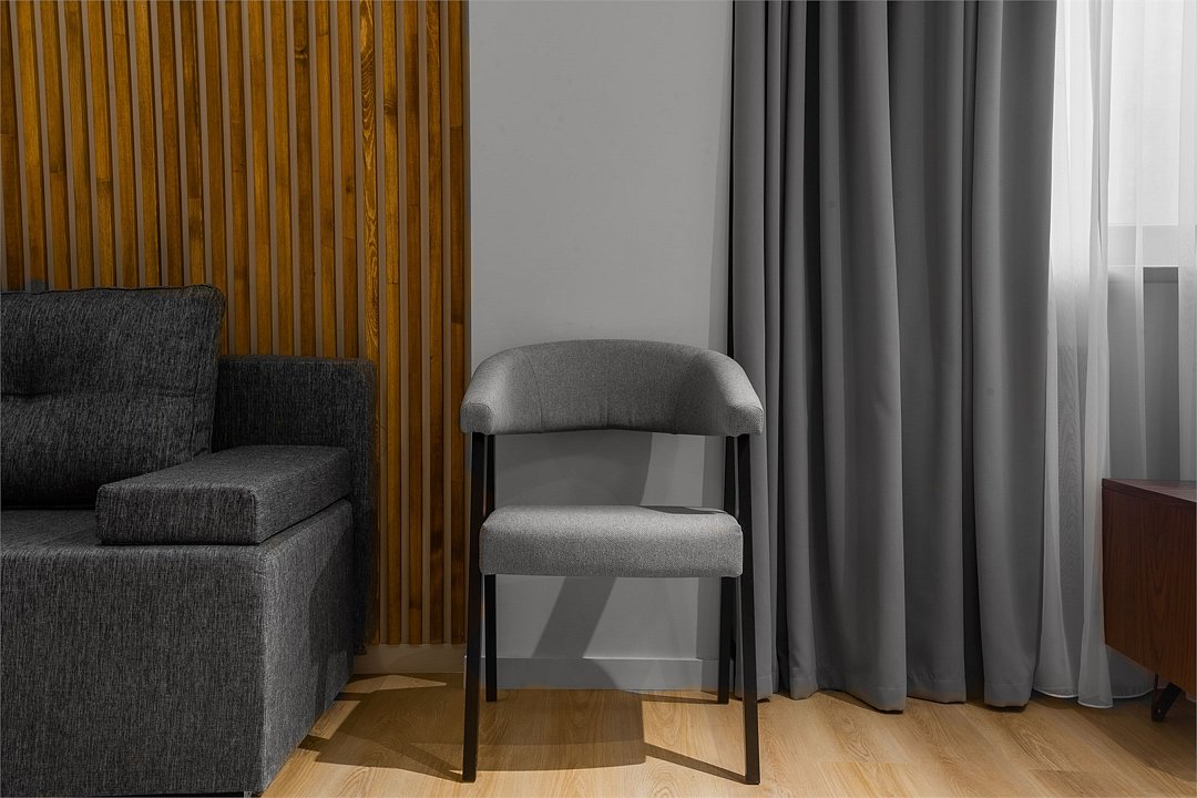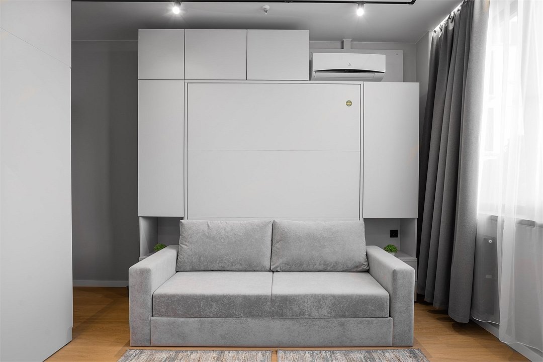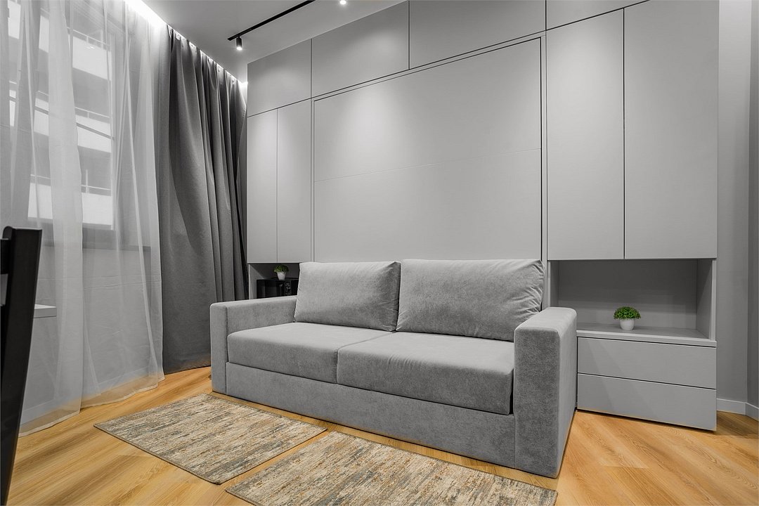 Стильный номер оснащен двуспальным раскладным диваном и телевизором. Отдельный санузел оснащен душевой. В гостевой постояльцев оживает ресепшен и мягкий диван для отдыха.
