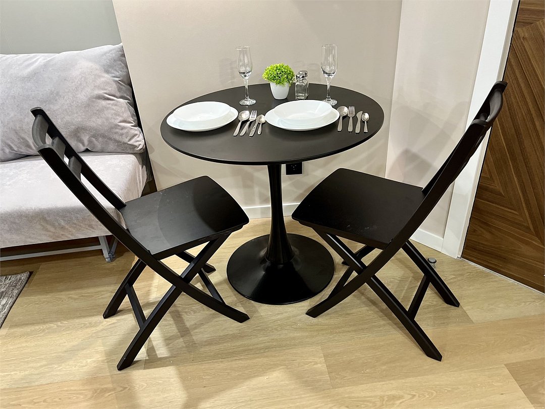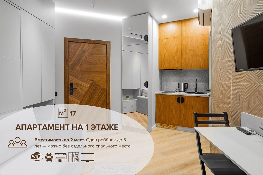 Wi-Fi, холодильник, кондиционер, фен, электронные замки, плита для приготовления пищи, микроволновая печь, душевая кабина, банные полотенца, косметические средства, двуспальная кровать, стулья, шкаф для одежды, вешалки, зеркало, набор посуды, чайник, унитаз, отопление, ламинат, кухонная посуда, стаканы, кухонная утварь, столовые приборы, стол, туалетные средства, сплит-система, сушилка для белья, телевизор с плоским экраном, мини-кухня, без окна, можно с питомцамиВ апартаментах