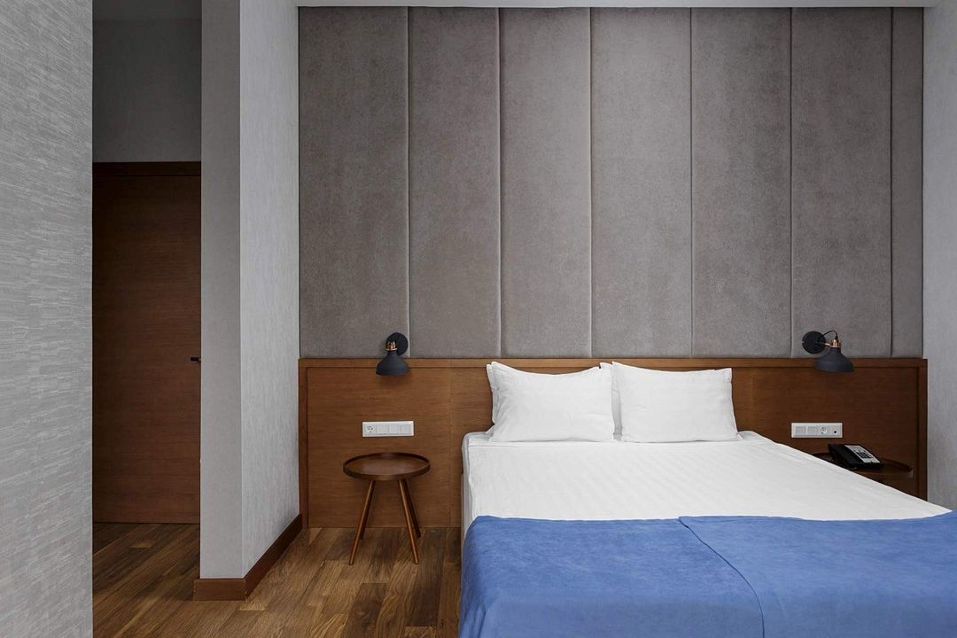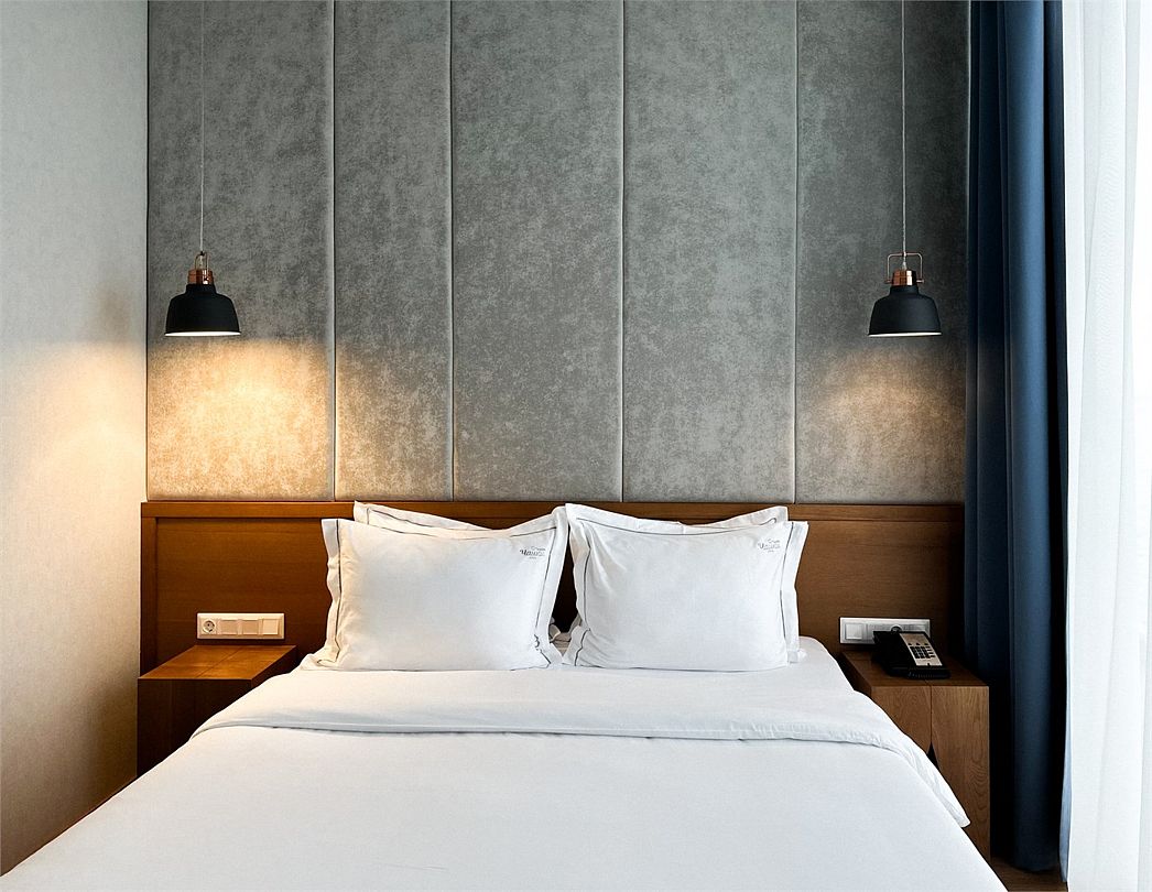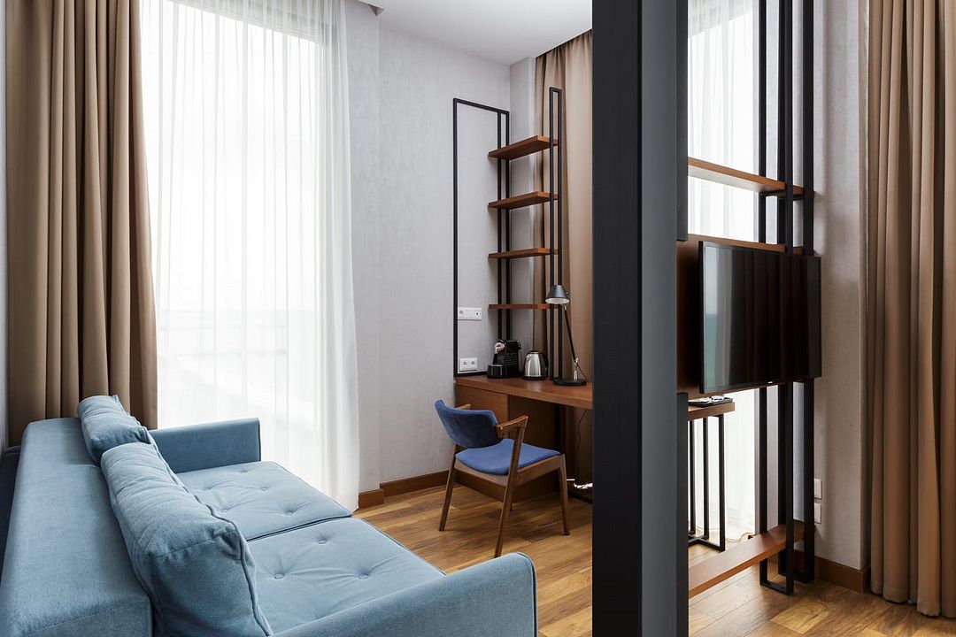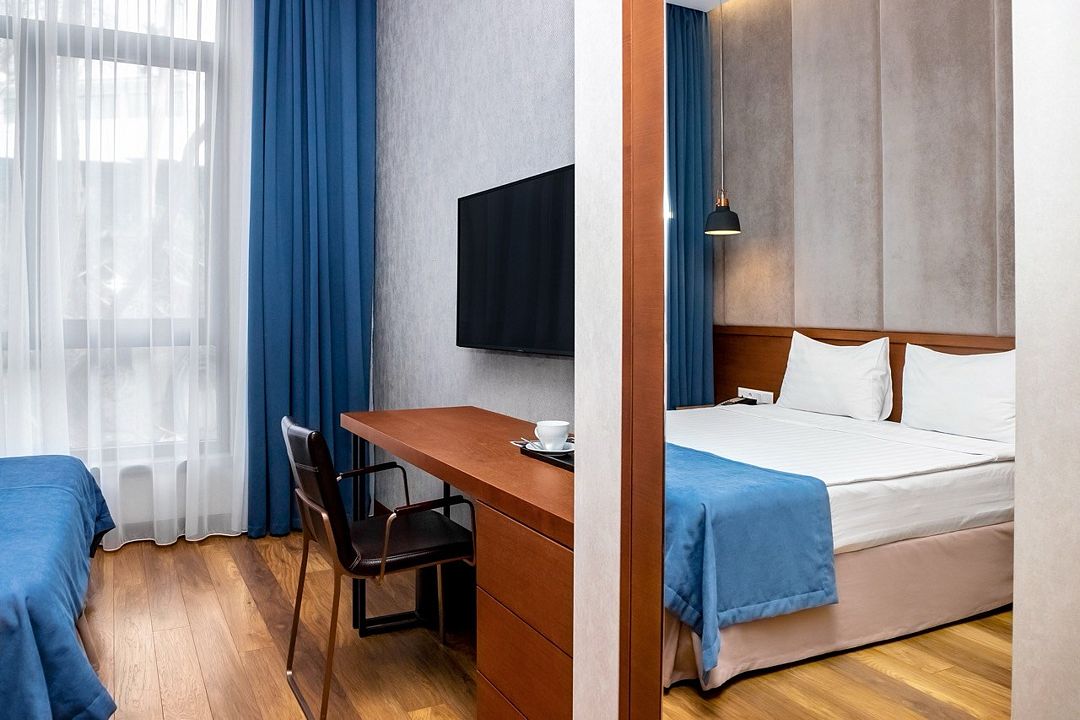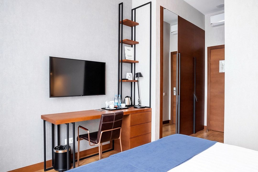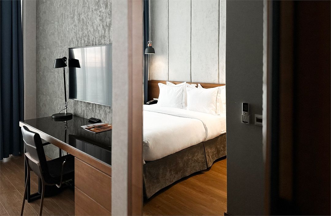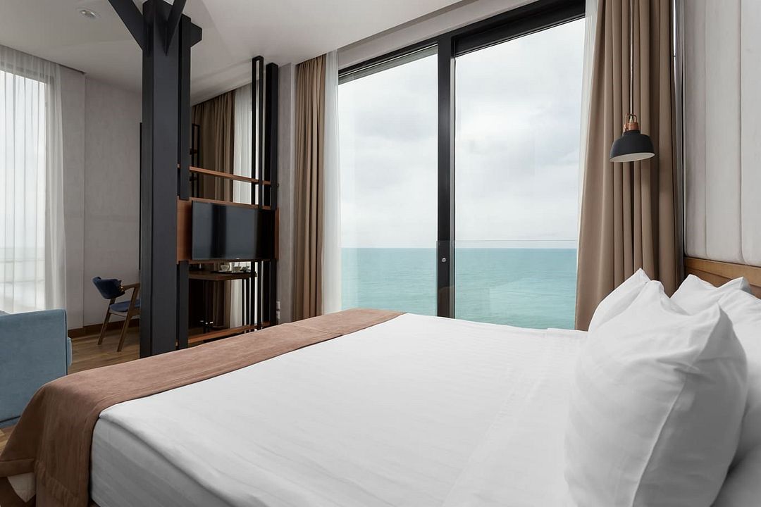 Современный однокомнатный номер с дизайнерской отделкой — комфортная база для проживания у моря или поездки по делам. Здесь всё собрано так, чтобы было удобно жить: качественный сон, рабочее место, понятное наполнение без лишнего. В номере: двуспальная кровать или две раздельные кровати с ортопедическими матрасами, рабочая зона со столом, система климат-контроля, сейф, мини-бар, чай/кофе, Wi-Fi, телевизор со спутниковым ТВ, телефон. В ванной комнате — душевая кабина, фен, халаты, тапочки и премиальная косметика. Кому подойдёт: деловые поездки, активный отдых вне номера, гости, которым важны тишина и функциональность.Услуги и удобства