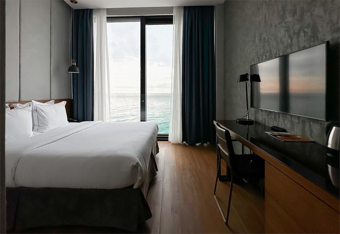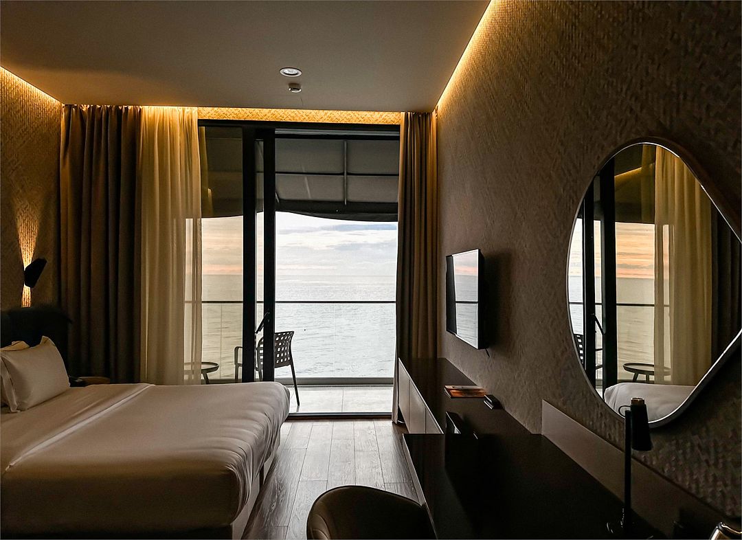 телевизор, спутниковое телевидение, Wi-Fi, кондиционер, фен, ванная комната, душевая кабина, халаты, банные полотенца, тапочки, гигиенические средства, косметические средства, две односпальные или большая двуспальная кровать, тумбы, шкаф для одежды, письменный стол, письменные принадлежности, чайный набор, обслуживание номеров, сейф, чайник, раковина, отопление, вид на море, стаканы, стул, туалет, внутренний телефон, телевизор со Smart TV, номер для некурящих, электронный консьерж 24/7, уборка номера, набор для приготовления чая и кофе, услуги прачечной (платно), вешалки-плечики, бутилированная вода, мини-бар (платно), шапочка для душа, мыло, окна от пола до потолка, зеркало в полный рост, еда на вынос (за дополнительную плату), тропический душВ гостиничном номере