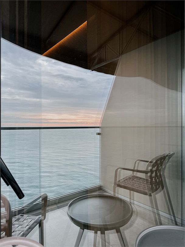 Номер с особенностью из-за своего бокового расположения, но с собственным балконом и панорамным видом на море. Балкон становится отдельной зоной отдыха — для утреннего кофе, свежего воздуха и вечерних видов на море. В номере: двуспальная кровать с ортопедическим матрасом или две раздельные, рабочая зона, климат-контроль, сейф, мини-бар, чай/кофе, Wi-Fi, телевизор, телефон. В ванной комнате — душевая кабина, фен, халаты, тапочки и премиальная косметика. Кому подойдёт: тем, кто ценит балкон как продолжение номера и хочет прямой морской вид именно на открытом воздухе.Услуги и удобства