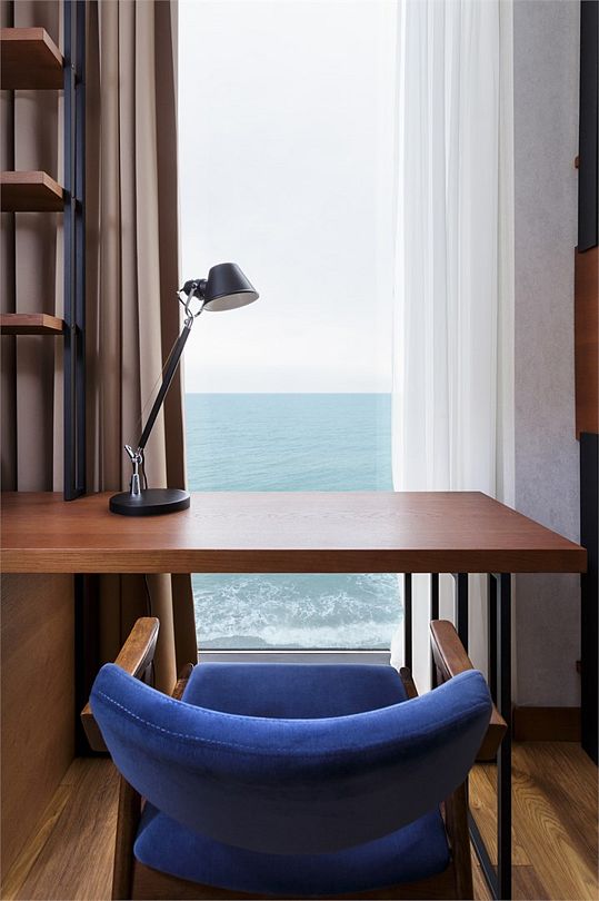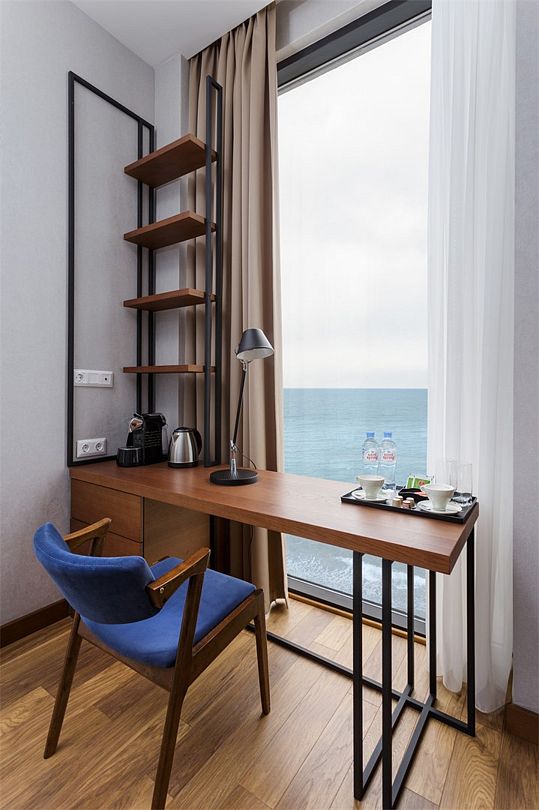 Просторный и светлый номер с панорамным видом на море и ощущением свободы. Главный акцент — просторная рабочая зона напротив окна с видом на бескрайнее море, где работа или учёба становятся частью отдыха. В номере: двуспальная кровать или две односпальные кровати с ортопедическими матрасами, диван для размещения дополнительных гостей, рабочее место у окна, системы хранения, Wi-Fi, сейф, холодильник, телевизор, телефон, набор для чая (чёрный и зелёный). Также в номере предусмотрена индивидуальная капсульная кофемашина с капсулами двух видов кофе. В ванной комнате — всё необходимое для комфортного проживания, включая халаты и банные принадлежности. Кому подойдёт: пары на длительный отдых, гости на удалённой работе, семьи и те, кто хочет больше пространства и гибкость в размещении.Услуги и удобства