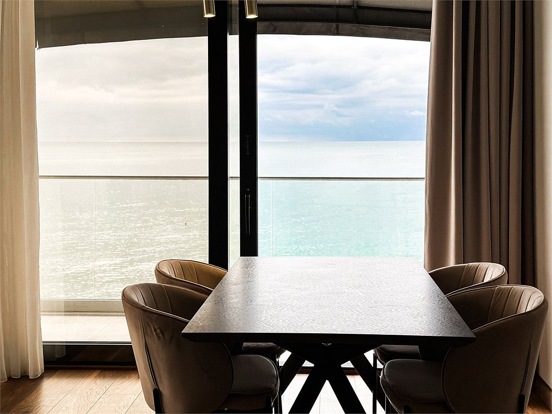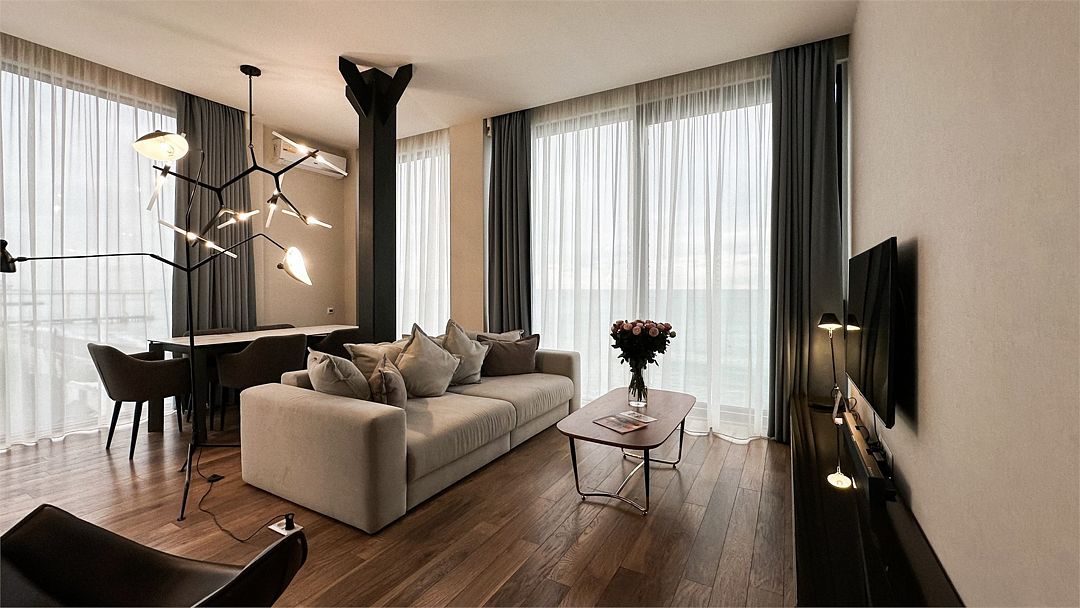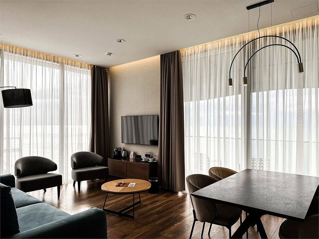 Премиальный номер с панорамным видом на море, дизайнерской отделкой и ощущением максимального комфорта. Пространство сочетает спальню и зону отдыха с диваном для размещения дополнительных гостей. В номере: система климат-контроля, сейф, мини-бар, Wi-Fi, телефон, телевизор, индивидуальная капсульная кофемашина с капсулами двух видов кофе, обеденная зона на 4 человека — удобно для room-service. В ванной комнате — душ, фен, халаты, тапочки и премиальная косметика. Дополнительная привилегия — собственный выход на террасу ресторана. Кому подойдёт: семейные поездки, особые даты, отдых на максимуме и гости, которым важны простор, статус и возможность разместиться компанией.Услуги и удобства