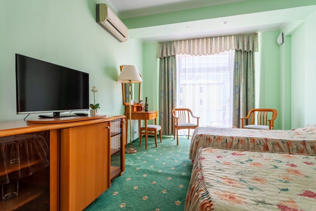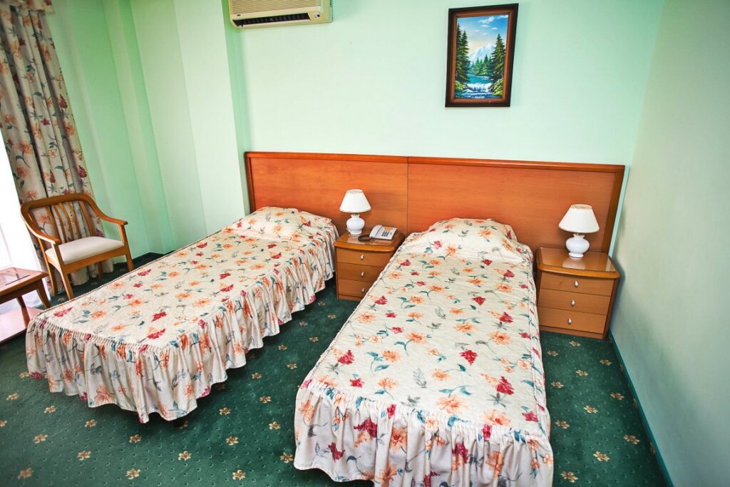 Просторный однокомнатный номер общей площадью 37 м2. с возможностью размещения четырех человек. Спальные места – две односпальные кровати, которые стоят вместе или могут быть раздвинуты, раскладной двуспальный диван. В номере полностью оборудованная кухня, необходимый набор посуды, ванная комната с ванной или душем, балкон с видом на море. Номера располагаются с шестого по одиннадцатый этаж. При заселении с гостей взимается возвратный депозит - 5000 рублей. Питание по системе "Шведский стол" проходит в ресторане "Миндаль" (отдельно стоящее от жилых корпусов здание).Услуги и удобства