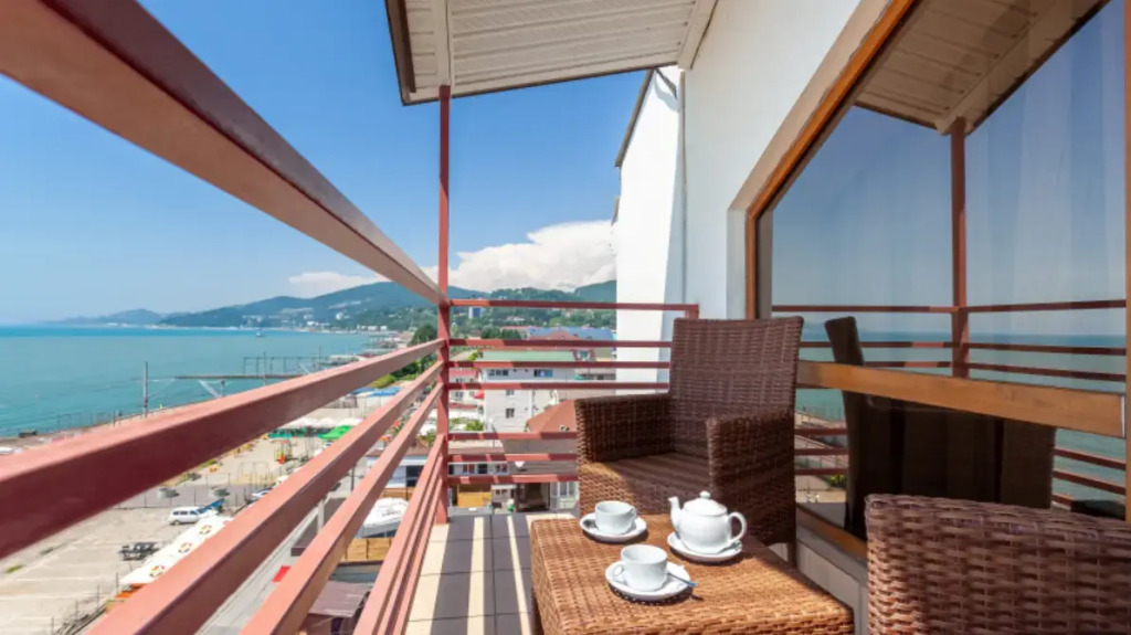 Уютный однокомнатный номер с балконом с прямым видом на море с возможностью размещения до 4х человек. Общая площадь номера – 37м2. Спальные места – двуспальная кровать, раскладной двуспальный диван. В номере полностью оборудованная кухня, необходимый набор посуды, ванная комната с ванной или душем, балкон. Номера данной категории располагаются с 6 по 11 этаж. При заселении с гостей взимается возвратный депозит - 5000 рублей. Питание по системе "Шведский стол" проходит в ресторане "Миндаль" (отдельно стоящее от жилых корпусов здание).Услуги и удобства