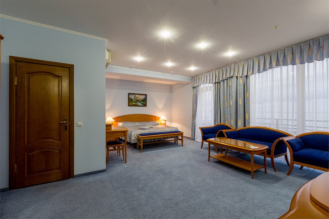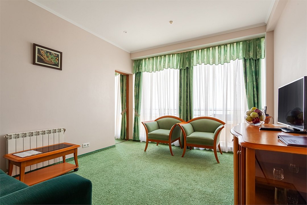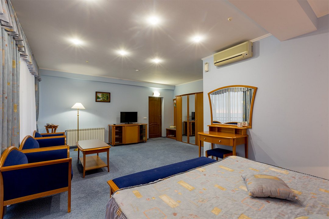Апартаменты 2х-комнатные Люкс с кухней и балконом – просторный номер с выделенной спальней общей площадью 45 кв.м с возможностью размещения до четырех человек. Спальные места – двуспальная кровать, раскладной двуспальный диван. Номера данной категории располагаются со 2 по 5 этаж. При заселении с гостей взимается возвратный депозит - 5000 рублей. Питание по системе "Шведский стол" проходит в ресторане "Миндаль" (отдельно стоящее от жилых корпусов здание).Услуги и удобства