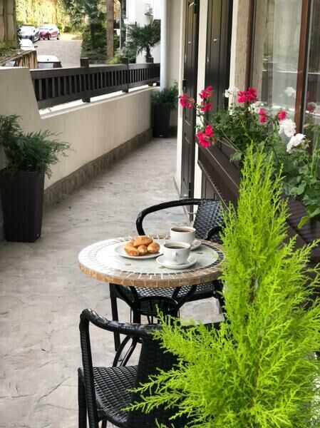 Гости апартаментов «Морская Резиденция Санторини Сочи» могут отдохнуть на террасе.
