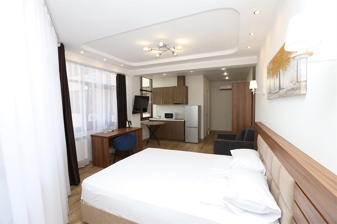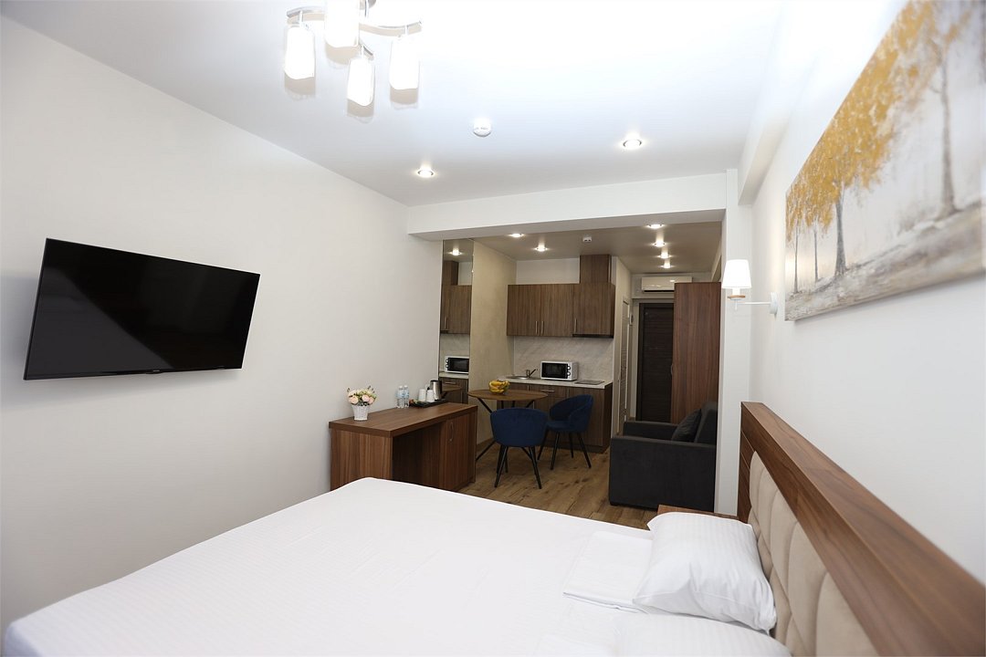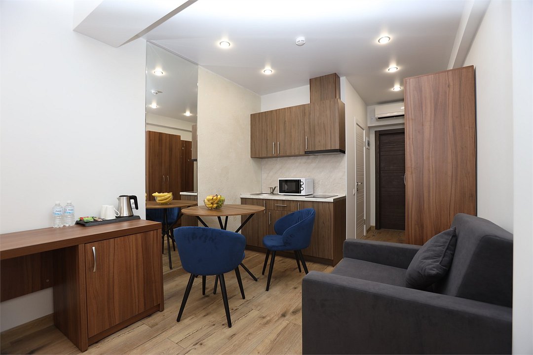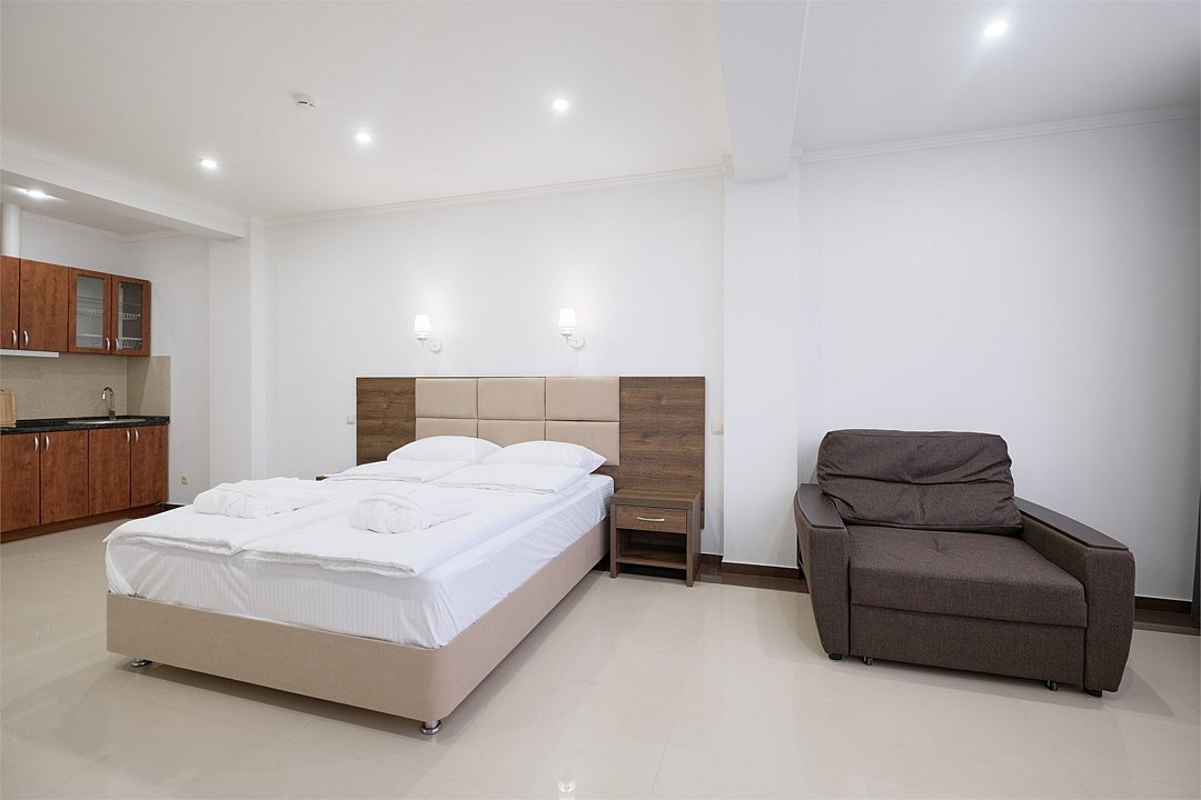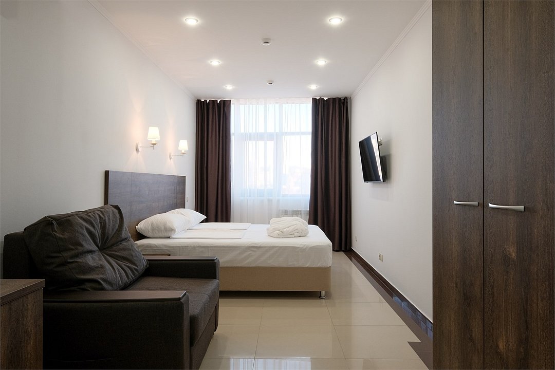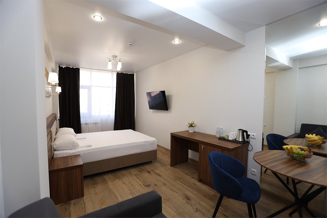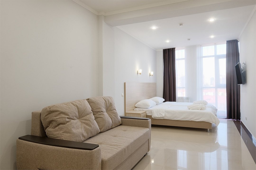 июль 2022 г.Комфортный апарт-отельНеплохой отель. Номера со свежим ремонтом и новой мебелью, есть все необходимое для комфортного проживания. Фото и описание на сайте соответствуют действительности. Из окна красивый вид на горы и город, но и шум от дороги присутствует. Полотенца меняют ежедневно, постельное белье дней через 5, качество уборки зависит от горничной, чаще поверхостная. Лифт имеется, но пользование им очень проблематично. Отель находится в здании жилого комплекса, во дворе есть неплохие магазинчики и кулинария, рядом Пятерочка, аптека, винный магазин. Расположение удачное относительно центральных пляжей, парка Ривьера, морского порта, ж/д вокзала. Нам понравилось!