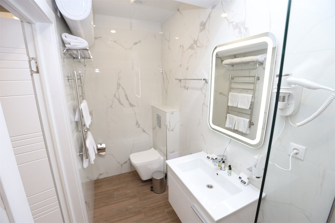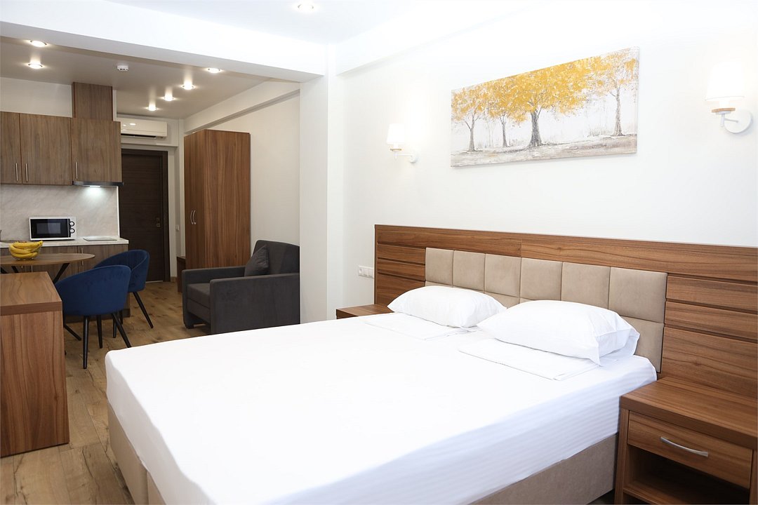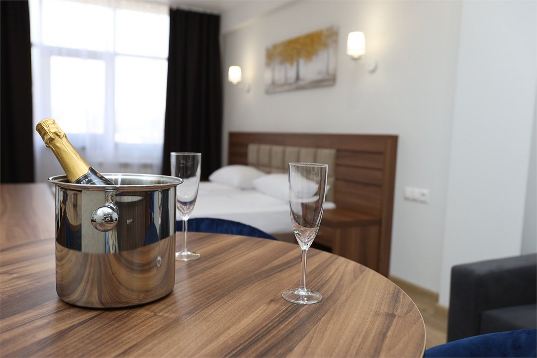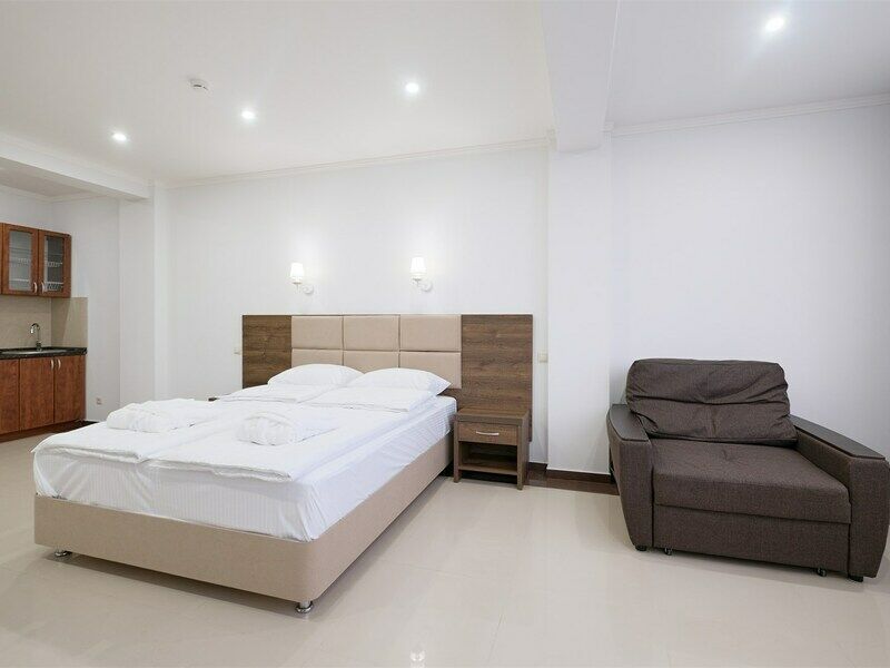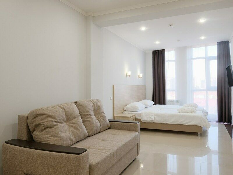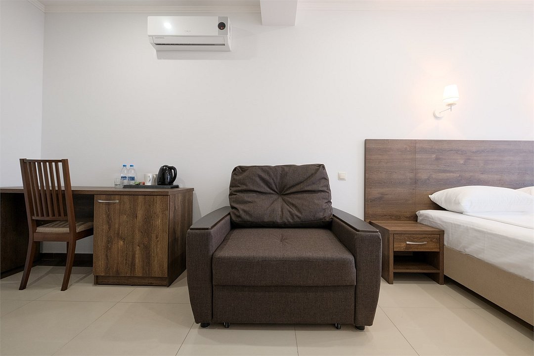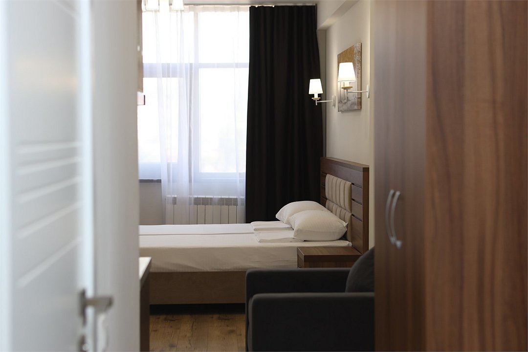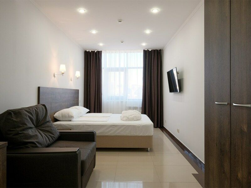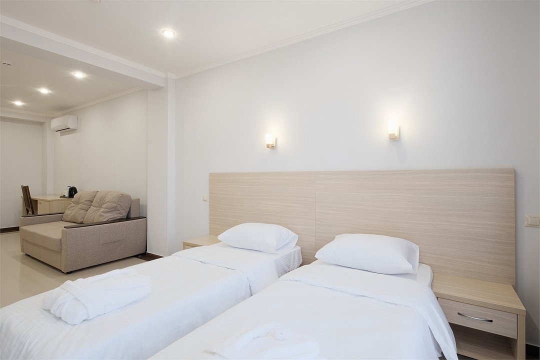 июль 2022 г.Комфортный апарт-отельНеплохой отель. Номера со свежим ремонтом и новой мебелью, есть все необходимое для комфортного проживания. Фото и описание на сайте соответствуют действительности. Из окна красивый вид на горы и город, но и шум от дороги присутствует. Полотенца меняют ежедневно, постельное белье дней через 5, качество уборки зависит от горничной, чаще поверхостная. Лифт имеется, но пользование им очень проблематично. Отель находится в здании жилого комплекса, во дворе есть неплохие магазинчики и кулинария, рядом Пятерочка, аптека, винный магазин. Расположение удачное относительно центральных пляжей, парка Ривьера, морского порта, ж/д вокзала. Нам понравилось!