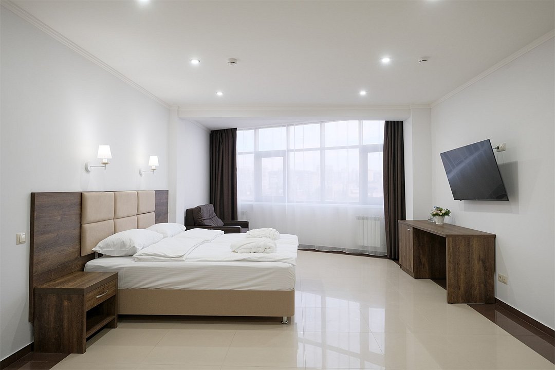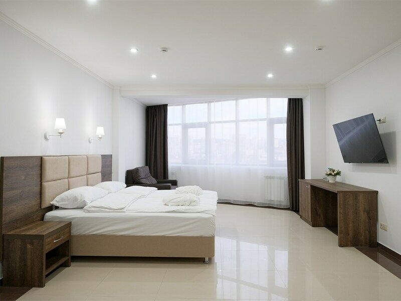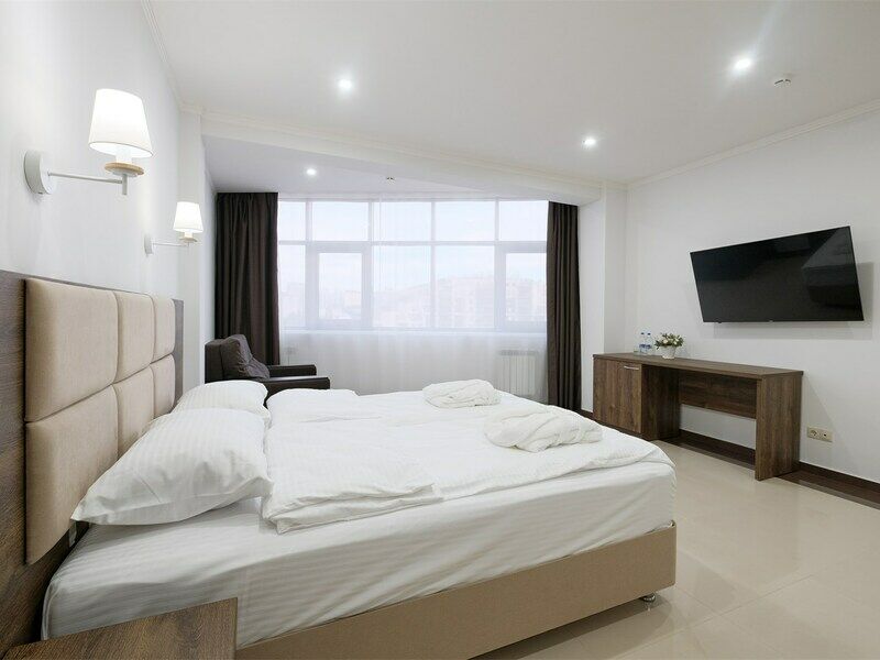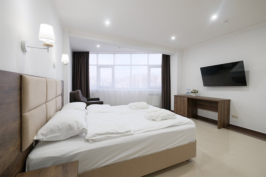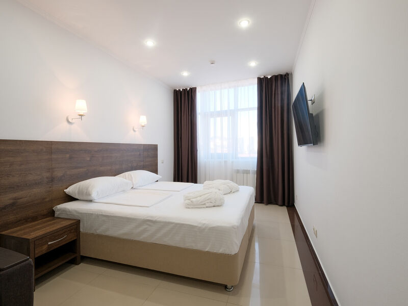 Wi-Fi, фен, ванная комната, ванна, халаты, банные полотенца, тапочки, косметические средства, двуспальная кровать, тумбы, шкаф для одежды, вешалки, обеденный стол, багажная тумба, зеркало, набор посуды, сейф, чайник, унитаз, раковина, питьевая вода, отопление, вид на город, плиточное покрытие, стаканы, стул, туалетные средства, туалет, сплит-система, сушилка для белья, цифровое тв, раскладное кресло, телевизор с плоским экраном, мини-холодильник, телевизор со Smart TV, номер для некурящих, рабочий стол, можно с питомцамиВ номере