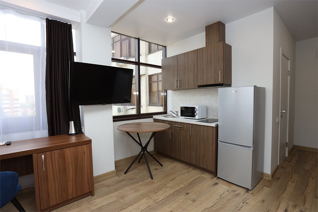 Премиальный номер-студия с кухней. Вид на город и горы с 7 этажа.Услуги и удобства