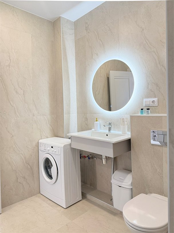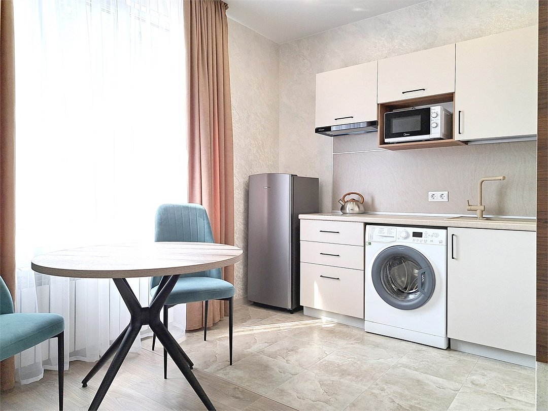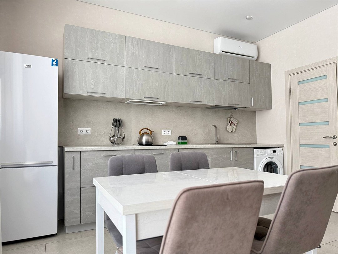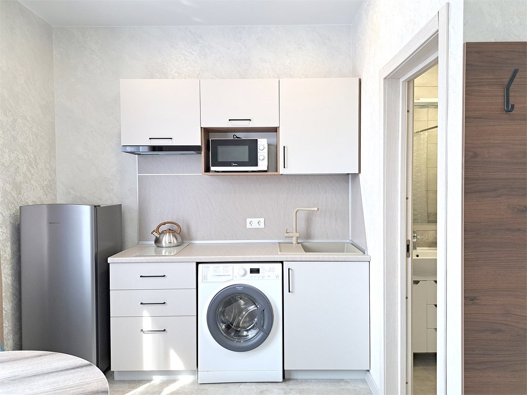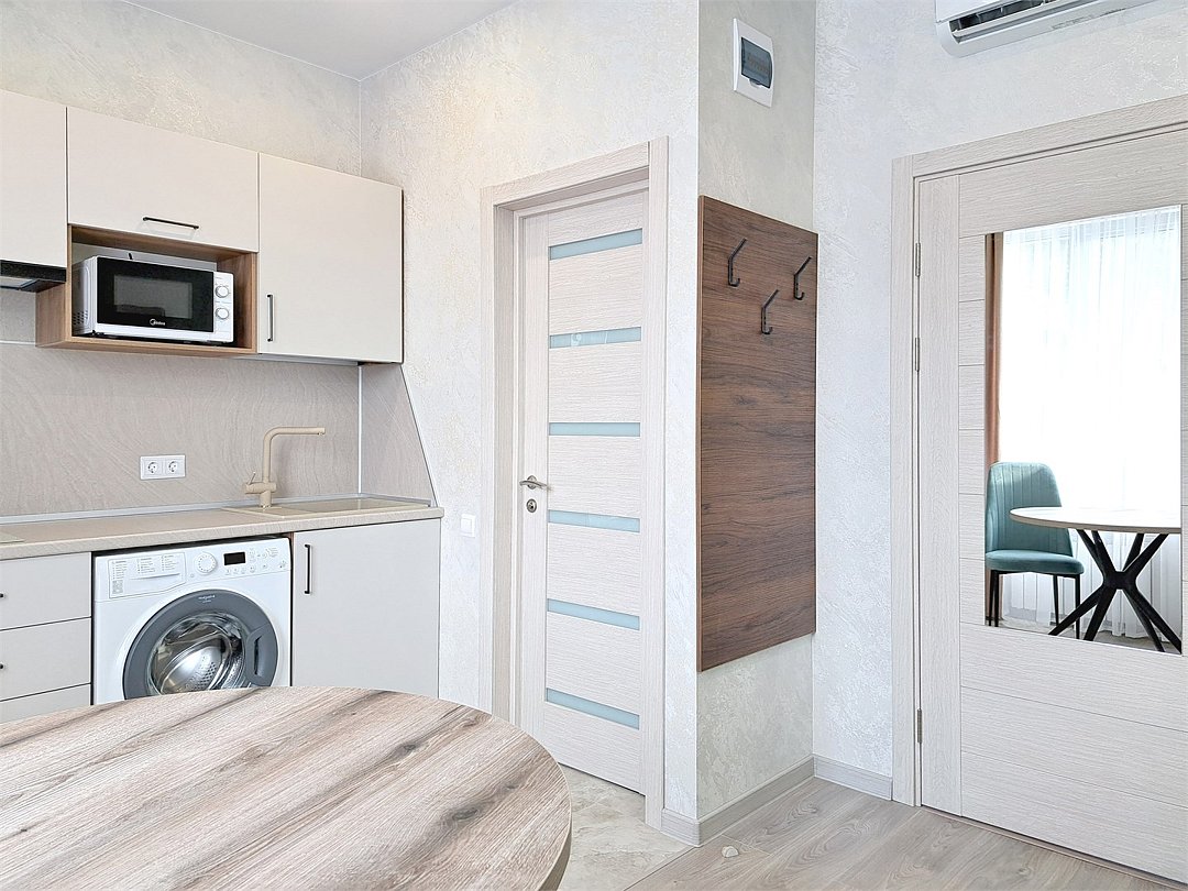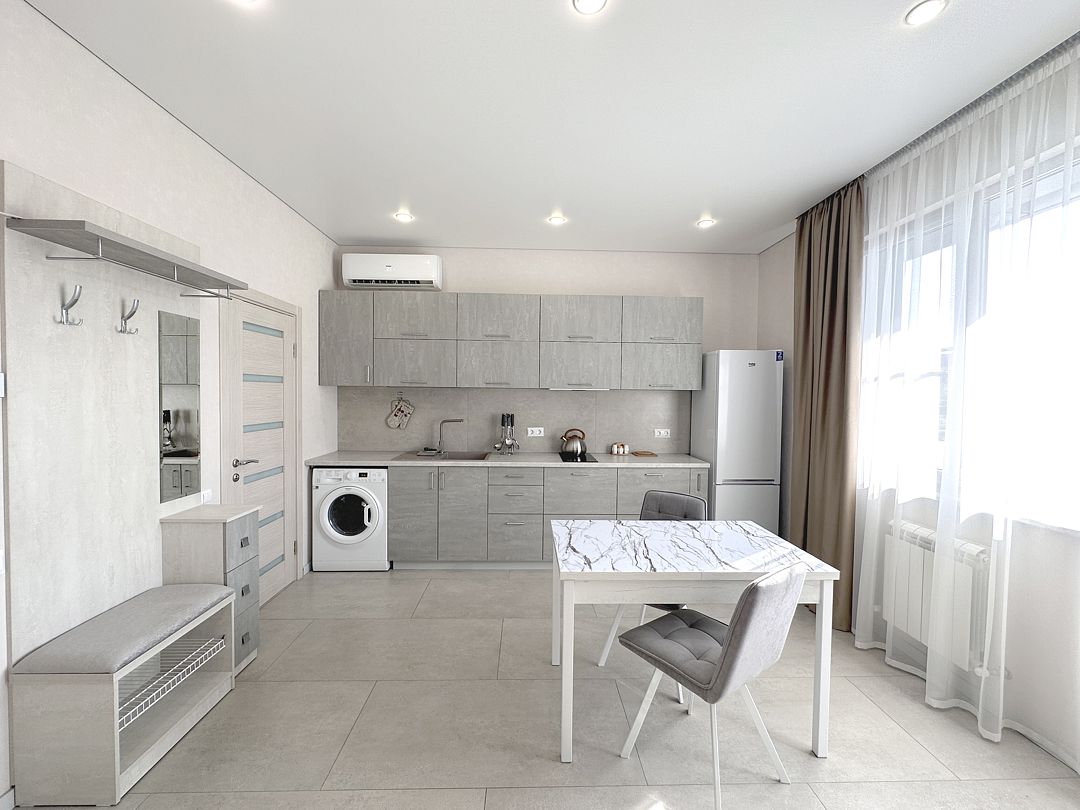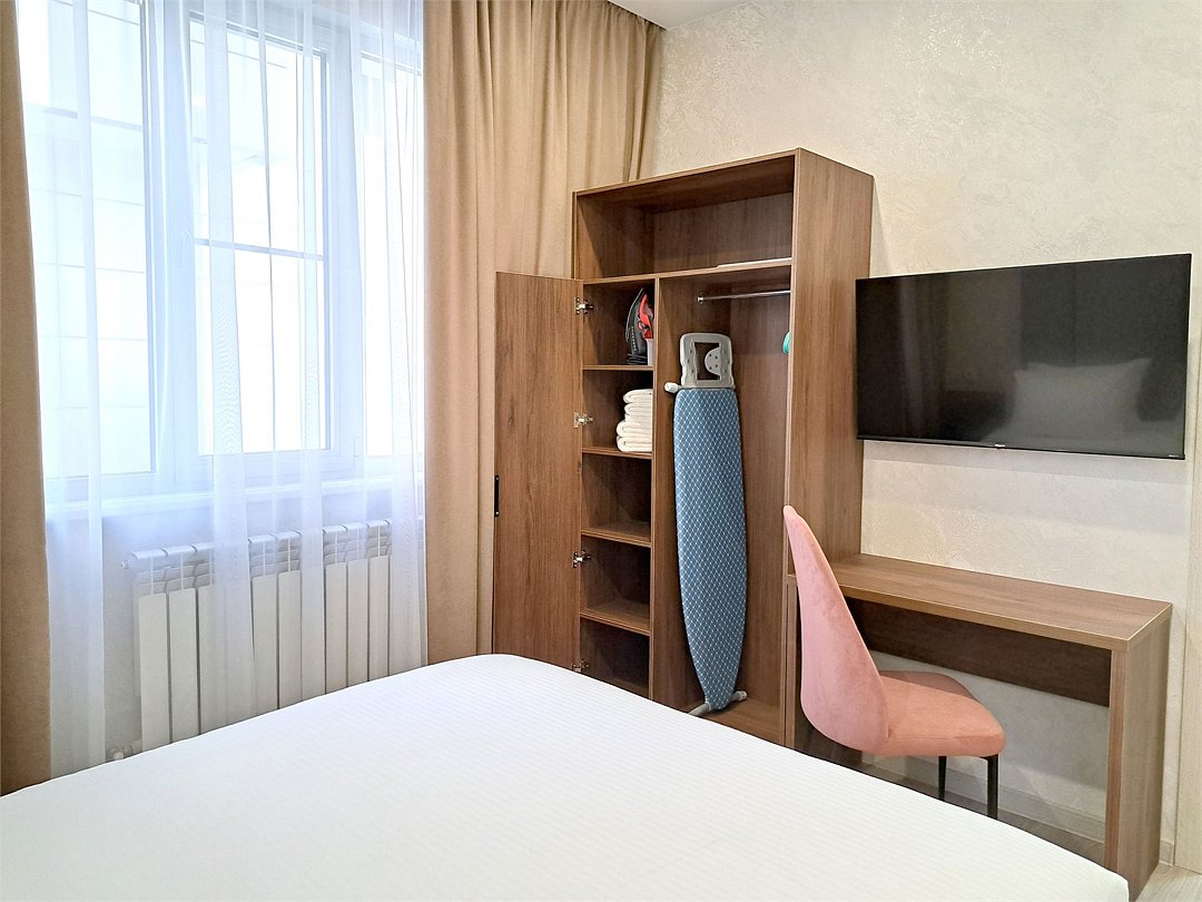 Wi-Fi, холодильник, светильник, фен, плита для приготовления пищи, утюг, теплый пол, банные полотенца, тапочки, гигиенические средства, двуспальная кровать, гладильная доска, стулья, шкаф для одежды, вешалки, письменный стол, обеденный стол, багажная тумба, зеркало, кухня, набор посуды, стиральная машина, чайник, раковина, отопление, душ, вид на город, плиточное покрытие, вид во двор, кухонная утварь, туалет, сплит-система, сушилка для белья, москитная сетка, телевизор со Smart TV, номер для некурящих, уборка номера, услуги прачечной (платно), вешалки-плечикиВ апартаментах