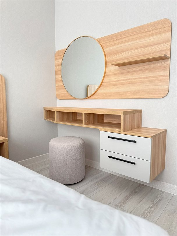 двуспальная кровать, диван раскладной, шкаф, письменный стол, обеденный стол, стулья, зеркало вешалка, фен, кондиционер, ТВ смарт