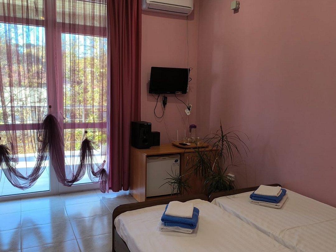 Номер стандарт с 2 односпальными кроватями (мансарда) Двухместный номер с двумя раздельными кроватями: холодильник, телевизор, душ и туалет в номере.В номере
