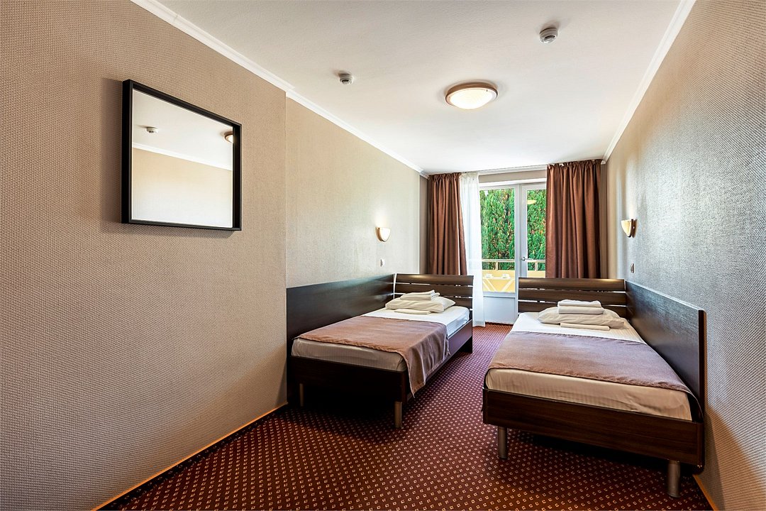 Двухместный номер с удобствами на этаже - это одна комната, хорошо отремонтированная и представлена в современном интерьере. В номере две односпальные кровати. Санузел и душевые (оборудованные фенами) находятся на этаже отеля и разделены на женские и мужские. В номере доступен бесплатный WI-FI. Обращаем Ваше внимание, что данный номер находится в Корпусе «Сочи» и может находится на 3-м, 4-м или 5-м этажах, окна могут выходить во двор или на Курортный проспект, Вы можете оставить пожелание при бронировании, а мы по возможности их выполним. При регистрации заезда гражданам РФ необходимо предъявить оригинал общегражданского паспорта. При размещении с детьми в возрасте до 14 лет следует предоставить оригиналы их свидетельства о рождении. Гостям в возрасте до 18 лет следует иметь при себе письменное согласие от одного из родителей на проживание в отеле (при размещении без родителей). Иностранным гражданам необходимо предъявить иностранный паспорт, визу и миграционную карту. Важно: заселение с домашними животными в данном номере ЗАПРЕЩЕНО. Обратите внимание: При заселении в номера с общими удобствами на этаже взимается обеспечительный платеж (страховой залог) в размере 1000 рублей - наличными или банковской картой. Эта сумма возвращается в день регистрации отъезда после сдачи ключей дежурному администратору тем же способом, каким она была списана.Услуги и удобства