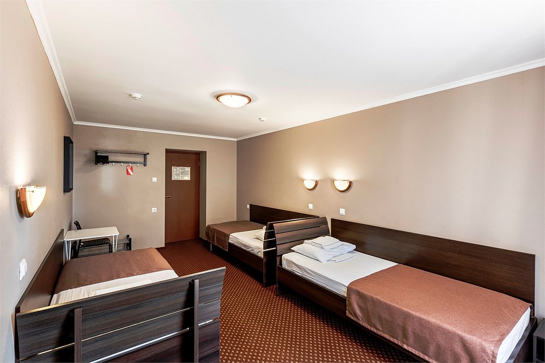 Wi-Fi, гигиенические средства, тумбы, вешалки, зеркало, ковровое покрытие, отопление, вид на город, кулер на этаже, три односпальные кровати, стул, стол, санузел на этаже, душ на этаже, без питомцевВ гостиничном номере