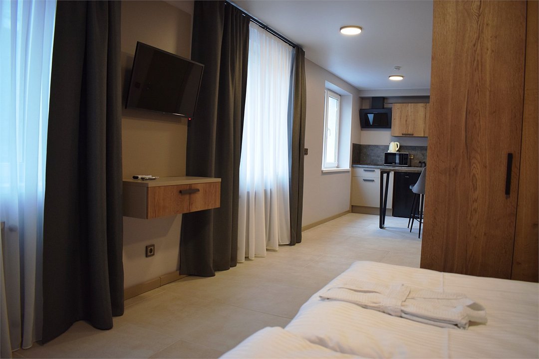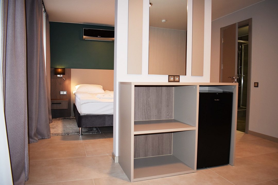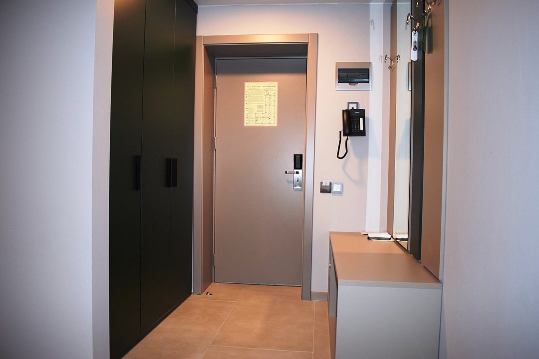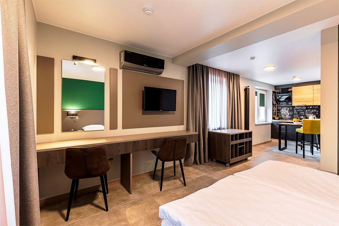 кабельное телевидение, Wi-Fi, холодильник, светильник, фен, электронные замки, плита для приготовления пищи, микроволновая печь, ванная комната, душевая кабина, халаты, банные полотенца, тапочки, гигиенические средства, косметические средства, кровать «King size», тумбы, стулья, шкаф для одежды, гардеробная, вешалки, обеденный стол, багажная тумба, зеркало, ковер, мебельный гарнитур, две комнаты, кухня, письменные принадлежности, набор посуды, сейф, чайник, унитаз, раковина, гостиная зона, отопление, душ, вид на город, кулер на этаже, плиточное покрытие, кресло, кухонная посуда, стаканы, кухонная утварь, столовые приборы, стул, туалетный столик, туалетные средства, туалет, сплит-система, раскладное кресло, внутренний телефон, телевизор с плоским экраном, кухонный уголок, москитная сетка, гостиничная парфюмерия, номер для некурящих, пуфик, можно с питомцамиВ гостиничном номере
