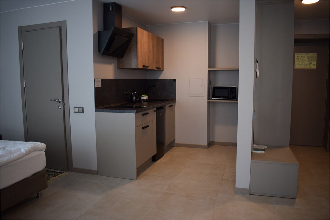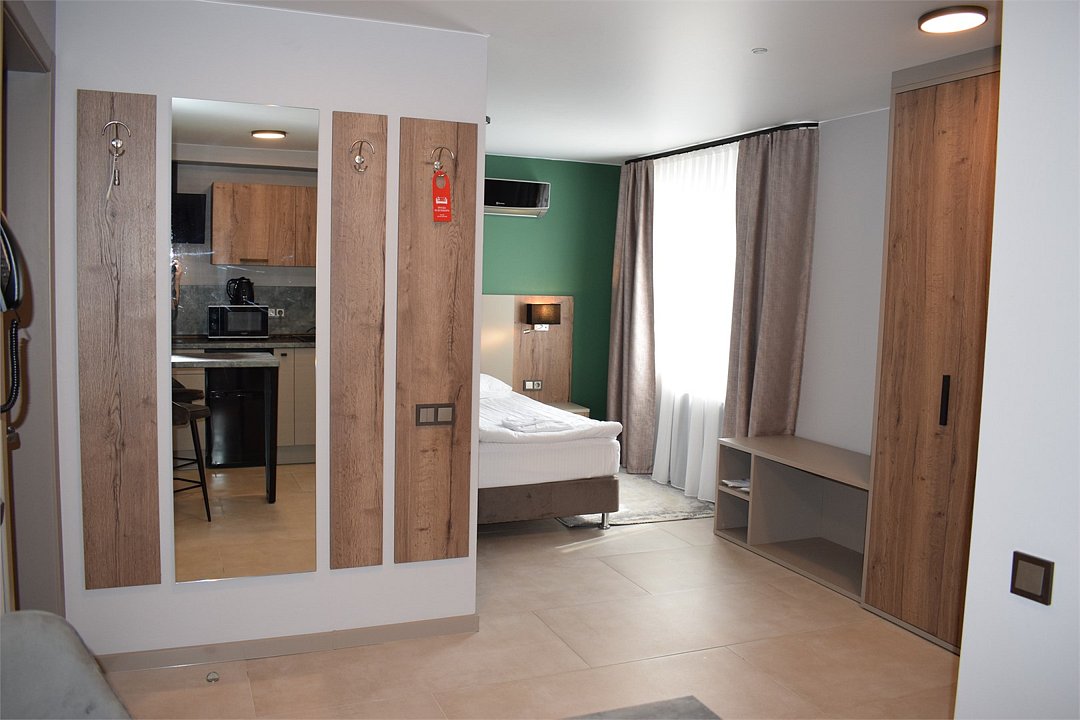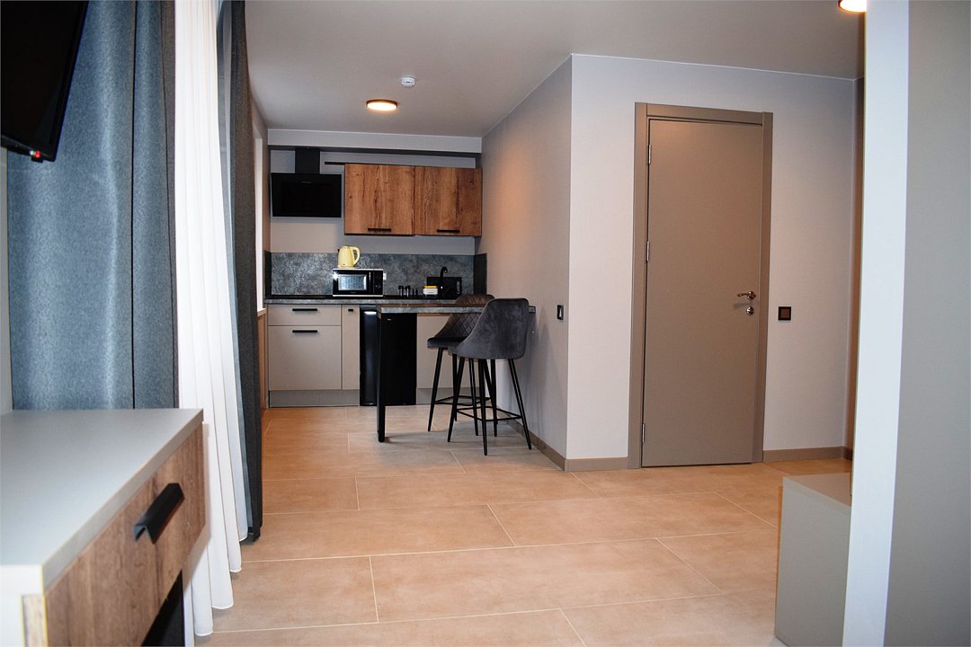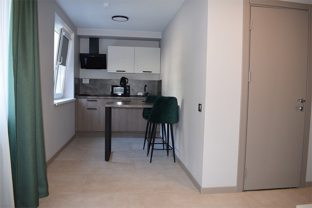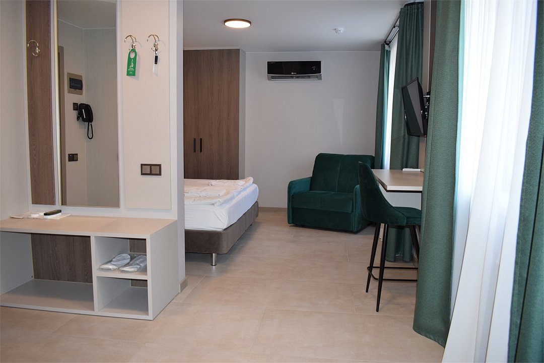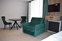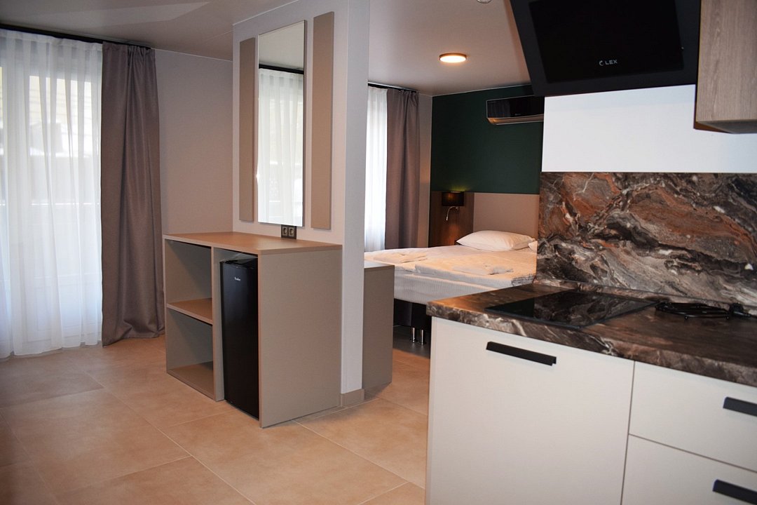 Уютный номер высшей категории студия плюс. Однокомнатный номер с собственным сан узлом, а так же оборудован полноценной обеденной зоной с кухонным уголком. Есть дополнительное место - раскладное кресло. Данный номер находится в Корпусе «Сочи» на 2 этаже. При регистрации заезда гражданам РФ необходимо предъявить оригинал общегражданского паспорта. При размещении с детьми в возрасте до 14 лет следует предоставить оригиналы их свидетельства о рождении. Гостям в возрасте до 18 лет следует иметь при себе письменное согласие от одного из родителей на проживание в отеле (при размещении без родителей). Иностранным гражданам необходимо предъявить иностранный паспорт, визу и миграционную карту. Обратите внимание: При заселении в номера высшей категории (студии, апартаменты) взимается обеспечительный платеж (страховой залог) в размере 5000 рублей наличными или банковской картой. Эта сумма возвращается в день регистрации отъезда тем же способом, каким она была списана после проверки состояния номера.Услуги и удобства