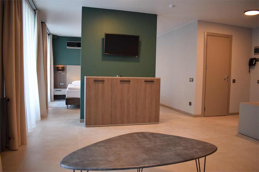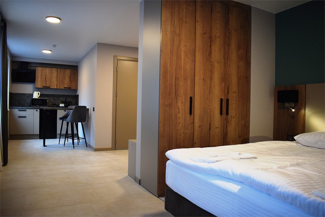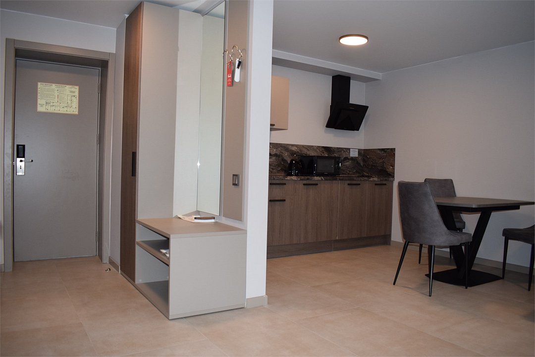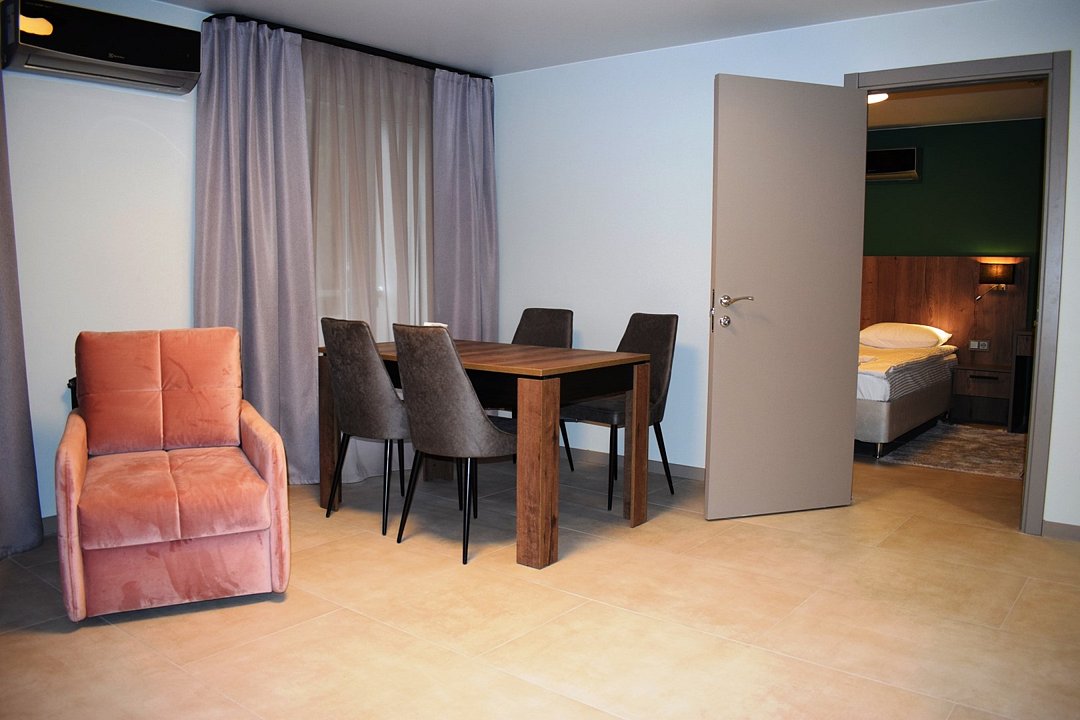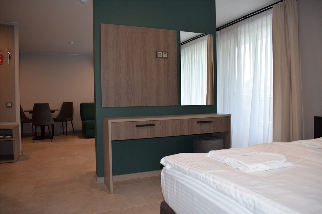Номер высшей категории апартаменты с одной спальней и собственным сан узлом, а так же гостиной с полноценной кухонной зоной. Данный номер подойдет как для комфортного семейного отдыха, так и для деловой поездки. Есть дополнительное место - раскладное кресло. Данный номер находится в Корпусе «Сочи» на 2 этаже. При регистрации заезда гражданам РФ необходимо предъявить оригинал общегражданского паспорта. При размещении с детьми в возрасте до 14 лет следует предоставить оригиналы их свидетельства о рождении. Гостям в возрасте до 18 лет следует иметь при себе письменное согласие от одного из родителей на проживание в отеле (при размещении без родителей). Иностранным гражданам необходимо предъявить иностранный паспорт, визу и миграционную карту. Обратите внимание: При заселении в номера высшей категории (студии, апартаменты) взимается обеспечительный платеж (страховой залог) в размере 5000 рублей наличными или банковской картой. Эта сумма возвращается в день регистрации отъезда тем же способом, каким она была списана после проверки состояния номера.Услуги и удобства