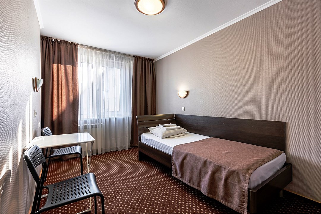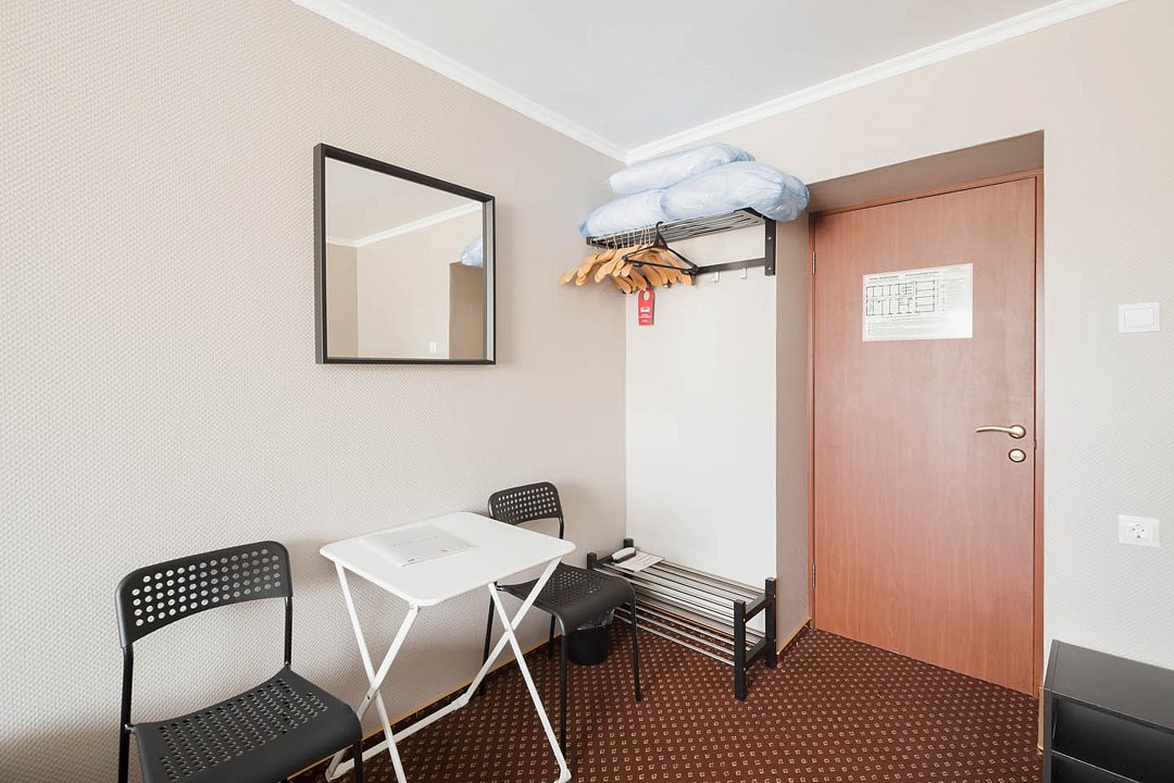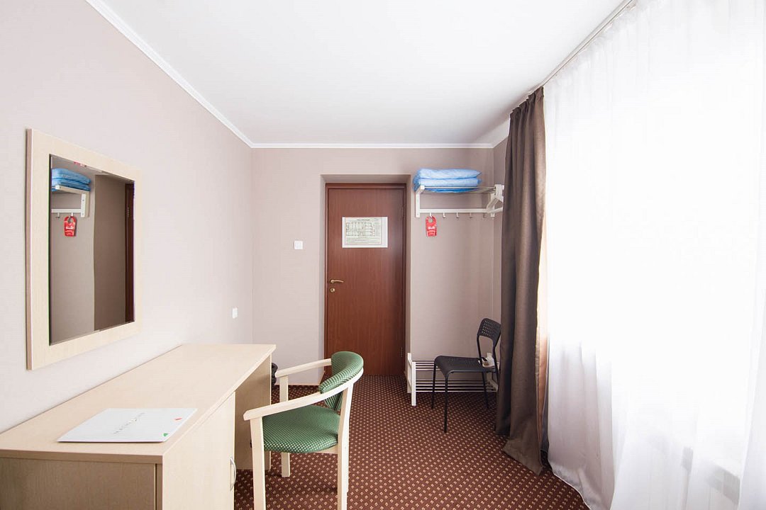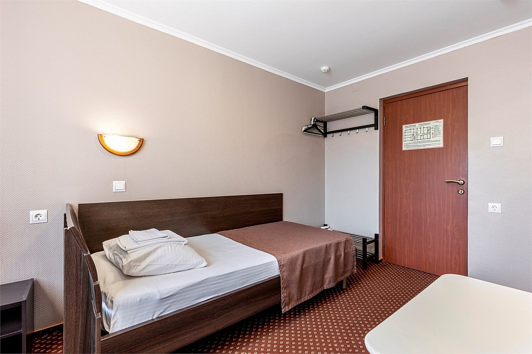 Wi-Fi, вентилятор, гигиенические средства, односпальная кровать, вешалки, зеркало, ковровое покрытие, отопление, вид на город, кулер на этаже, стул, стол, тумба, санузел на этаже, душ на этаже, без питомцевВ гостиничном номере