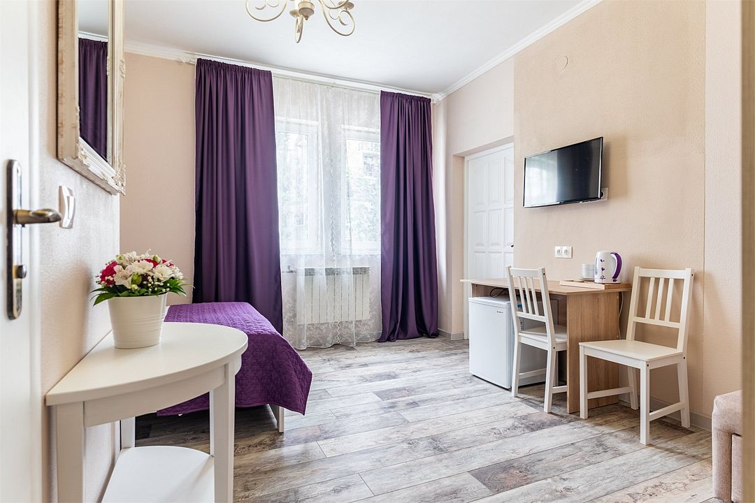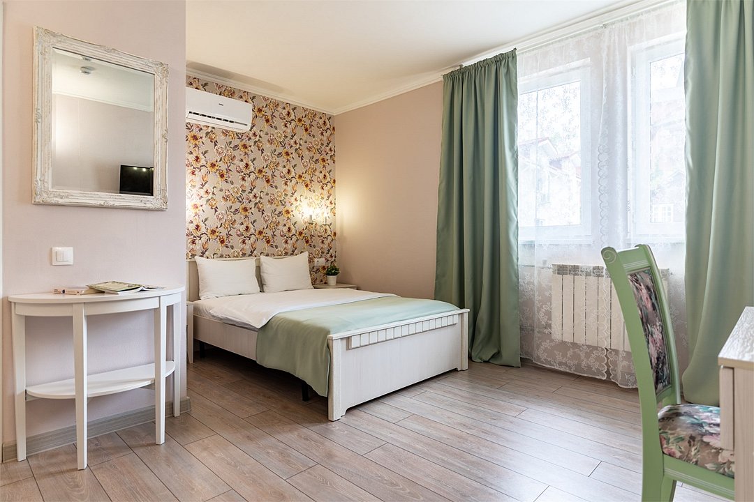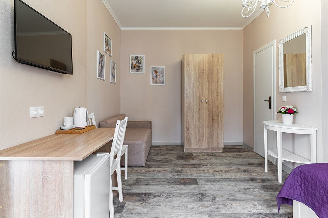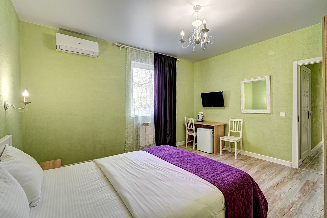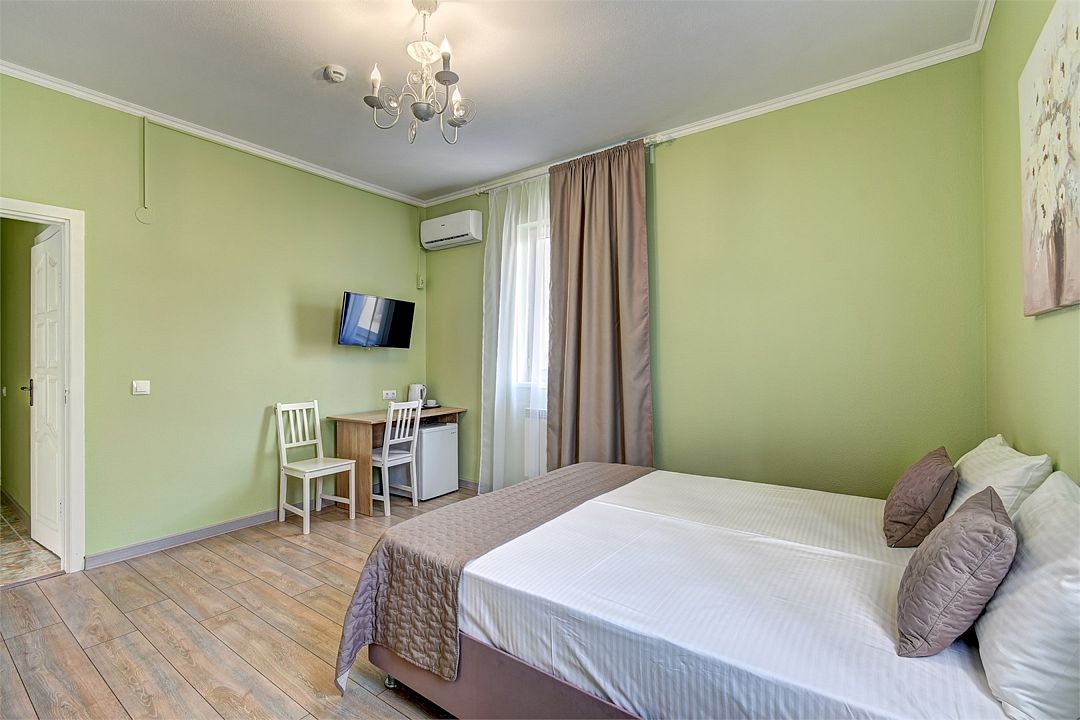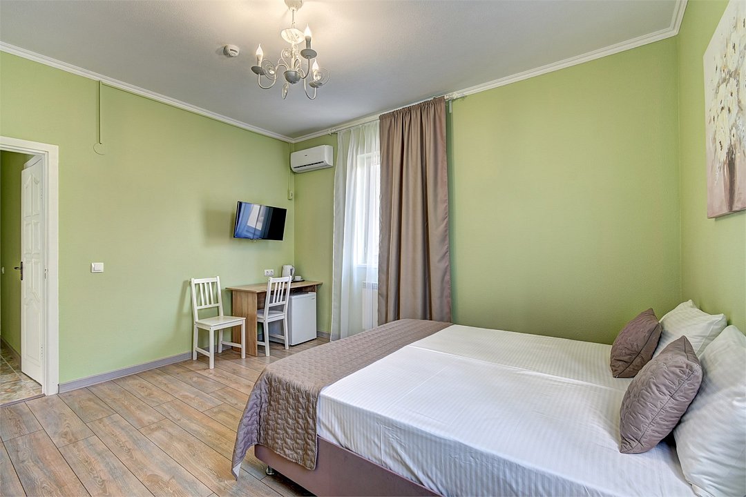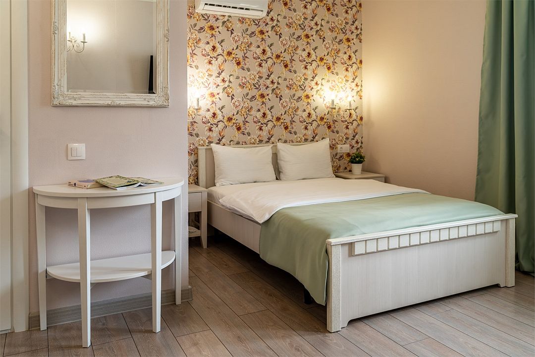 Улучшенный однокомнатный номер максимальной комплектации в стиле "Прованс". В каждом номере двуспальная кровать или две односпальные, кондиционер, холодильник, ТВ, чайная станция. Оптимальное решение для комфортного южного отдыха и полноценной работы.Услуги и удобства
