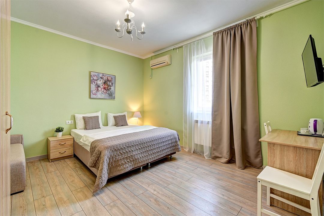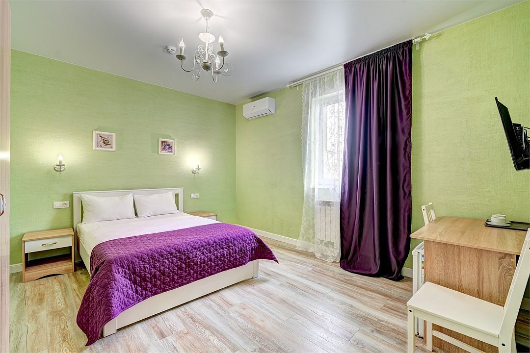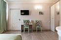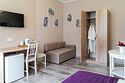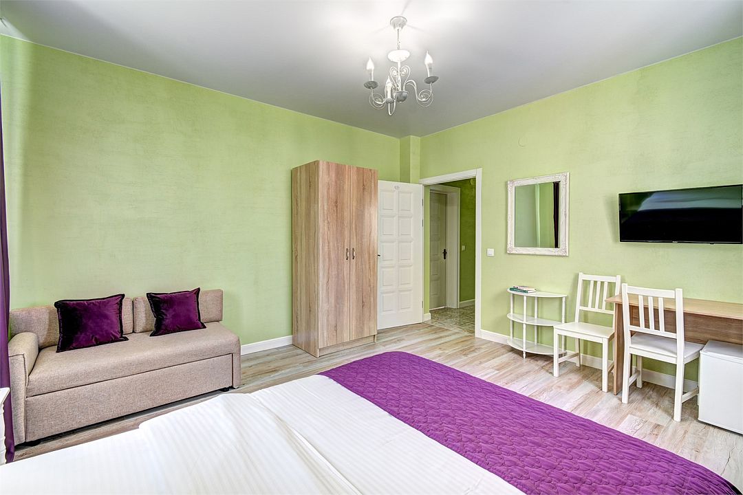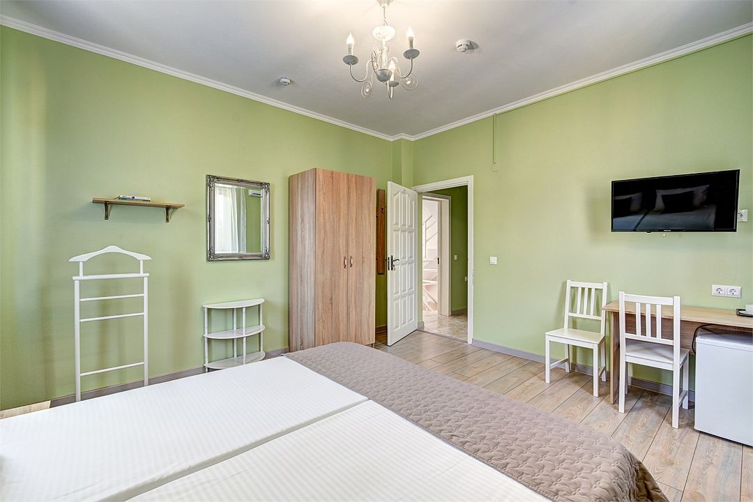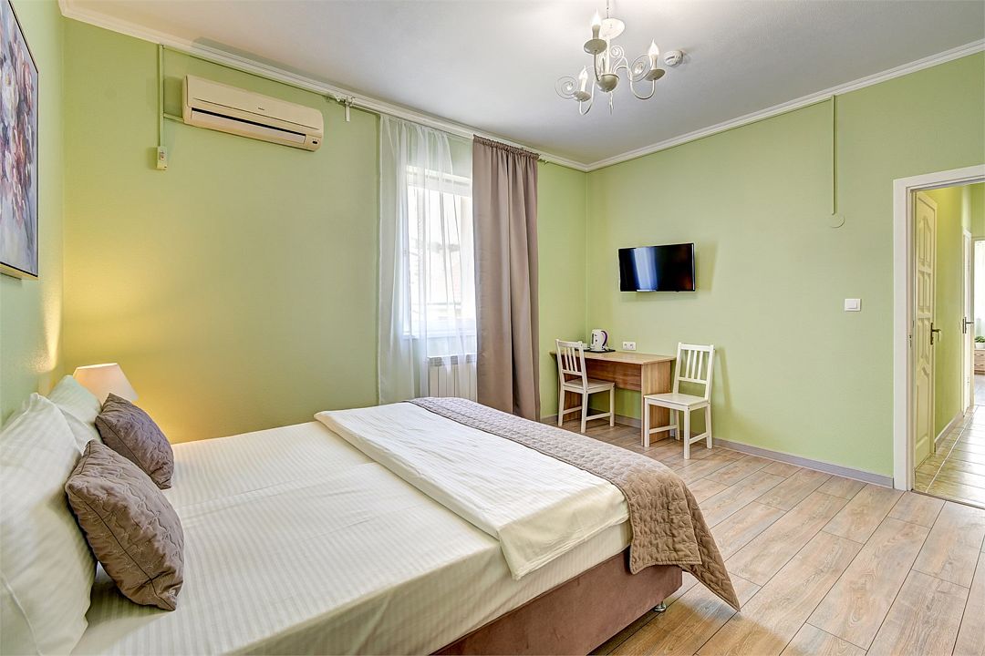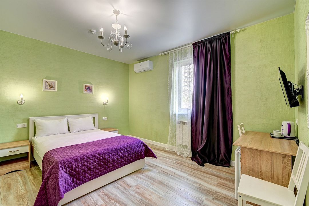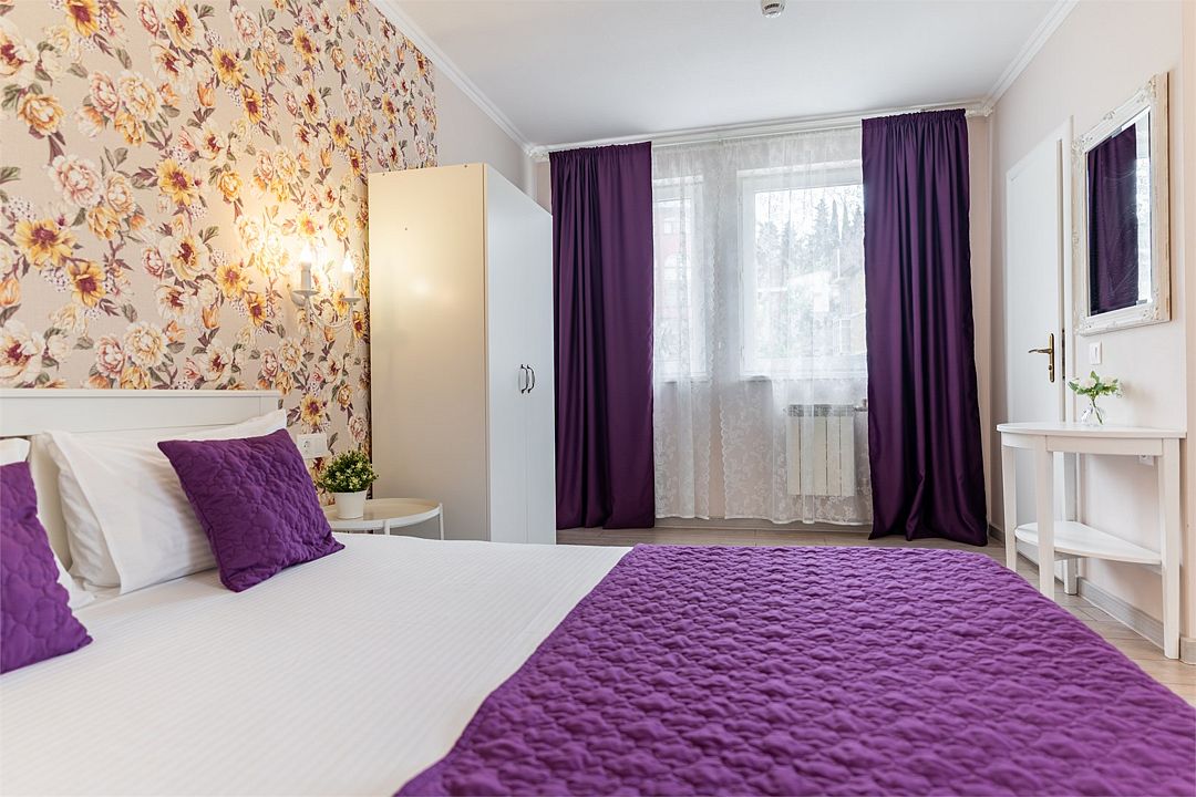 Улучшенный однокомнатный номер максимальной комплектации в стиле "Прованс". В каждом номере двуспальная кровать или две односпальные, кондиционер, холодильник, ТВ, чайная станция. Оптимальное решение для комфортного южного отдыха и полноценной работы.Услуги и удобства